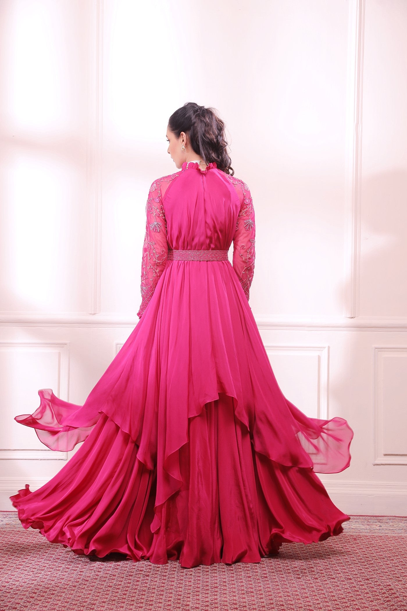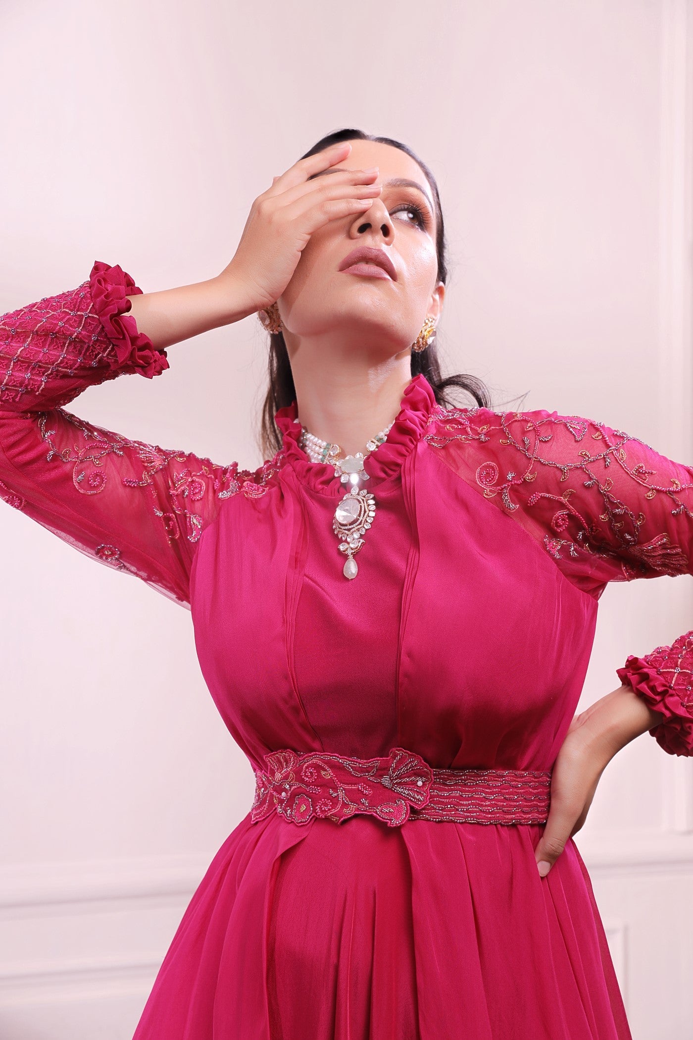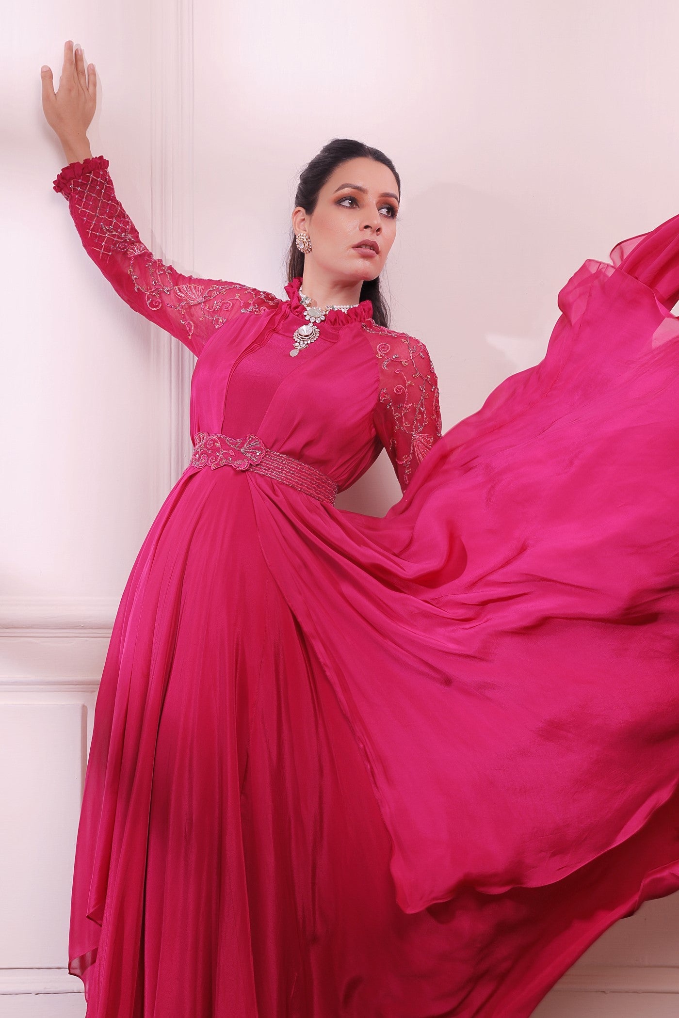 Fein geraffte Passe mit Bischofsärmeln aus Organza und fließendem Georgette-Falten verleihen dem Jumpsuit den nötigen Charme. Praktischerweise verfügt er über eine Tasche.