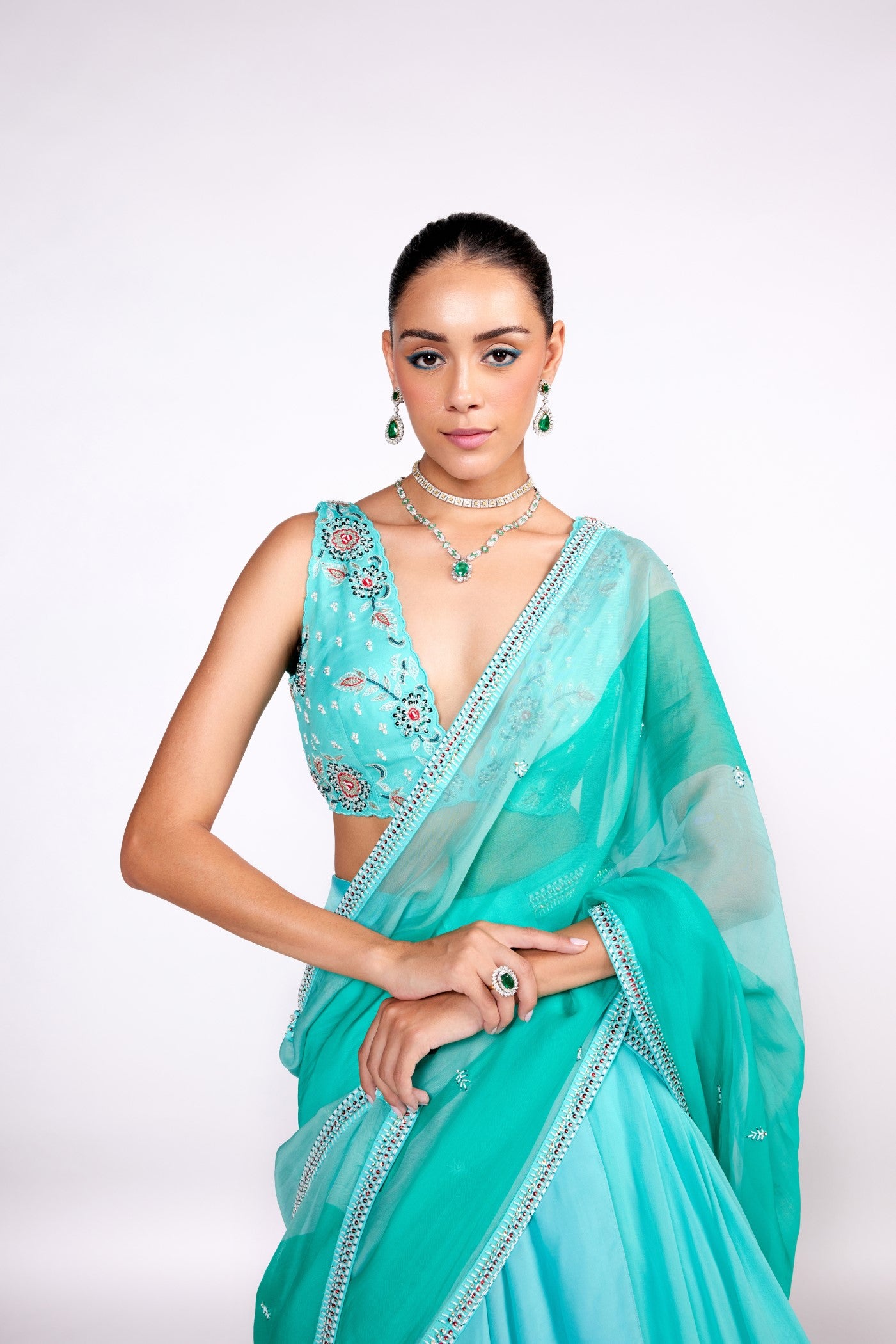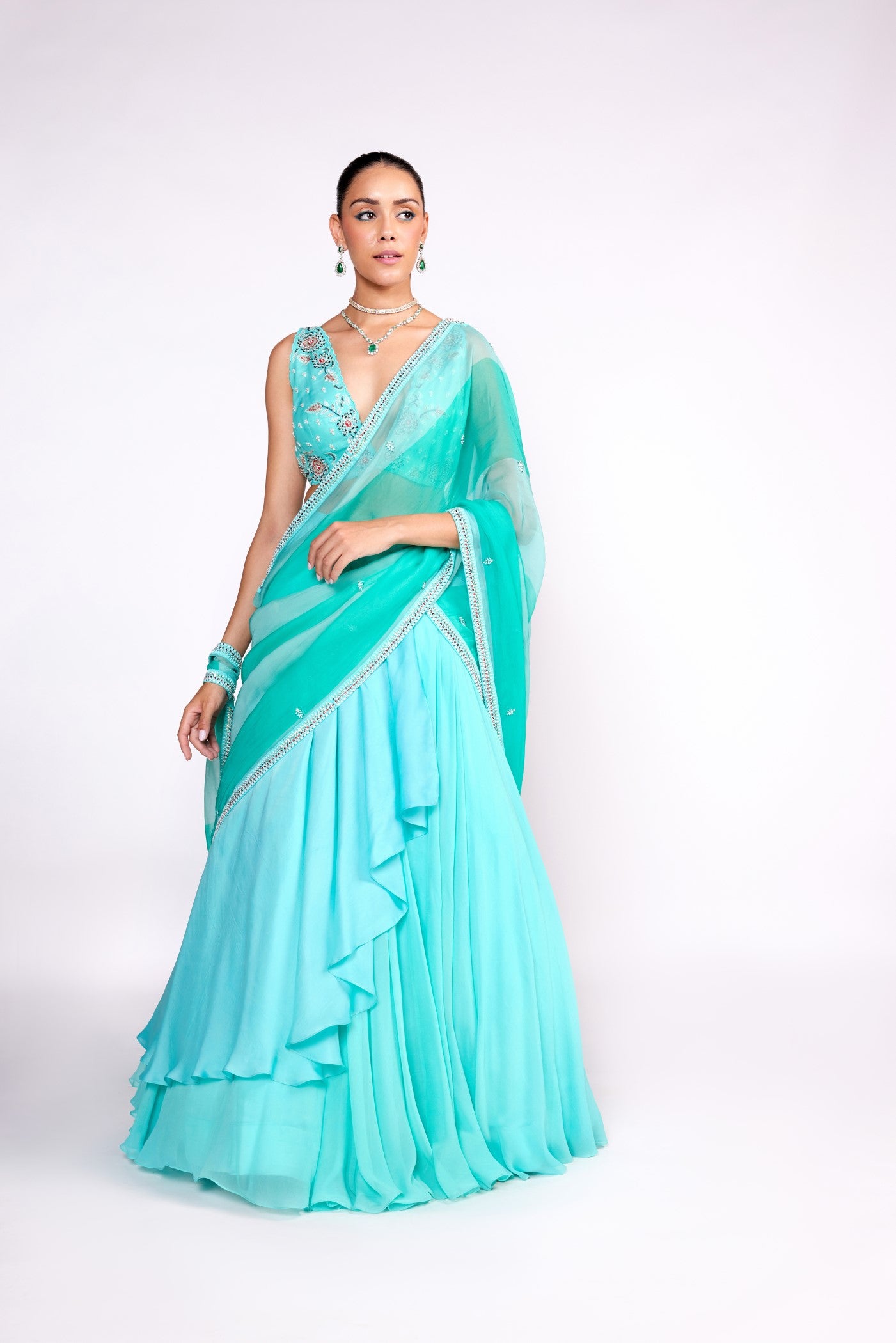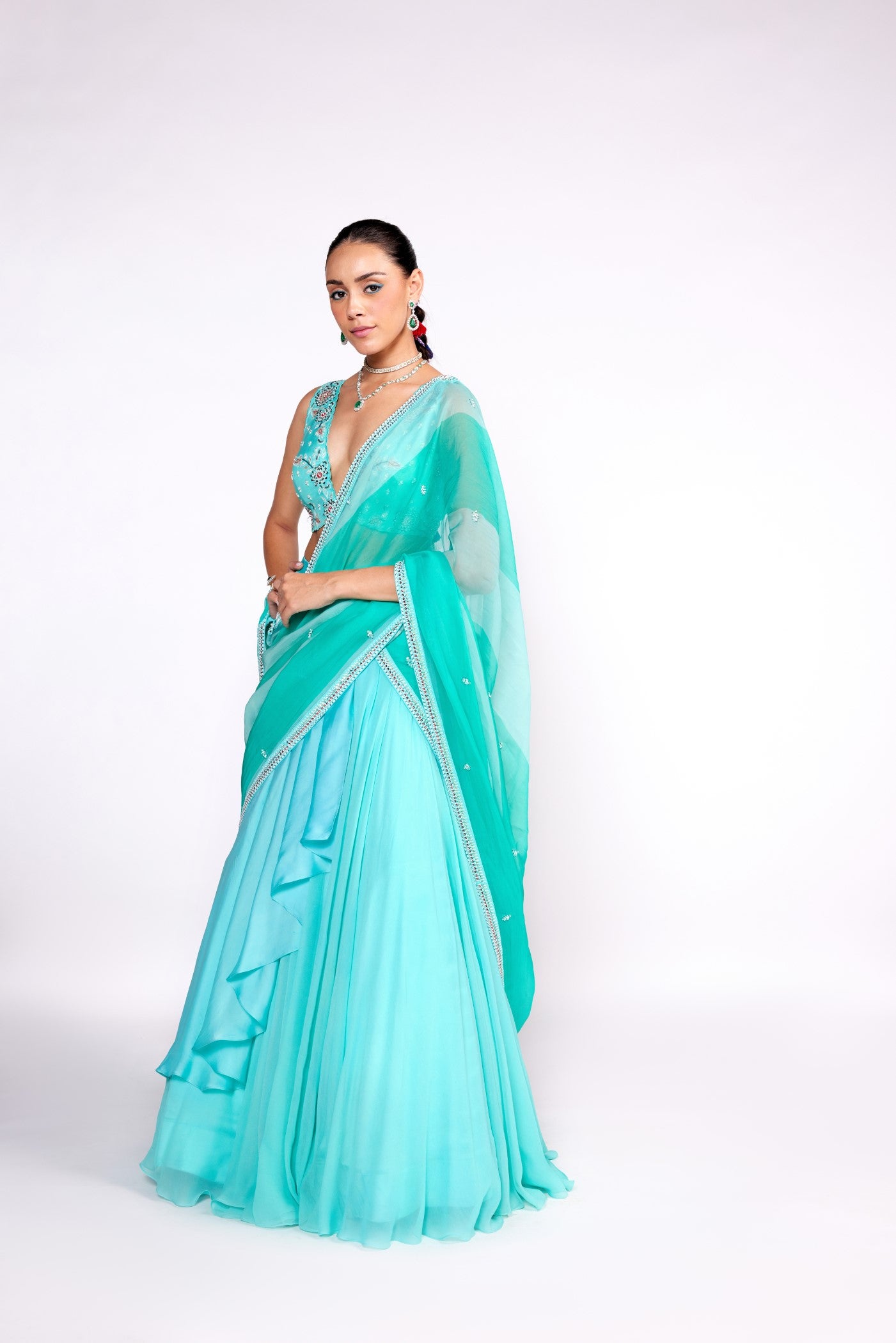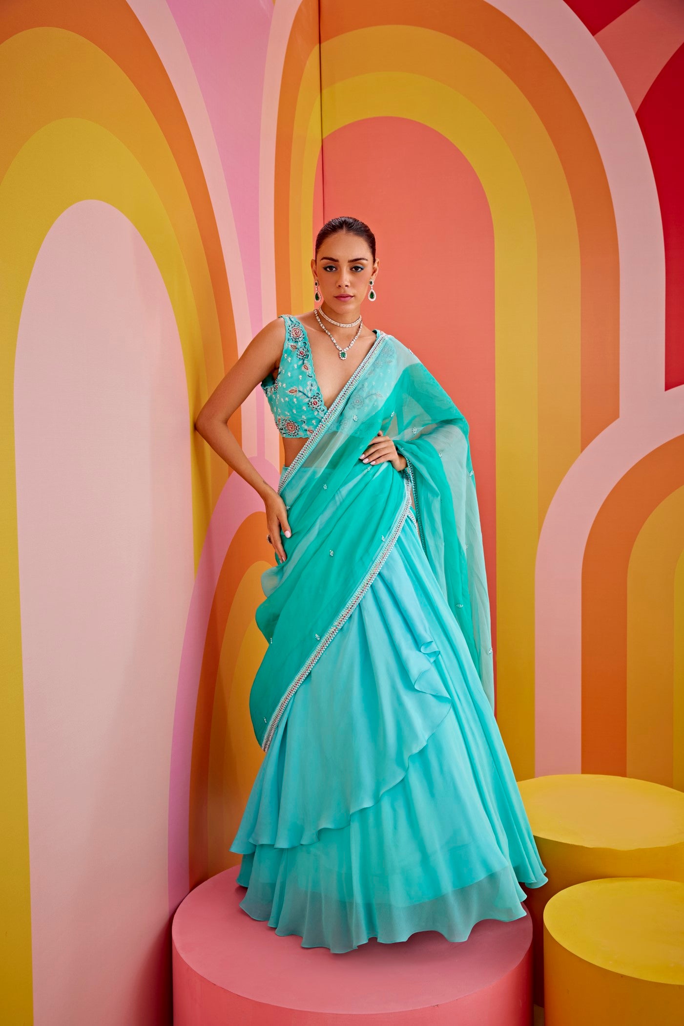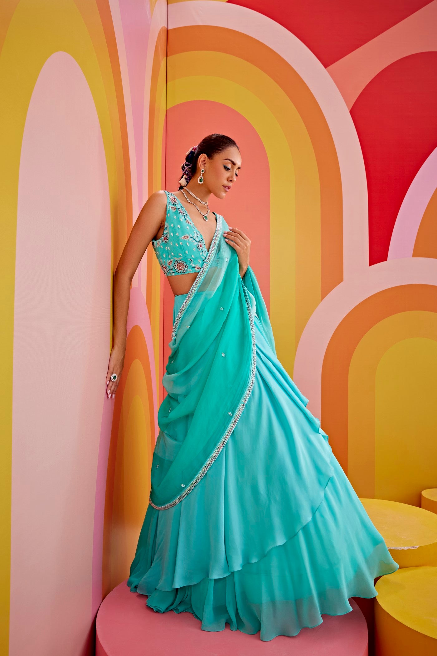 Hier ist ein aquagrüner Lehenga-Sari aus Georgette und Satinorganza. Dazu passt eine bestickte Bluse aus Georgette. Das Set enthält einen abnehmbaren, bestickten Dupatta-Vorhang in Farbblockoptik.