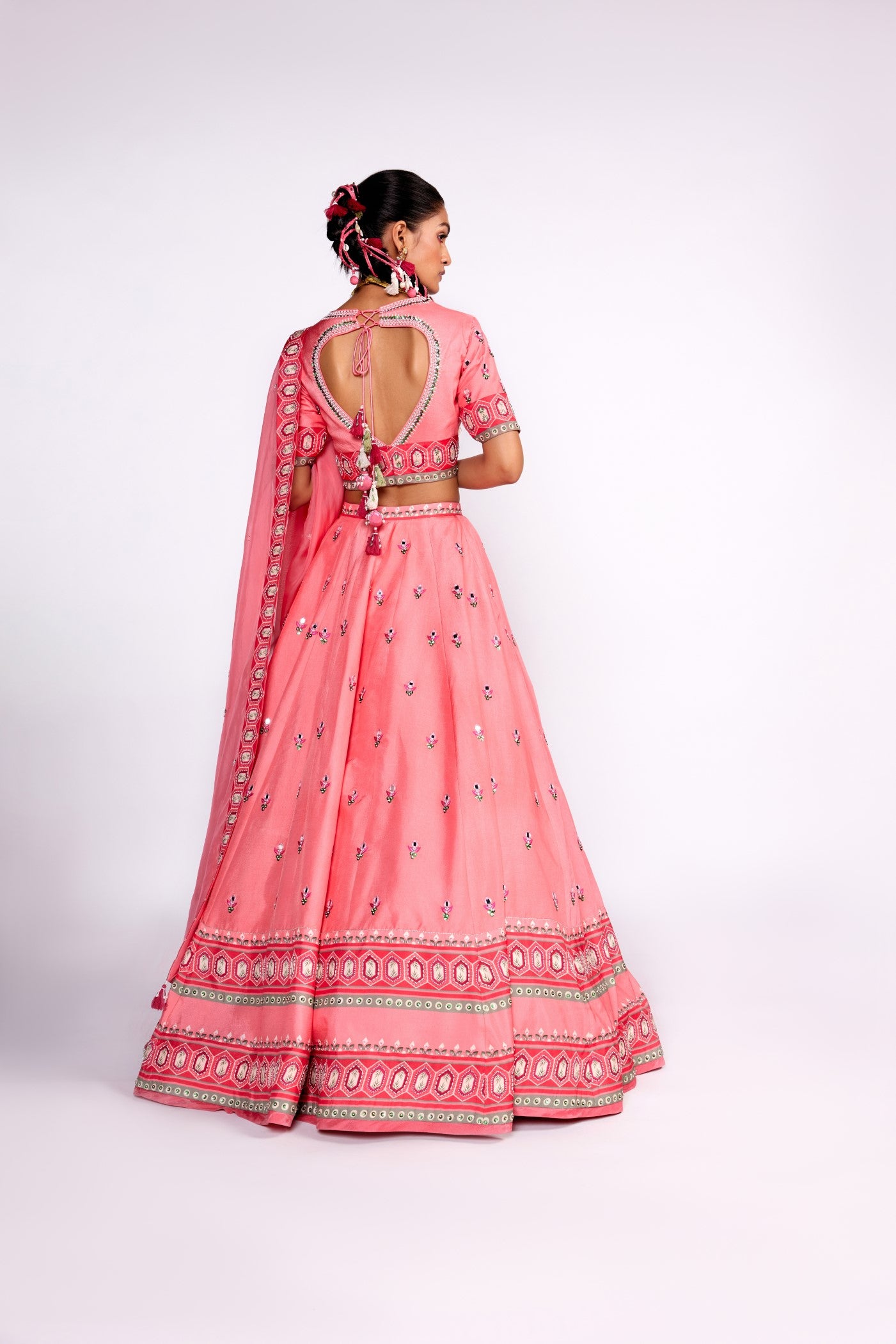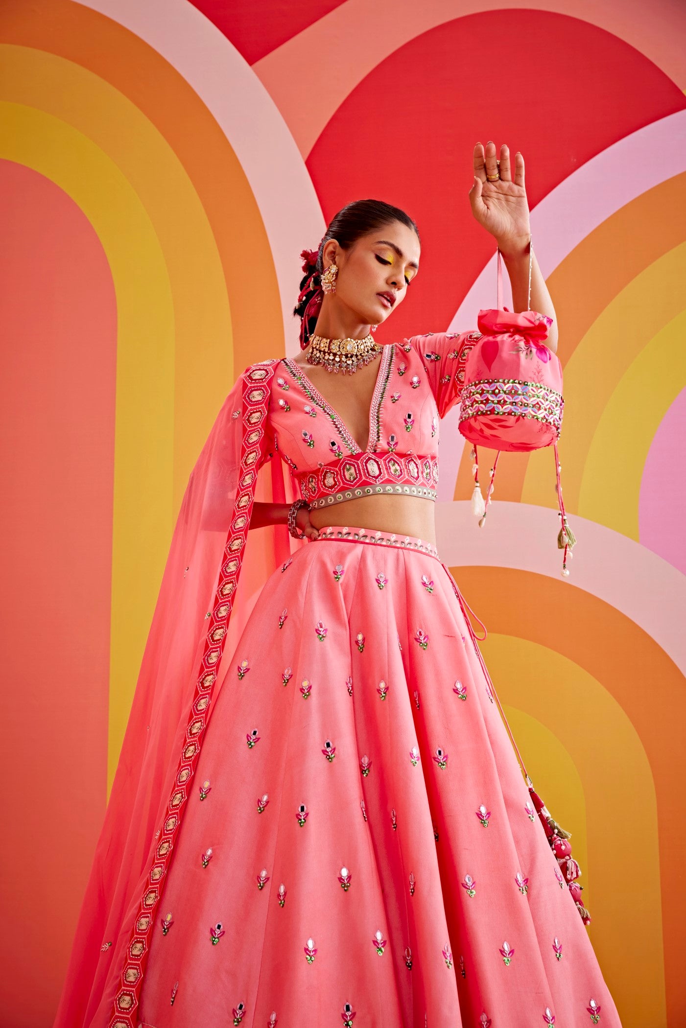 Dieses Set besteht aus einem rosa bedruckten und bestickten Kalidaar Lehenga aus Seide. Dazu passt eine bestickte Bluse aus Seide und ein bestickter Organza-Dupatta rundet den Look ab.