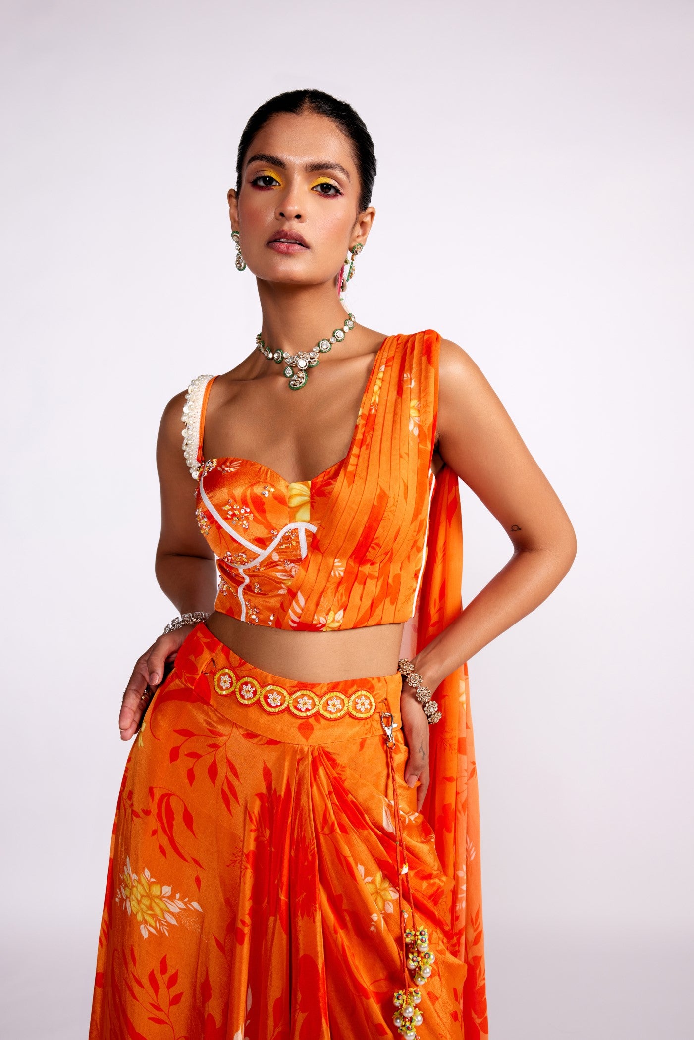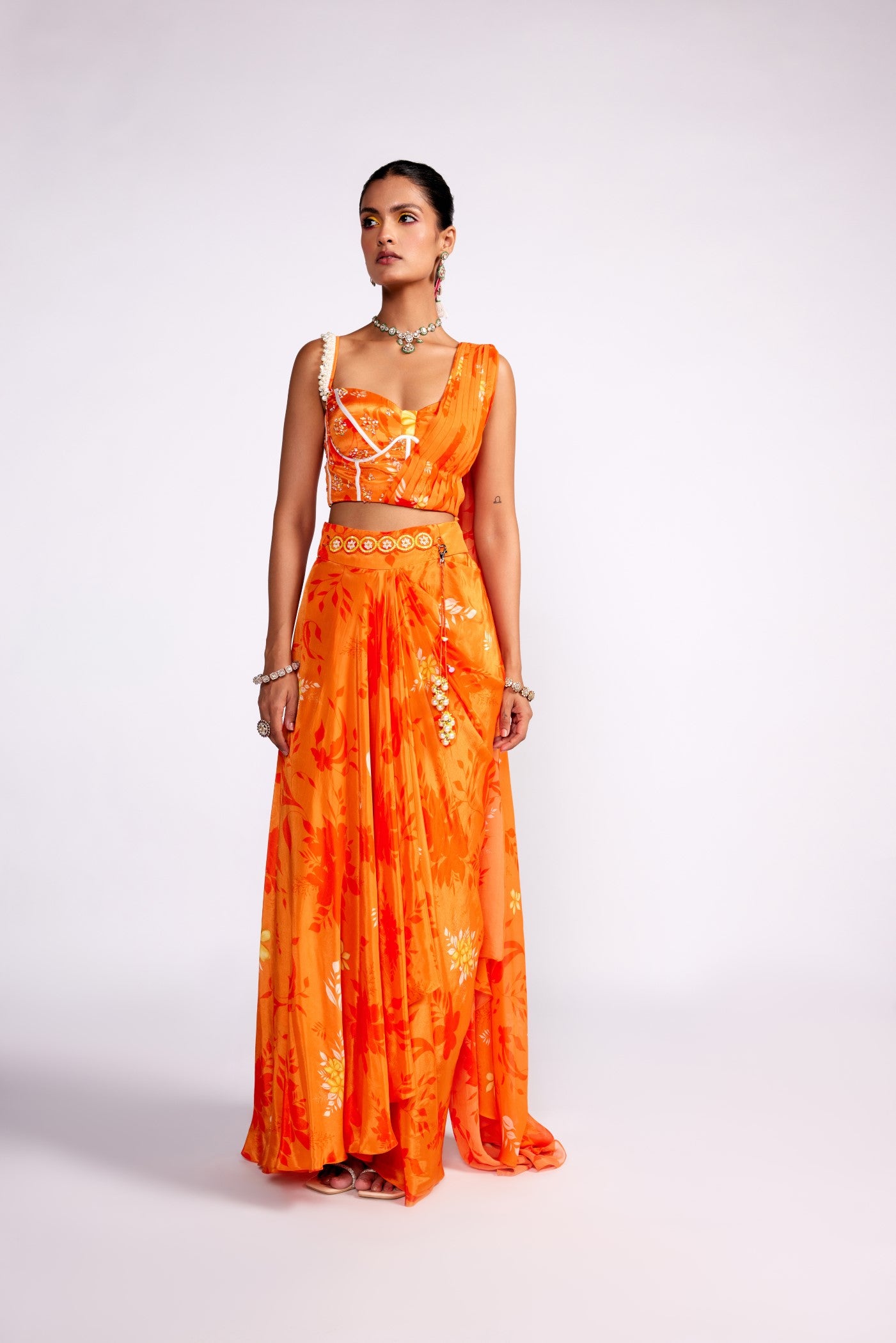 Hier sehen Sie einen bedruckten Drapierungsrock aus Krepp, kombiniert mit einem verzierten Drapierungsbustier. Der Rock verfügt über einen mit Cutdana besetzten Gürtel und einen abnehmbaren Schlüsselanhänger.