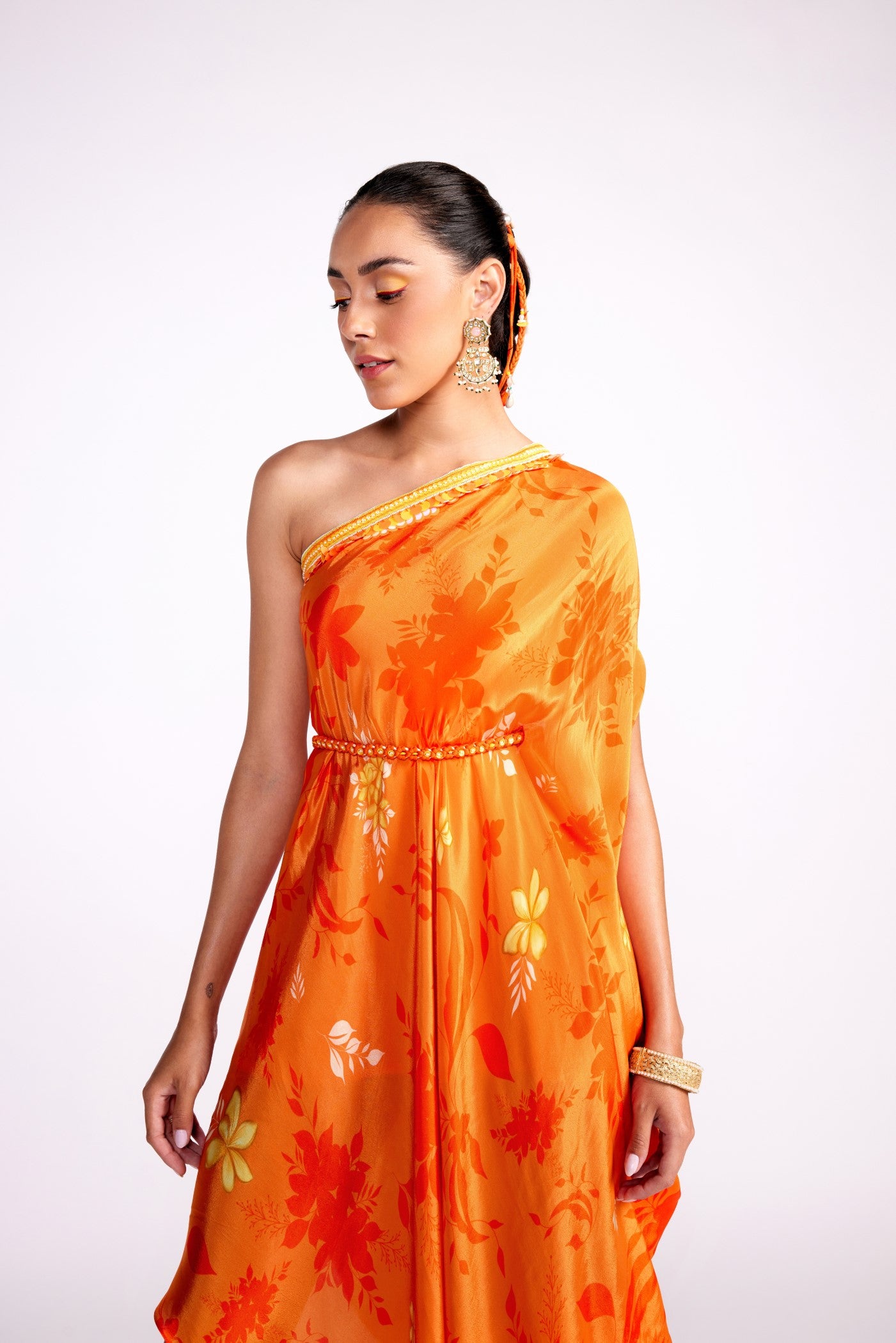 Hier sehen Sie ein orange bedrucktes One-Shoulder-Kaftan-Set mit einem verzierten Makramee-Gürtel in freier Größe. Der Kaftan hat einen verzierten Ausschnitt für ein wenig Bling