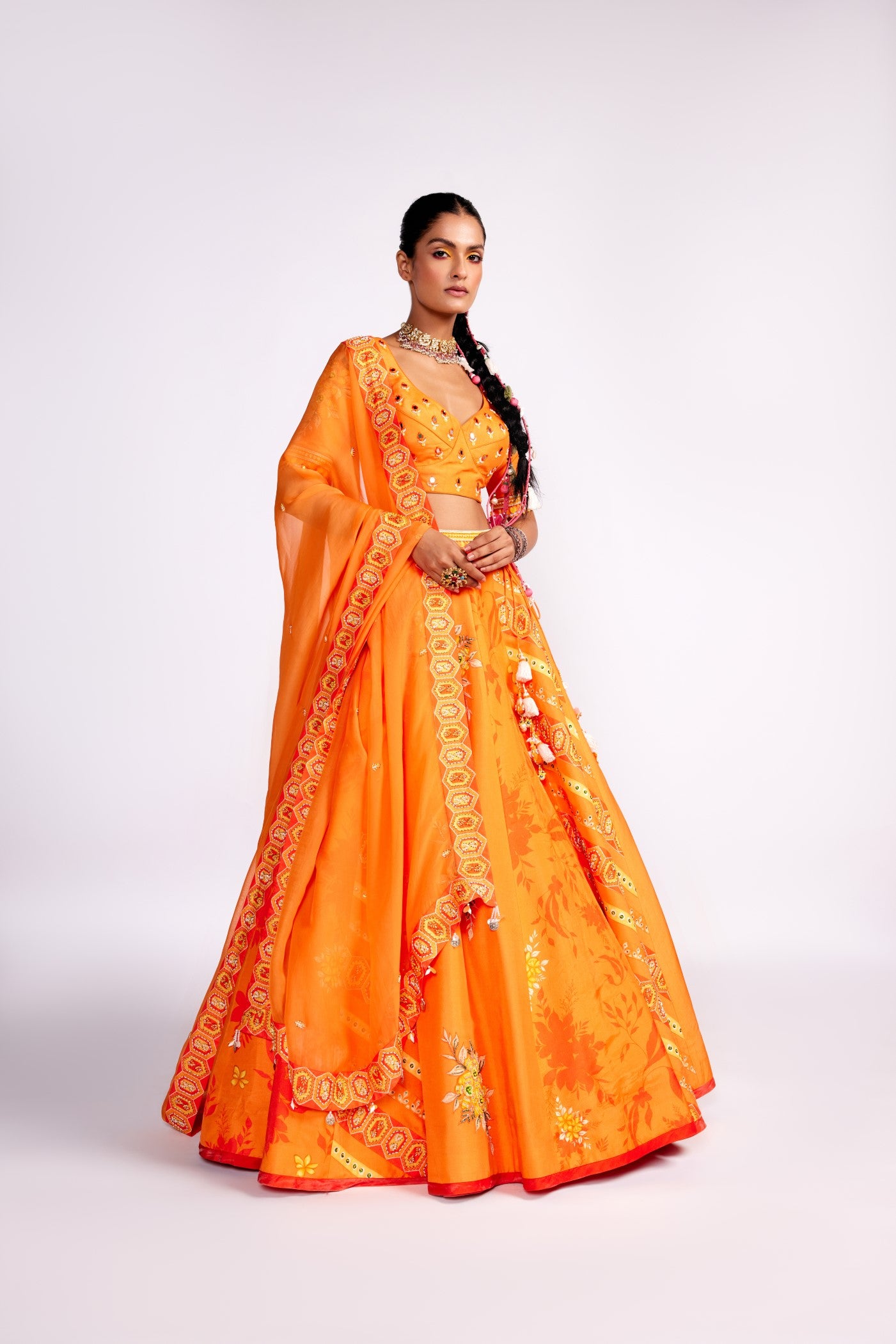 Mandarinenoranges bedrucktes und besticktes Lehenga-Set aus Seide