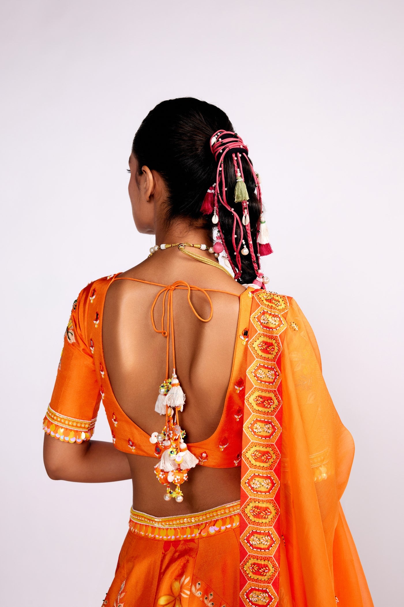 Hier ist ein orangefarbener Kalidar Lehenga aus Seide zu sehen. Er ist mit Cutdana, Perlenstickerei und dreidimensionalen Blumen verziert. Dazu gibt es eine bestickte Bluse und einen Organza-Dupatta. Nicht zu vergessen die kleinen Vögel, die dem handgefertigten Latkan auf dem Lehenga und der Rückseite der Bluse einen besonderen Charme verleihen.