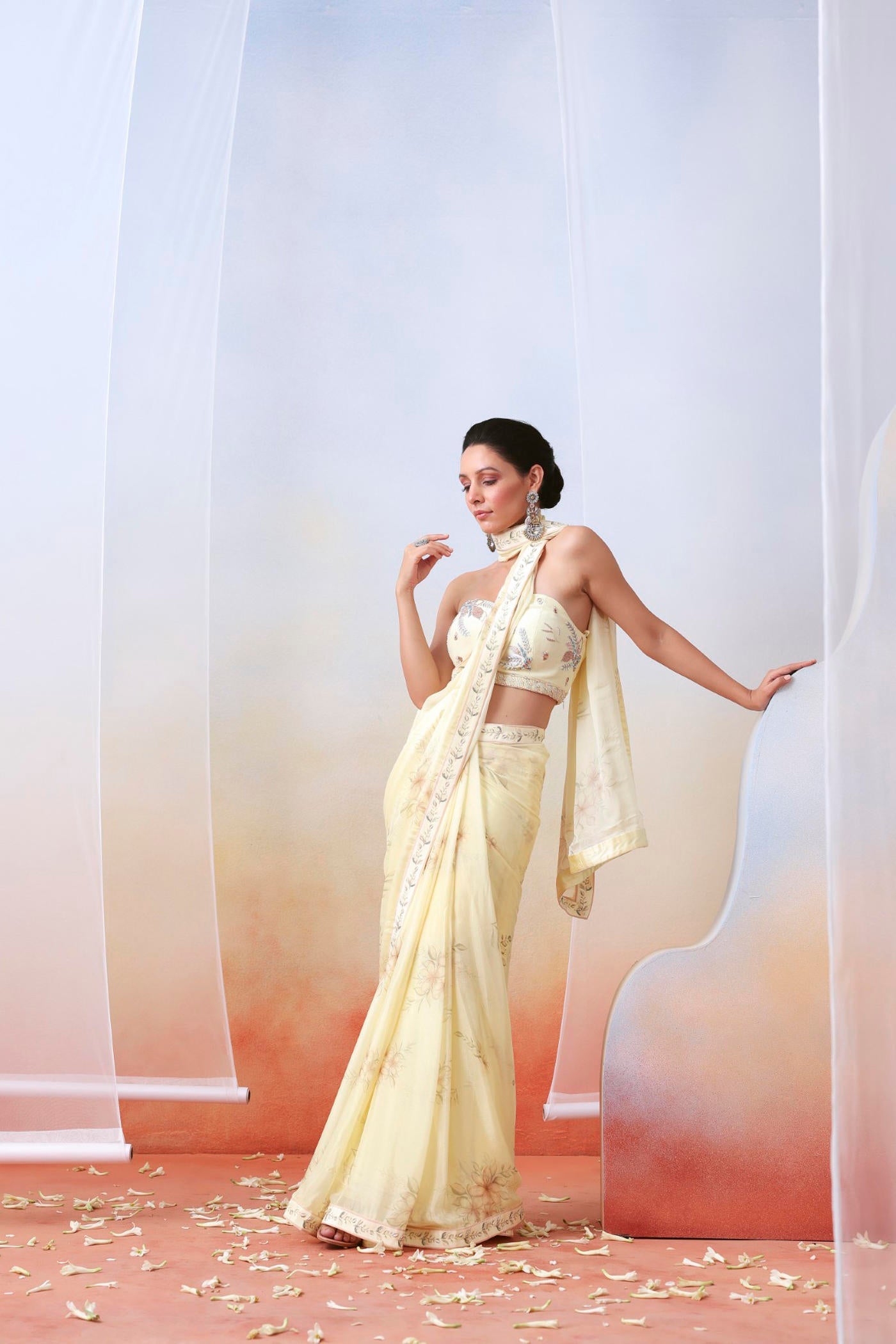 Hier sehen Sie einen cremefarbenen bedruckten Chiffon-Sari mit bestickten Rändern. Dazu passt ein Bustier mit Spiegelstickerei und Zardozi-Stickerei. Das Set enthält einen passenden Unterrock.