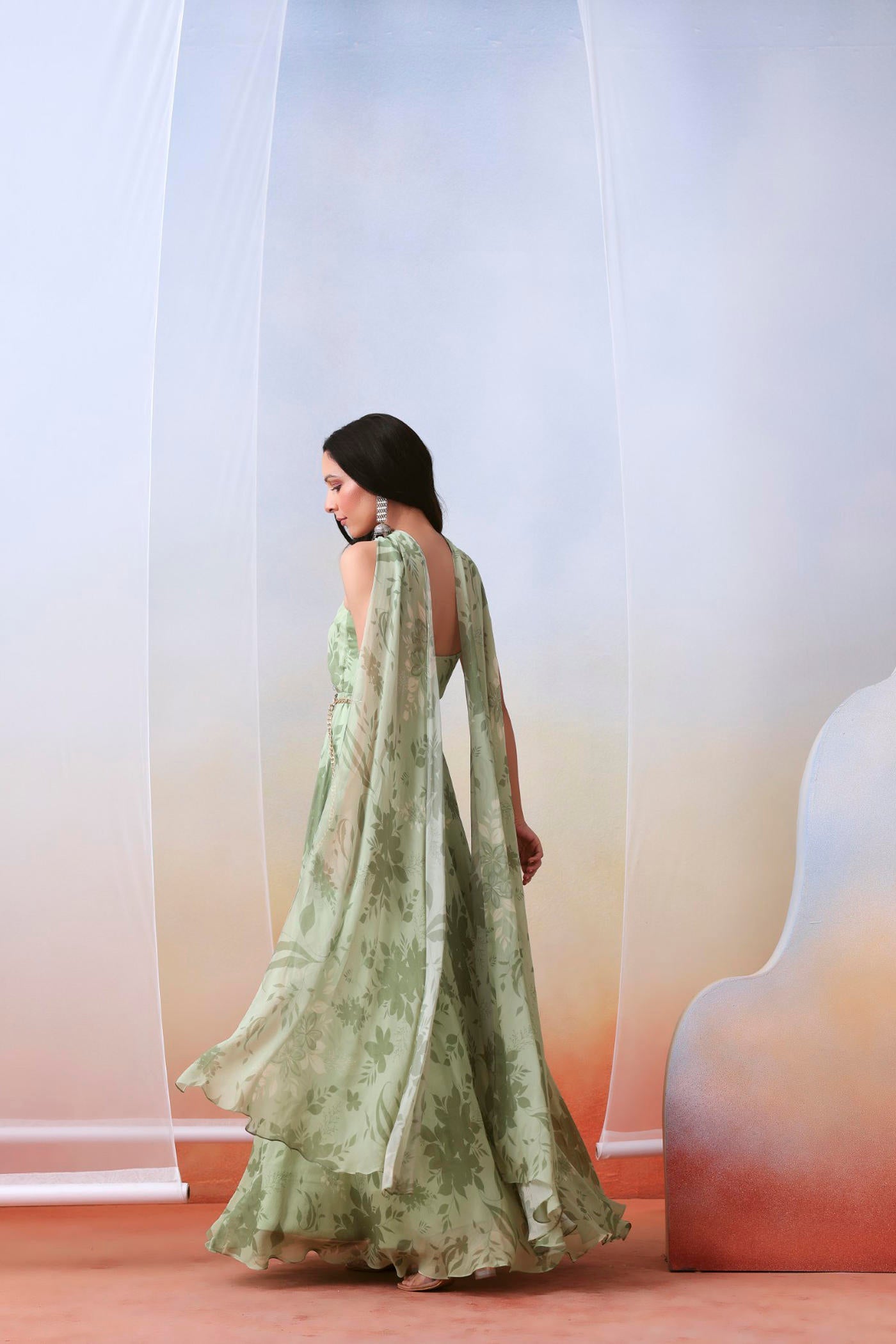 Salbeigrünes bedrucktes drapiertes Anarkali-Set