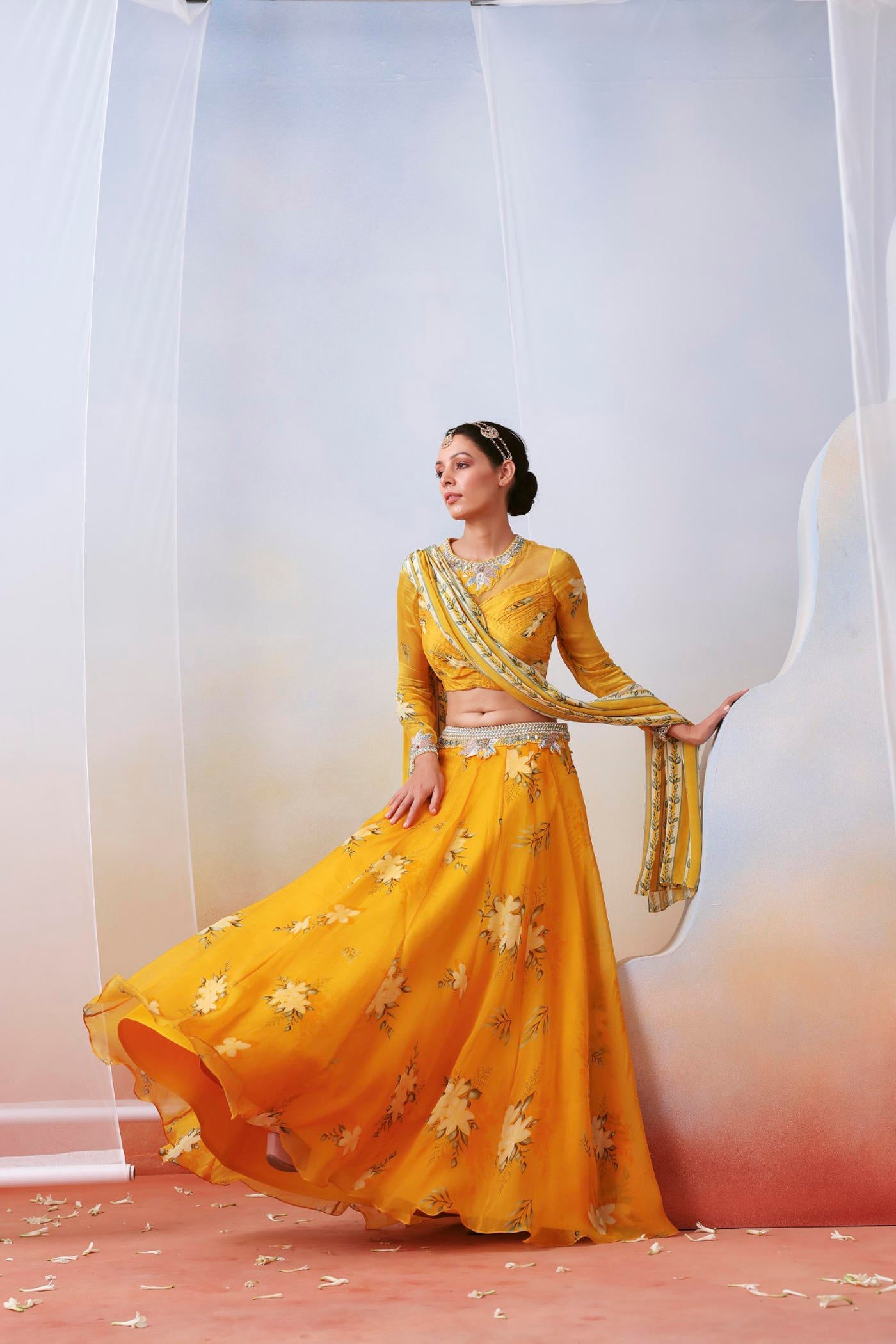 Hier sehen Sie einen gelb bedruckten Lehenga aus Organza. Dazu passt eine gerüschte und bestickte Chiffonbluse. Das Set enthält einen drapierten Dupatta.