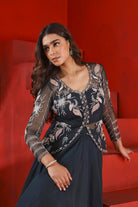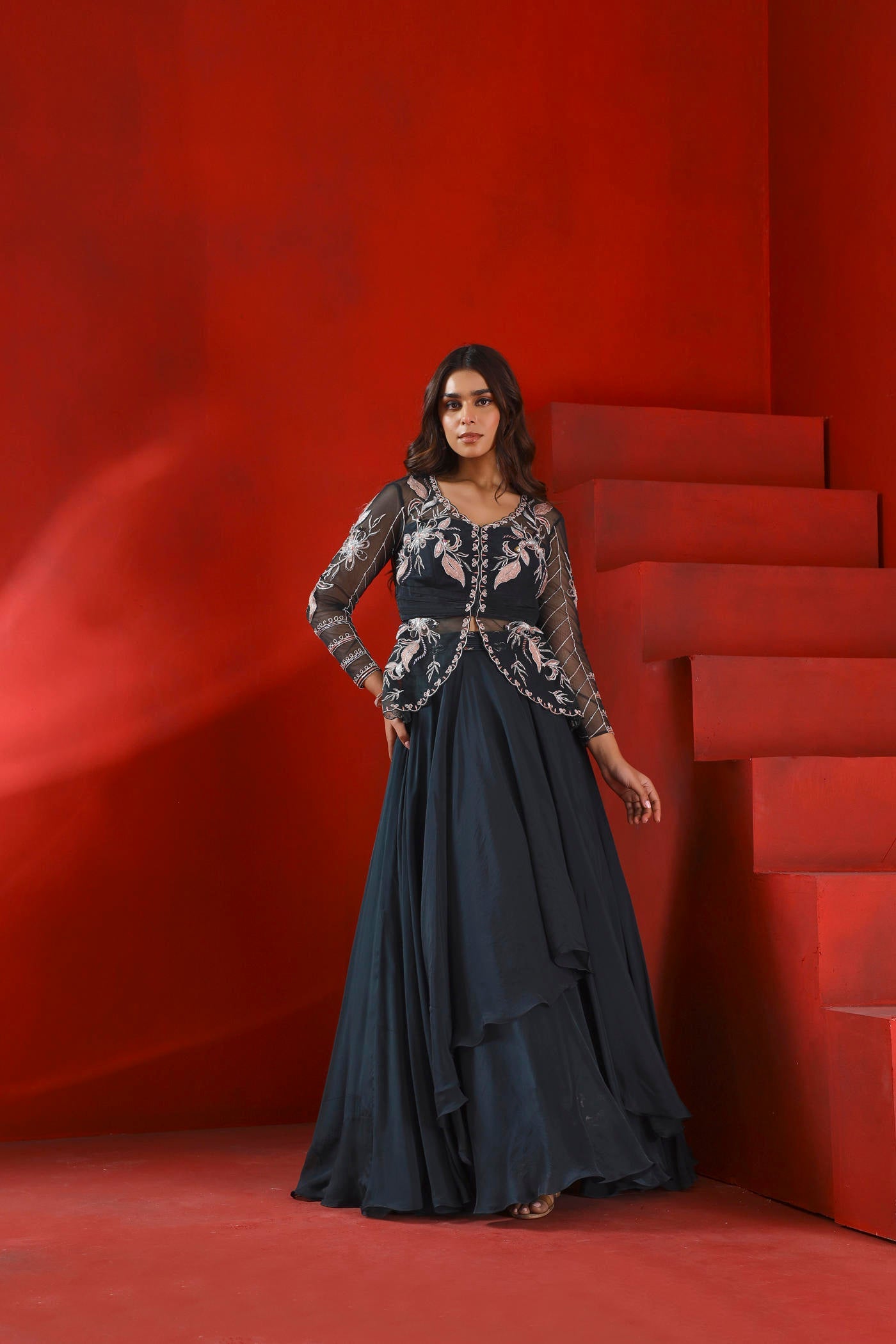 Hier ist eine mitternachtsgrüne bestickte Schößchenjacke aus Netzstoff zu sehen. Dazu passt ein mehrlagiger Lehenga aus Organza und Seide.