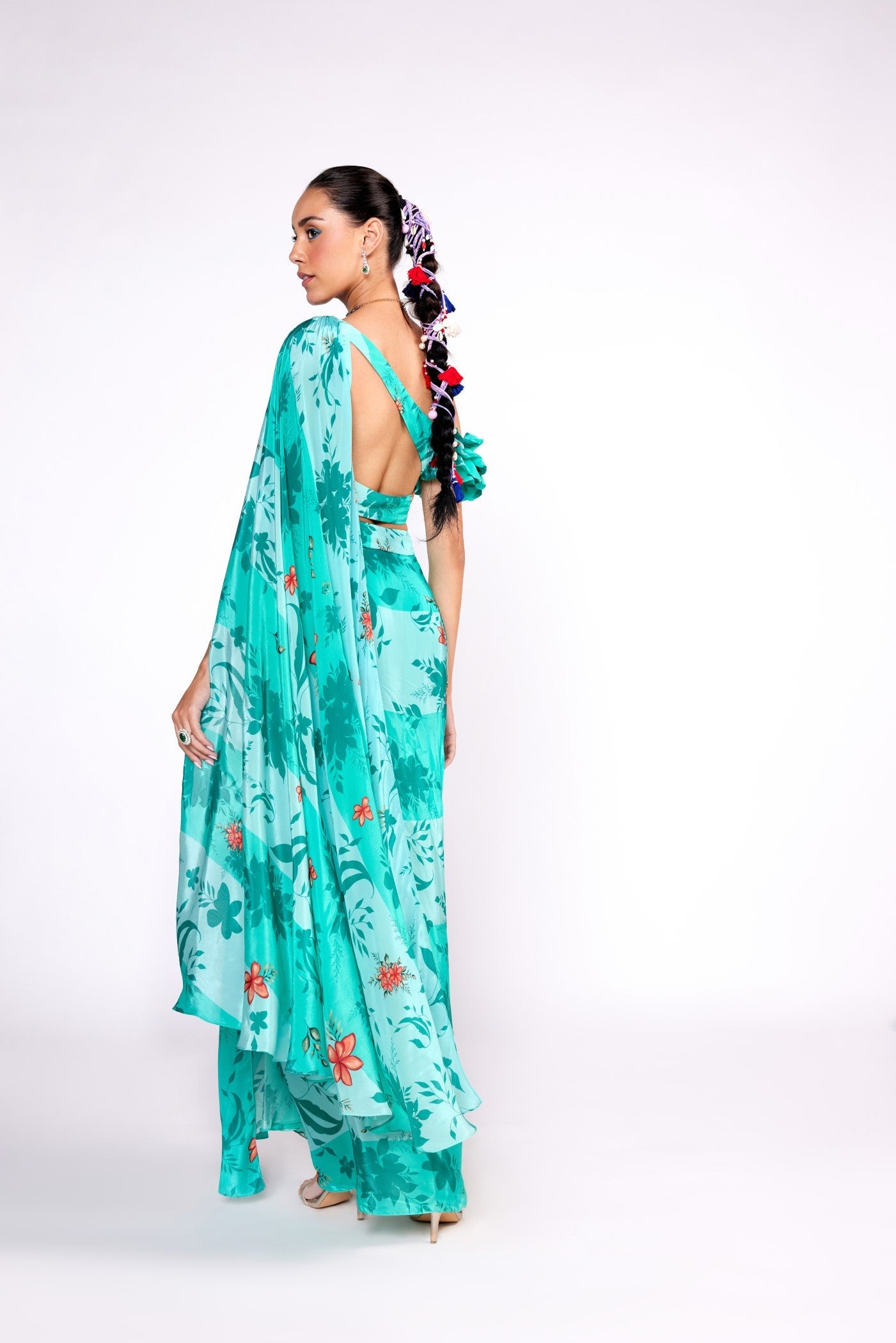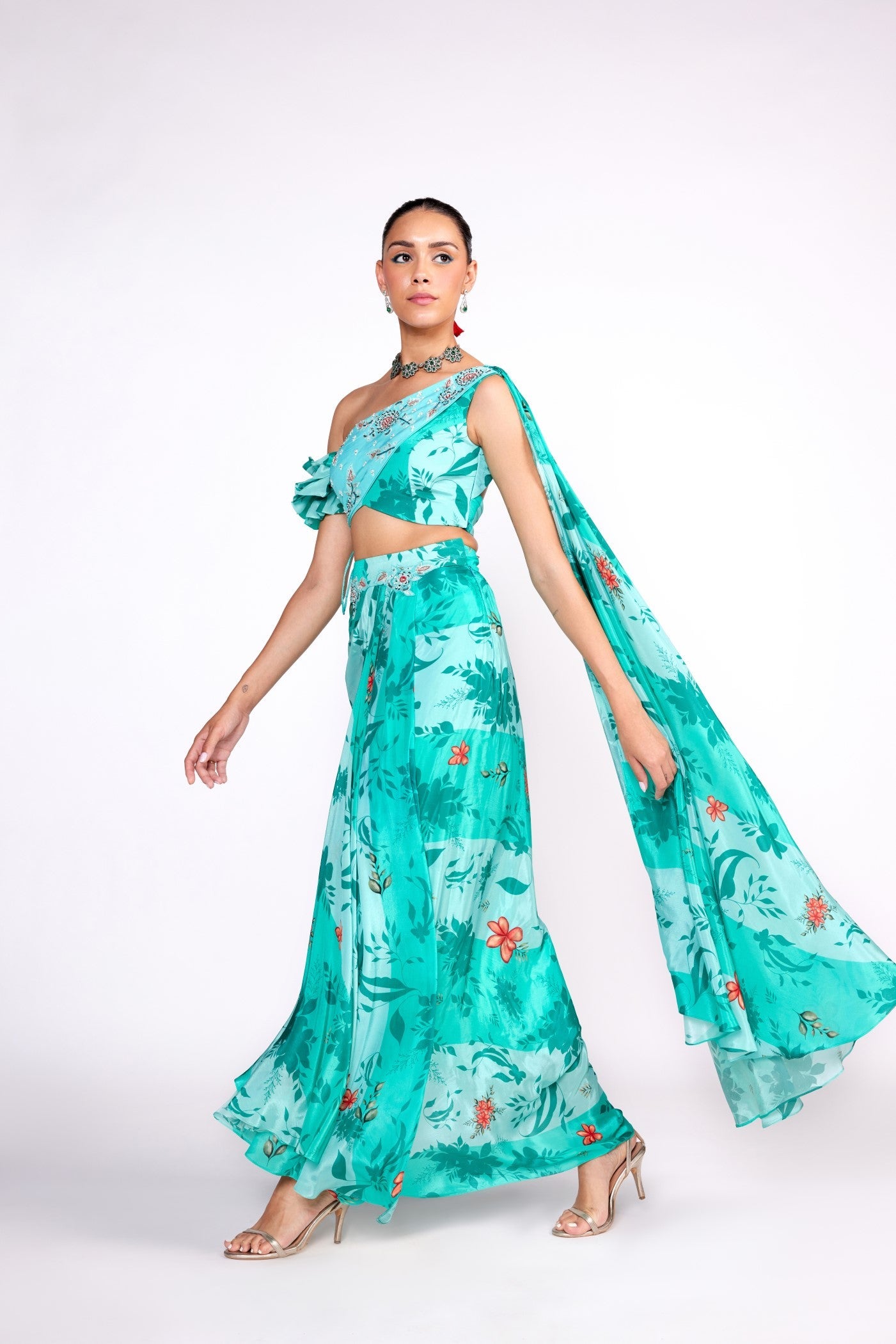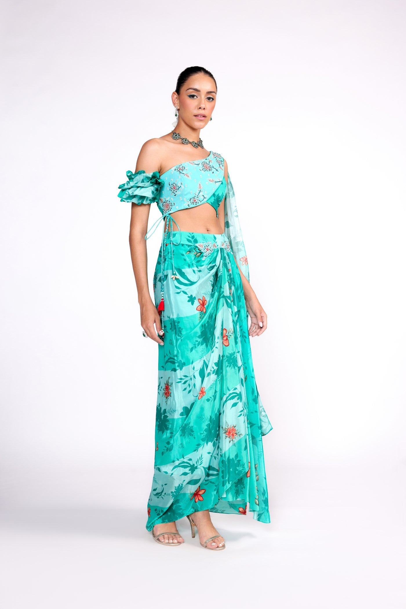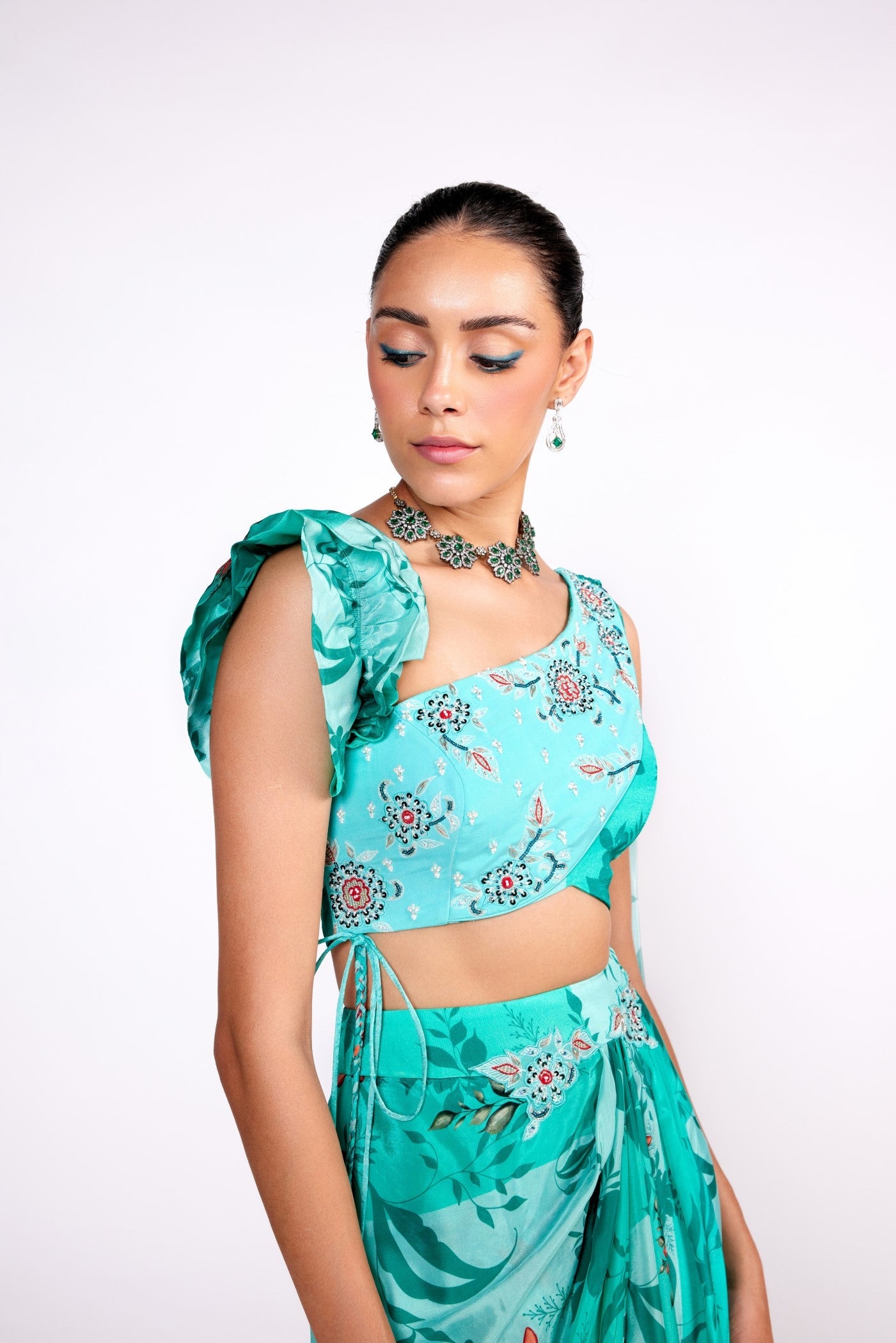 Dieses Set besteht aus einem aquagrün bedruckten Drapierungsrock mit Stickereien am Gürtel. Dazu passt ein bedrucktes und besticktes Drapierungsoberteil. Alles aus Krepp.