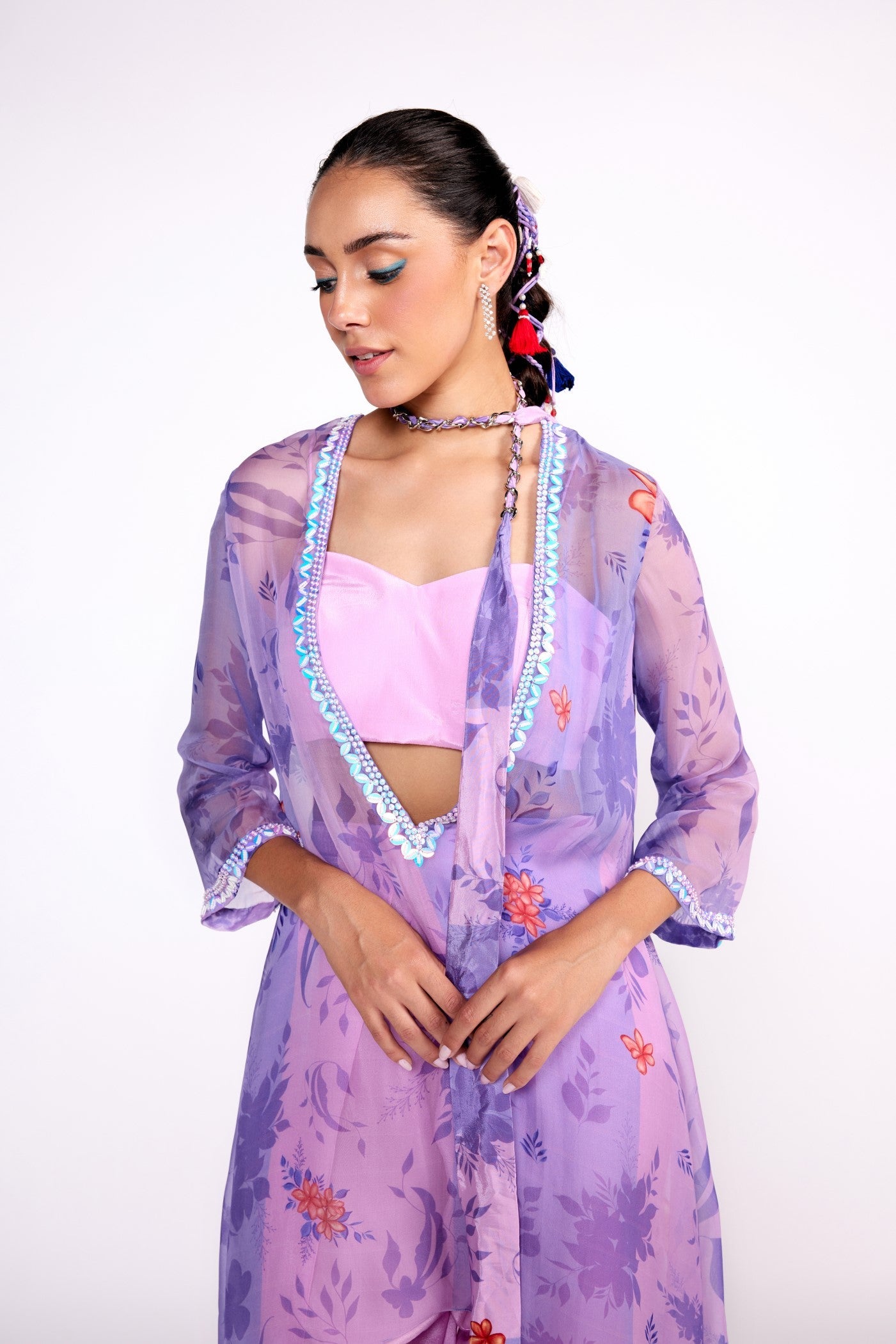 Dieses Set besteht aus einer bedruckten Organza-Tunika mit besticktem Ausschnitt und Ärmeln. Dazu passen ein Seidenbustier und eine Tulpenhose aus Crêpe.