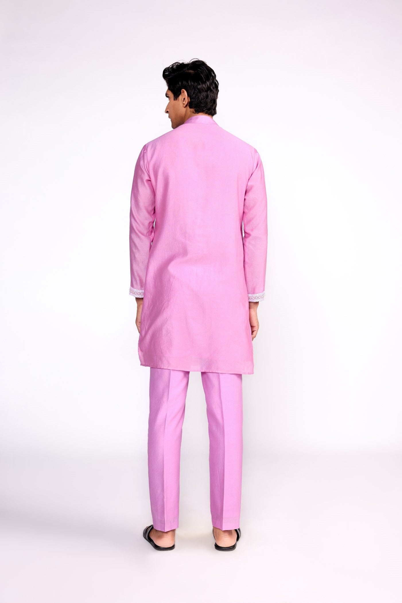 Hier ist ein lila besticktes Kurta zu sehen. Dazu passen Hosen mit Öffnung vorne, beide aus Chanderi-Seide.