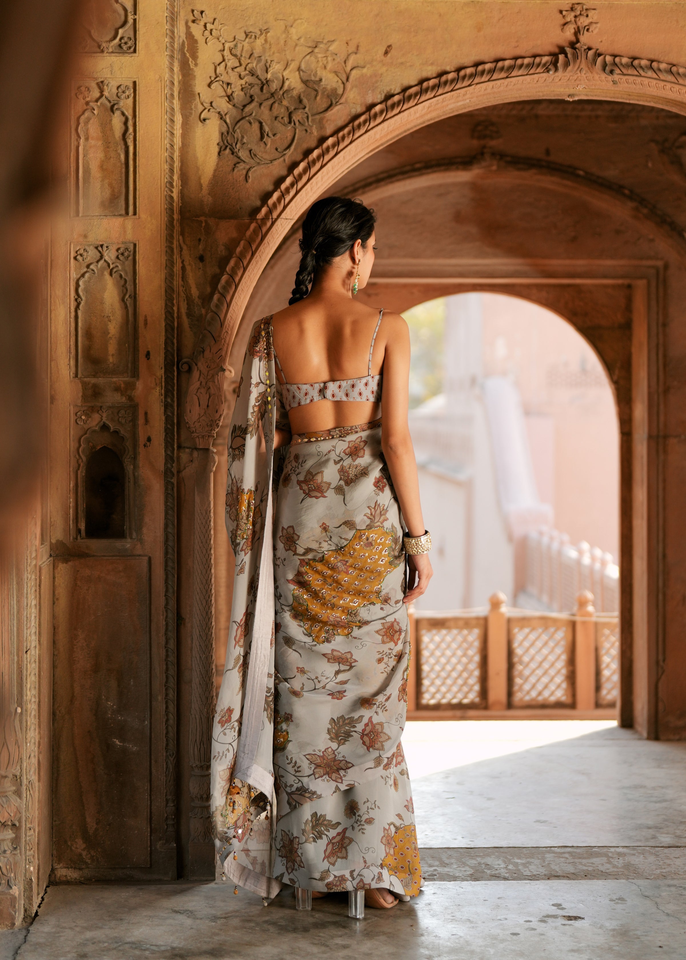 „Erleben Sie die Kunst zeitloser Schönheit mit diesem klassischen sechs Yard langen Sari, bei dem graue Blumenmuster auf aufwendige Stickereien mit Zardozi, Pitta und funkelnder Spiegelarbeit treffen. Das Ensemble wird durch eine luxuriöse Chanderi-Seidenbluse und einen perfekt dazu passenden Unterrock aufgewertet und schafft so einen anmutigen Look, der ideal für Haldi-, Mehendi-, Sangeet- oder Karnevalsfeiern ist.