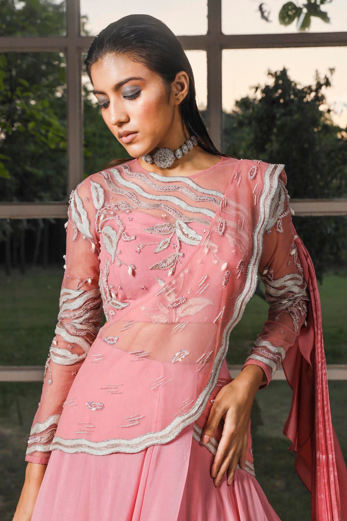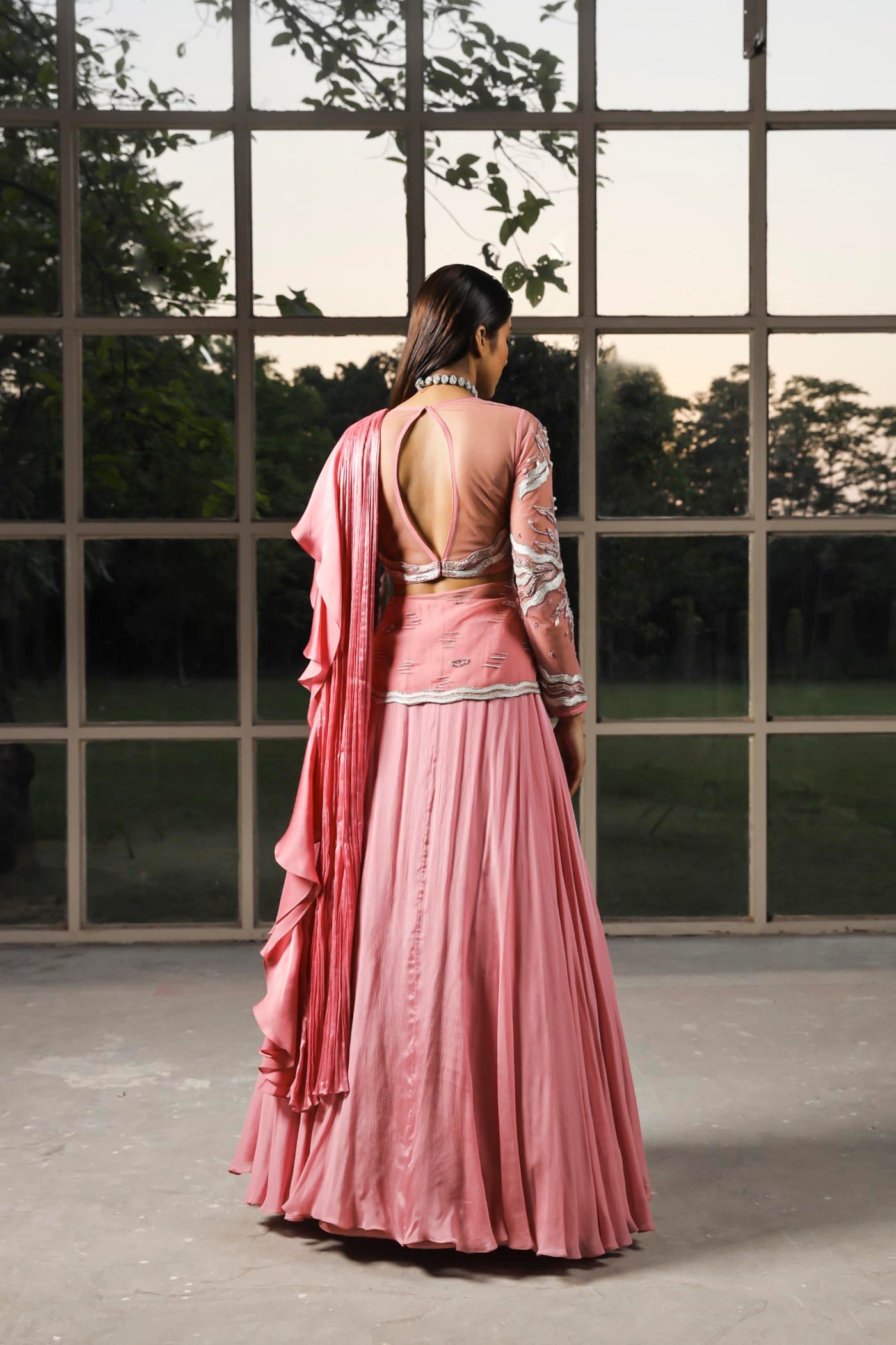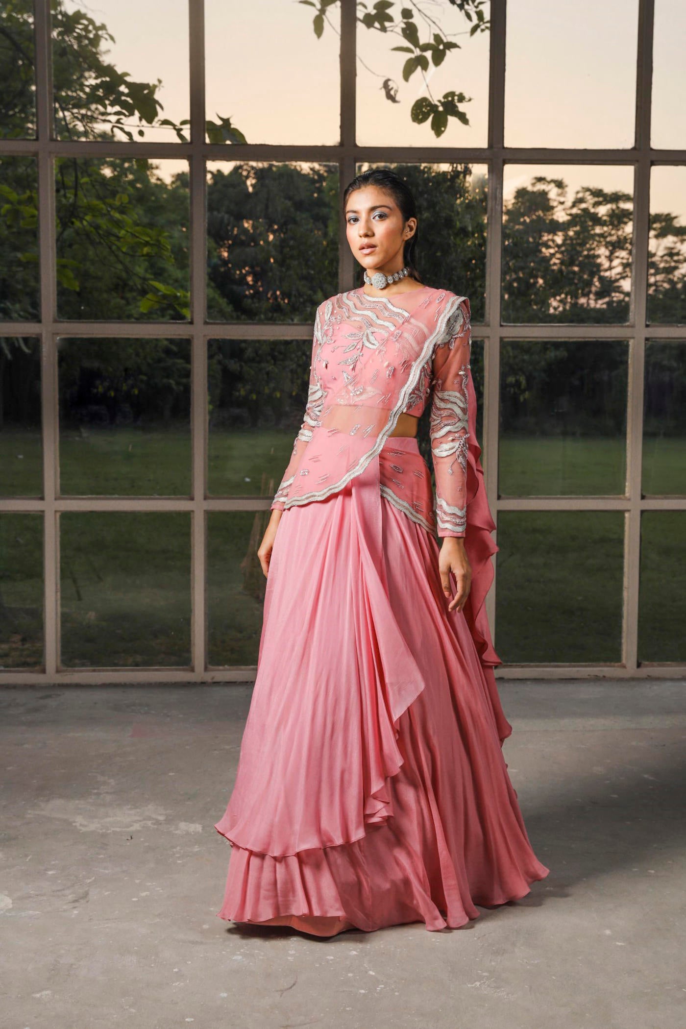 Hier sehen Sie einen vorgenähten, drapierten Kaschmir-Sari in Rosa mit besticktem Pallu. Dazu passt eine aufwendig bestickte Bluse.