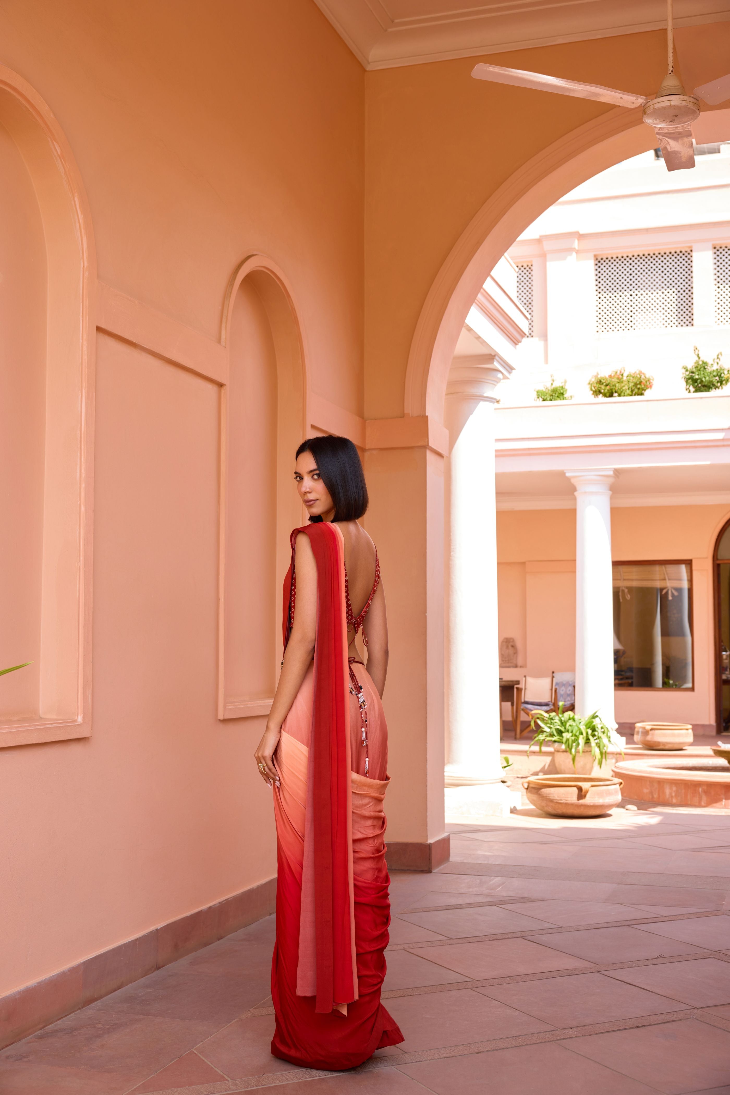 Das vorgenähte Sari aus Krepp im Ombre-Look wird mit einer mit Bandhani verzierten und bestickten Bluse kombiniert. Der juwelenbesetzte, bestickte Kamarbund-Gürtel in Einheitsgröße definiert den festlichen Look neu und rundet ihn ab.