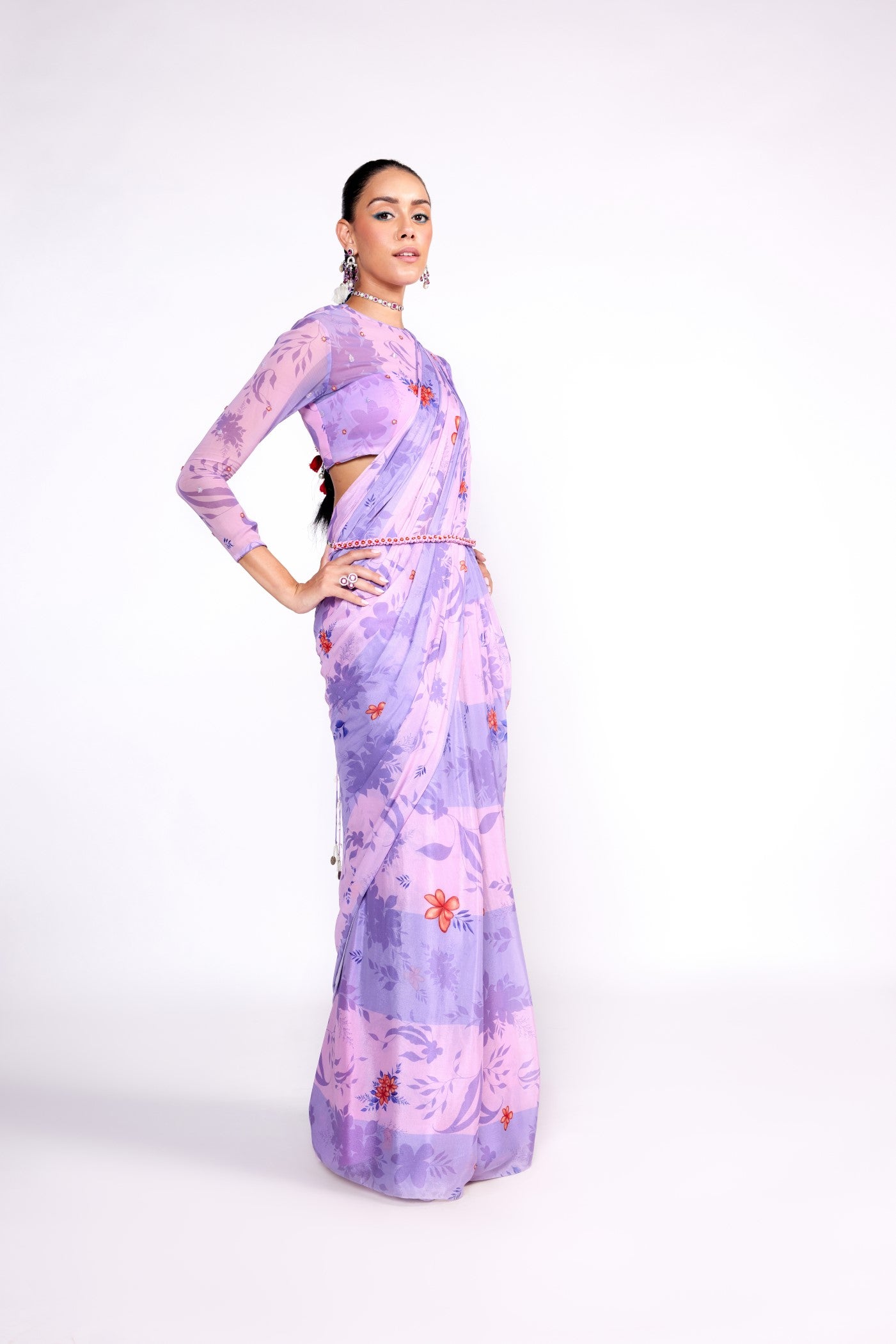Dieses Set besteht aus einem vorgefalteten, fliederfarbenen Chiffon-Sari. Dazu passt eine bestickte Georgette-Bluse und Makramee bestickter Gürtel.