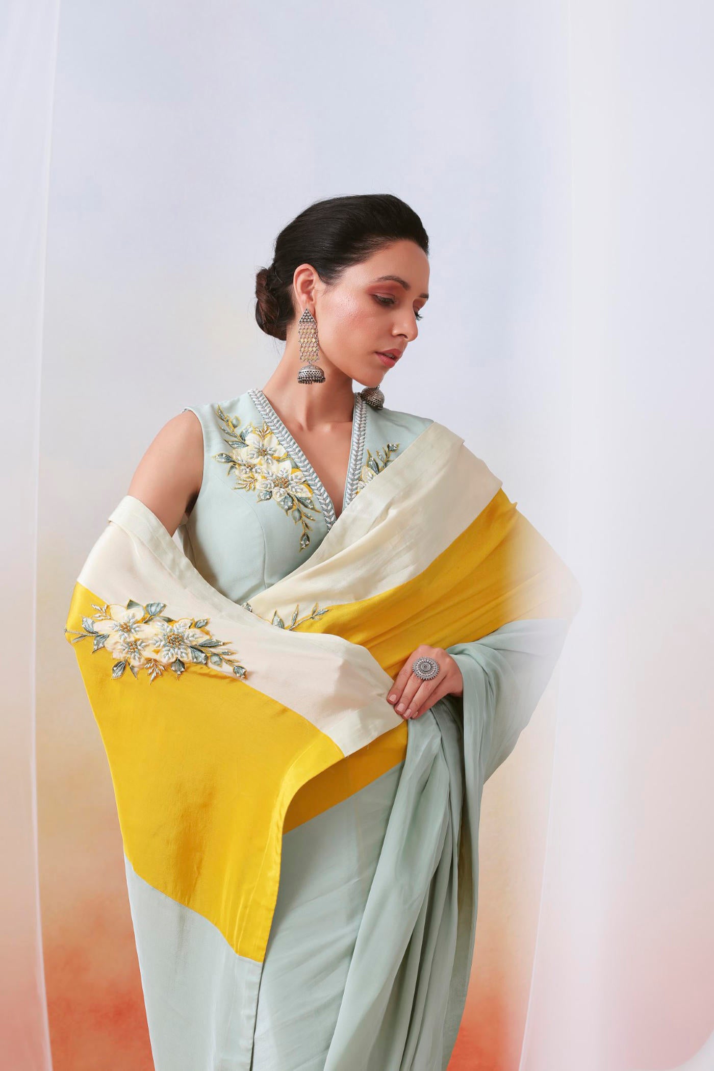 Hier sehen Sie einen mehrfarbigen Sari aus Krepp mit floralem Patchwork-Muster. Dazu passen eine bestickte Bluse und ein passender Unterrock.