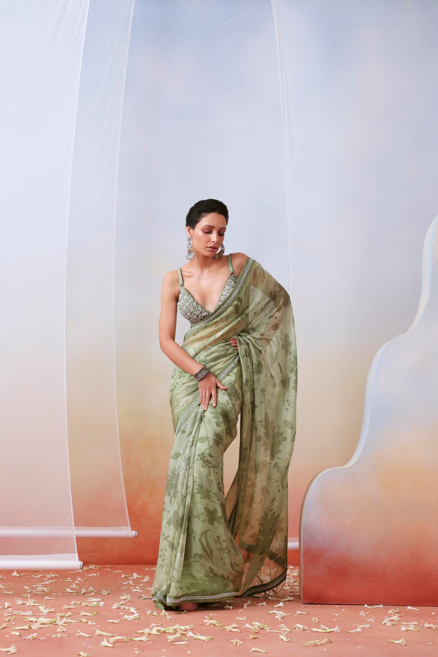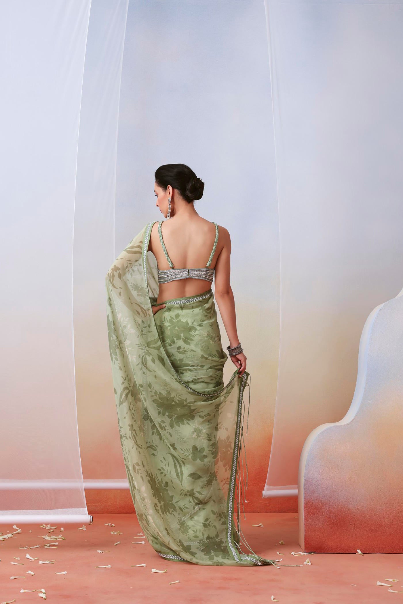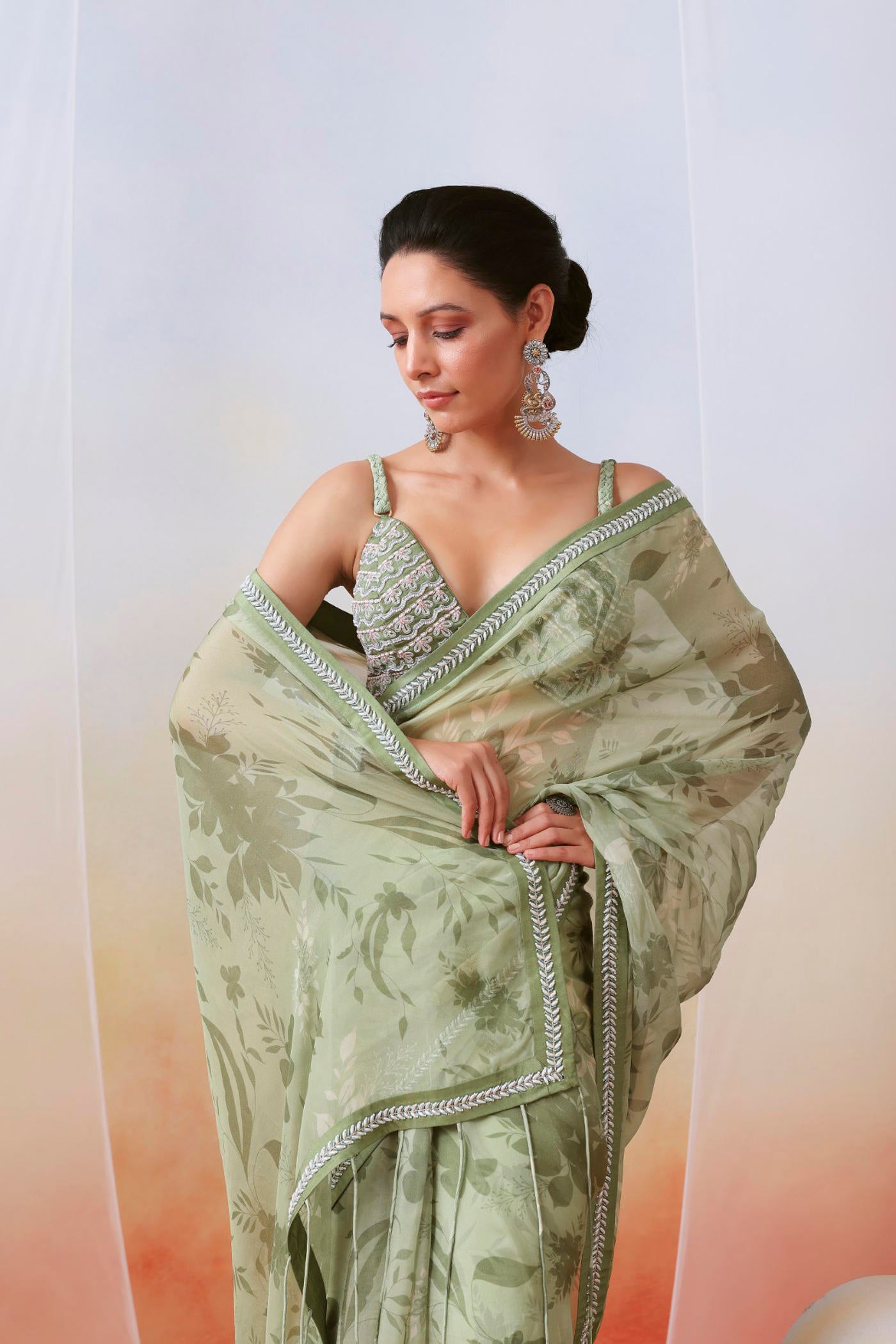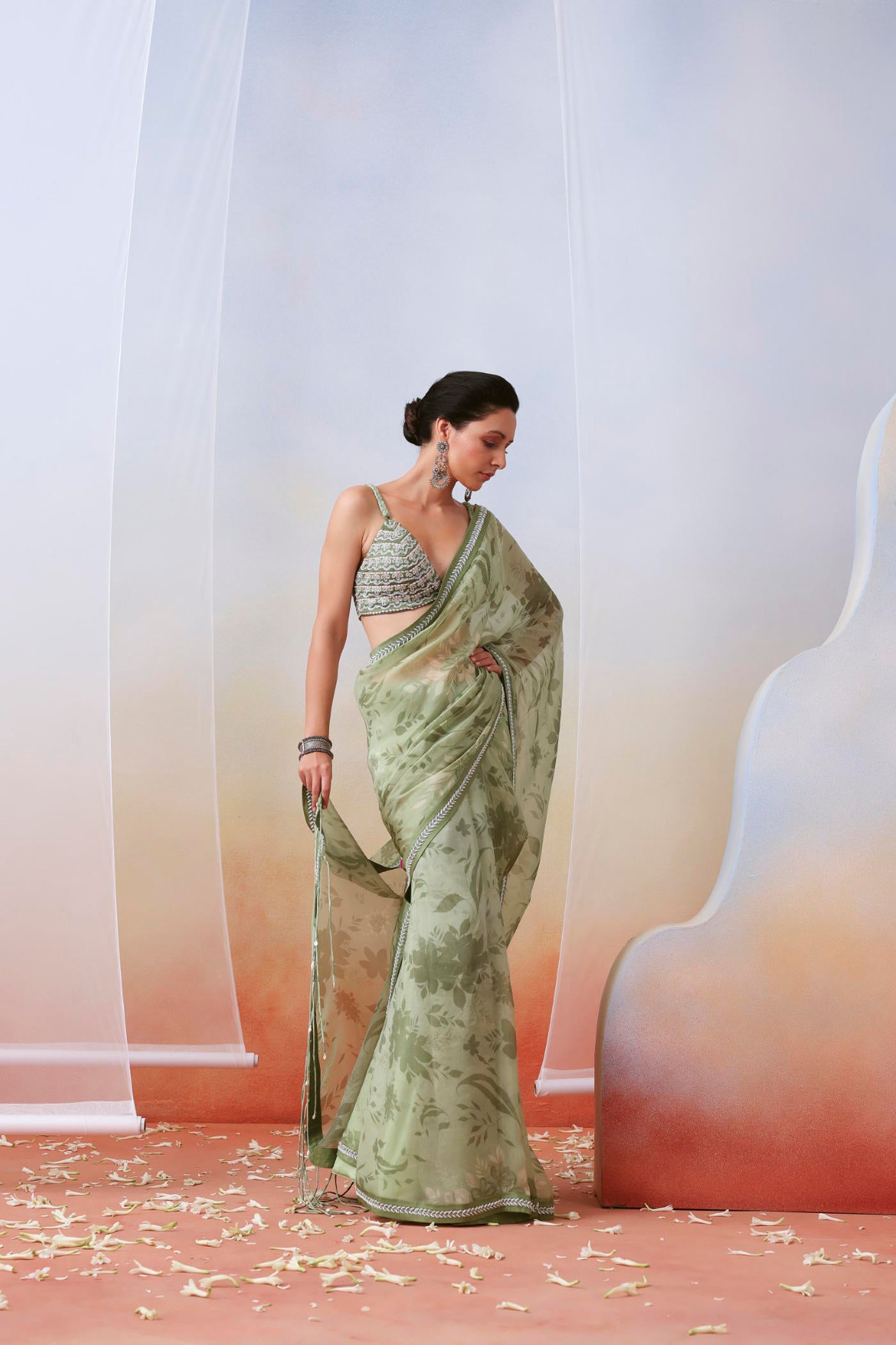 Hier sehen Sie einen Sari aus Organza mit Blumenmuster in Salbeigrün. Er hat einen bestickten Rand und eine Bluse mit Stickereien, verziert mit Dori, Resham und Perlen. Das Set enthält einen Unterrock.