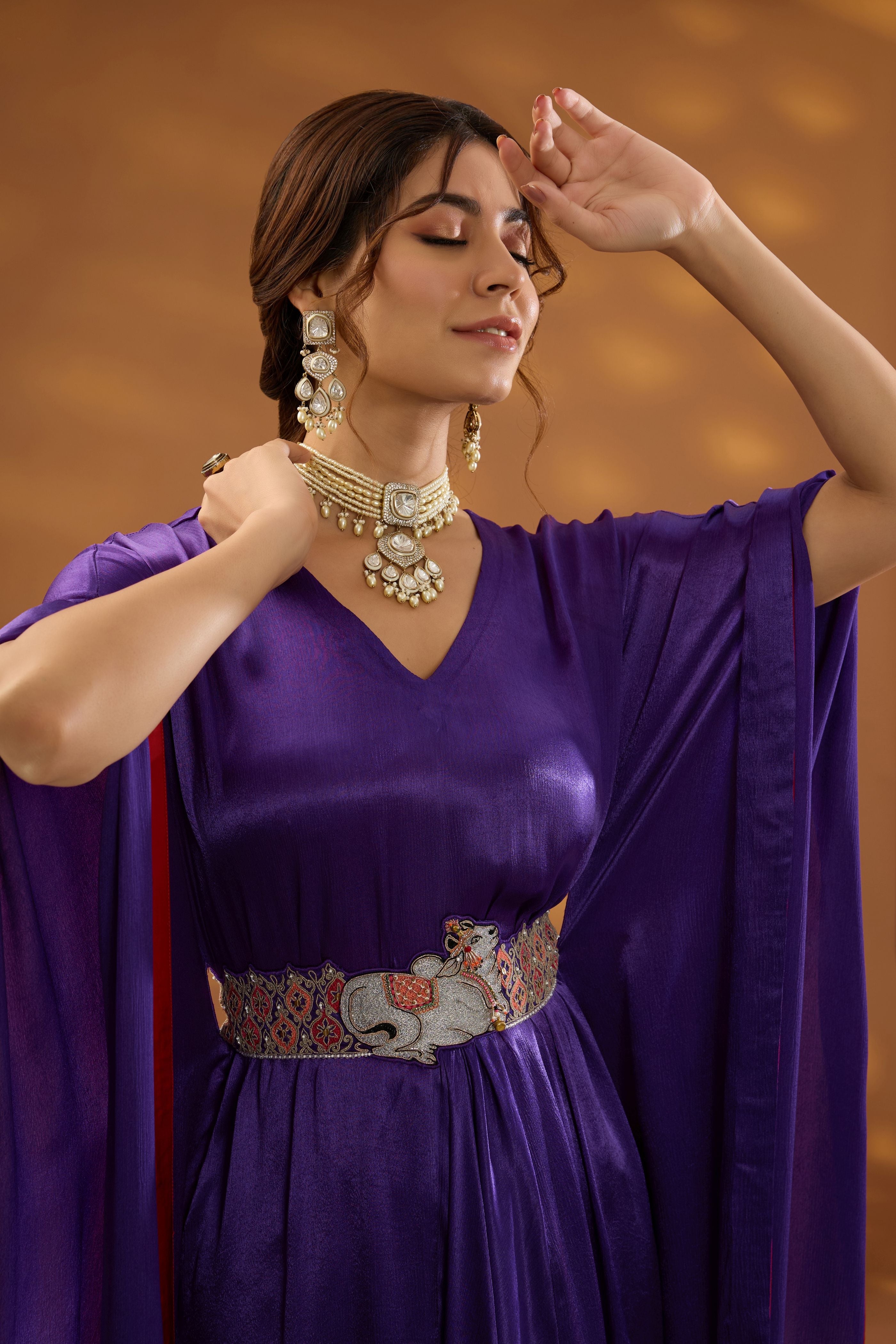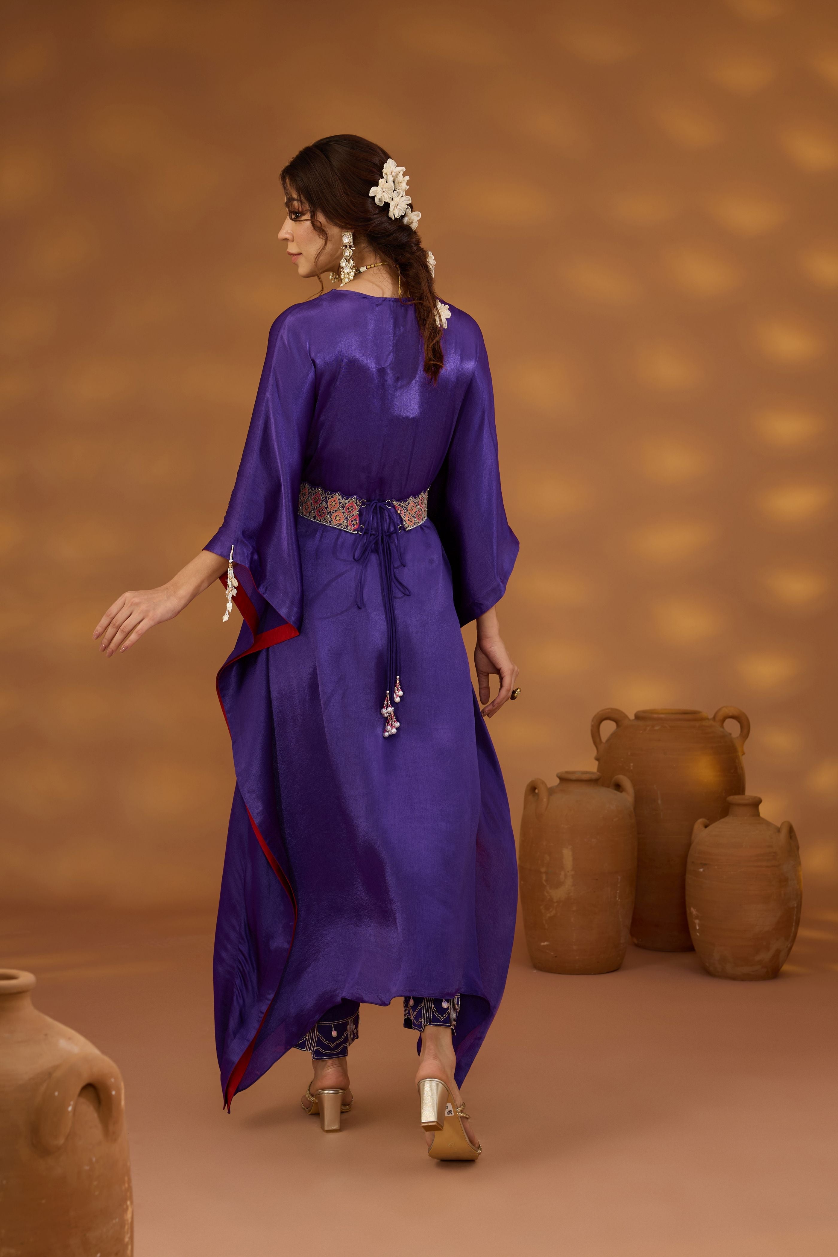 Hier sehen Sie unsere lilafarbene, drapierte Kurta aus Chiffon-Satin. Dieses fließende Kleidungsstück besticht durch einen aufwendig bestickten Gürtel in Einheitsgröße, der die Taille betont und Ihre Silhouette betont. Zusammen mit der passenden bestickten Hose aus Leinen-Satin ist dieses Ensemble perfekt für jeden Anlass und verbindet Komfort mit schicker Eleganz.