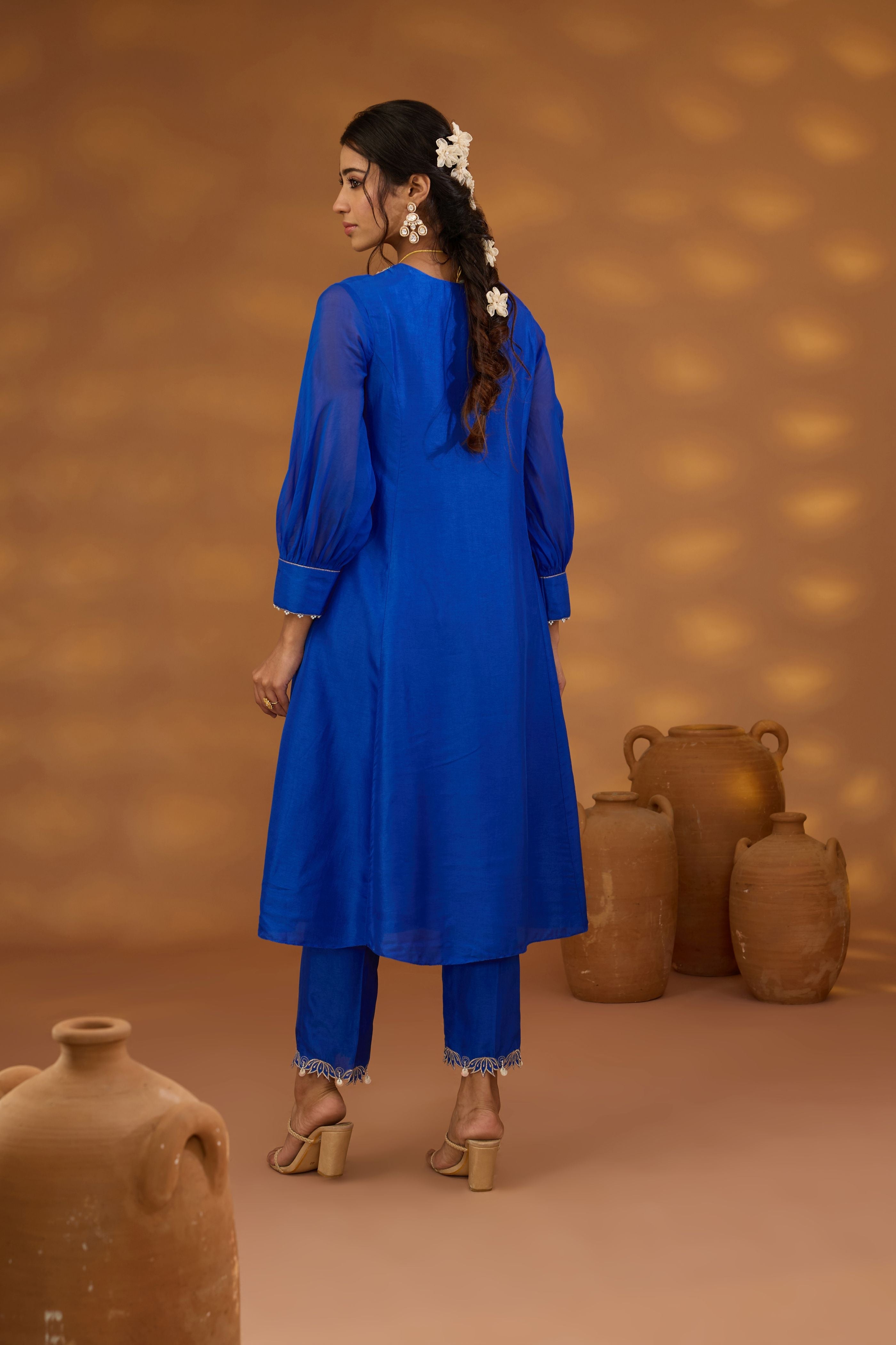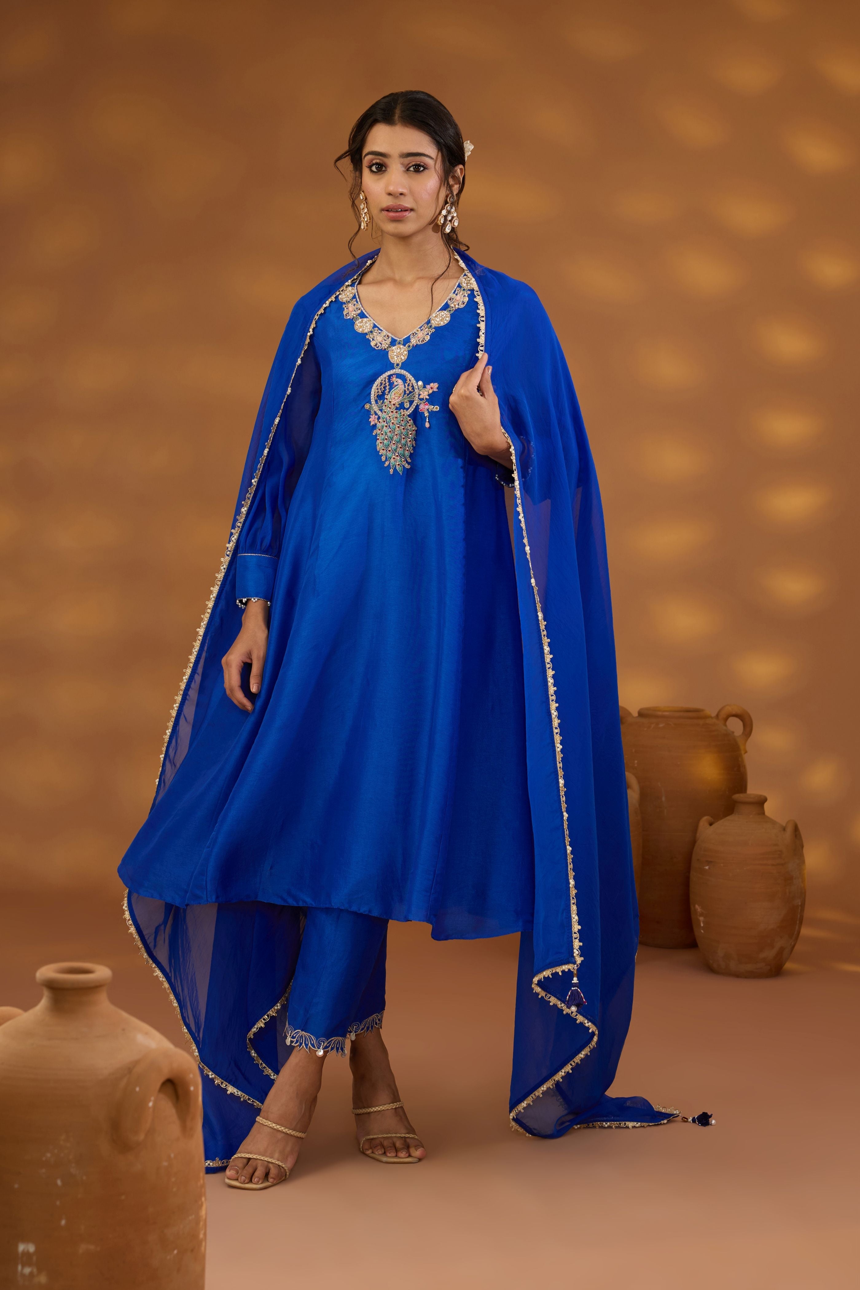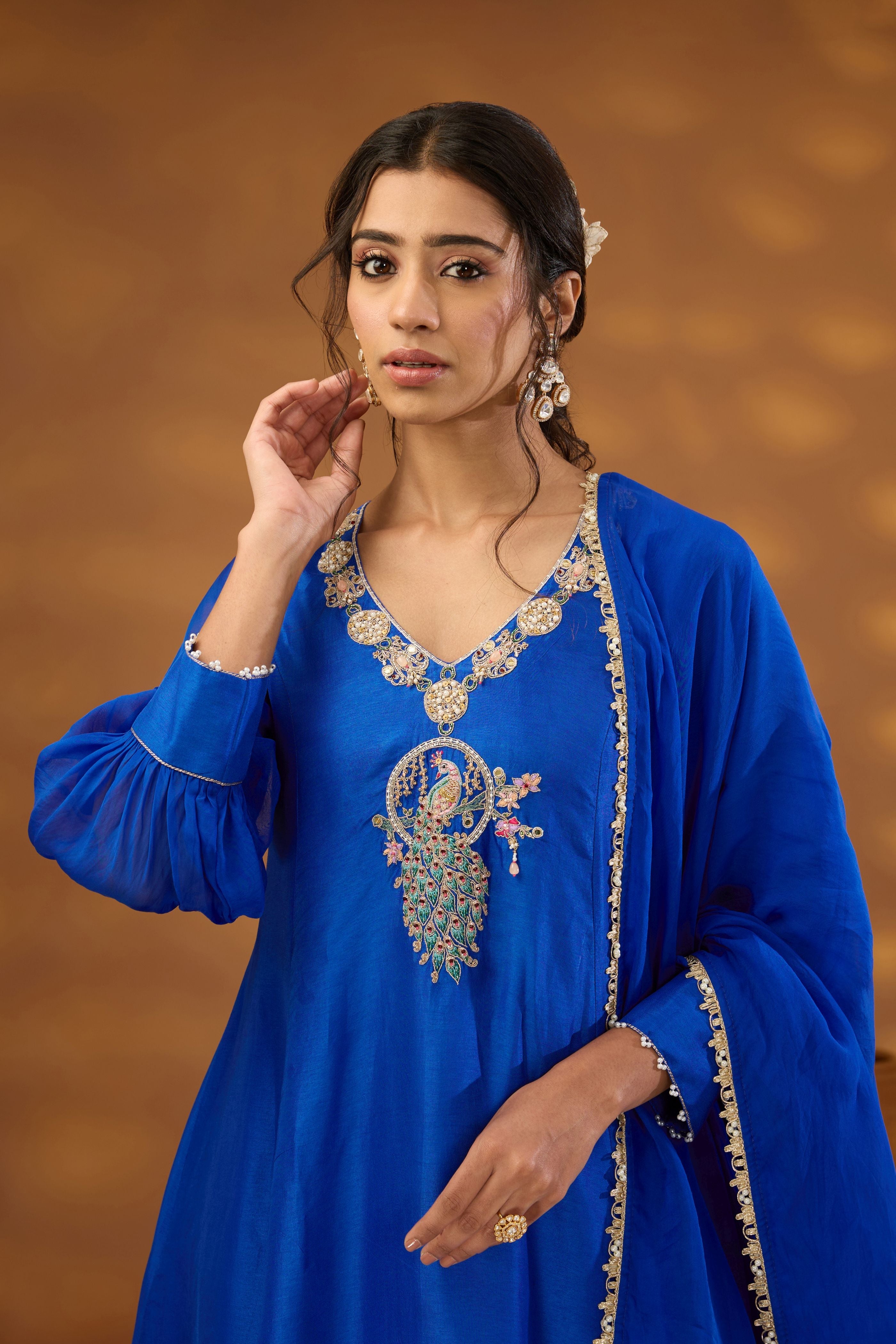 Hier sehen Sie eine fließende Seidenkurta in Juwelenblau mit aufwendig handgesticktem Jadau-Ausschnitt und Pfauenmotiv. Dazu passen bestickte Seidenhosen. Das Set wird mit einem passenden Organza-Dupatta geliefert, der für zusätzliche Eleganz sorgt. Zarte Organza-Ärmel werten den Look auf und machen ihn perfekt für festliche Anlässe oder elegante Zusammenkünfte.