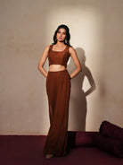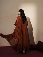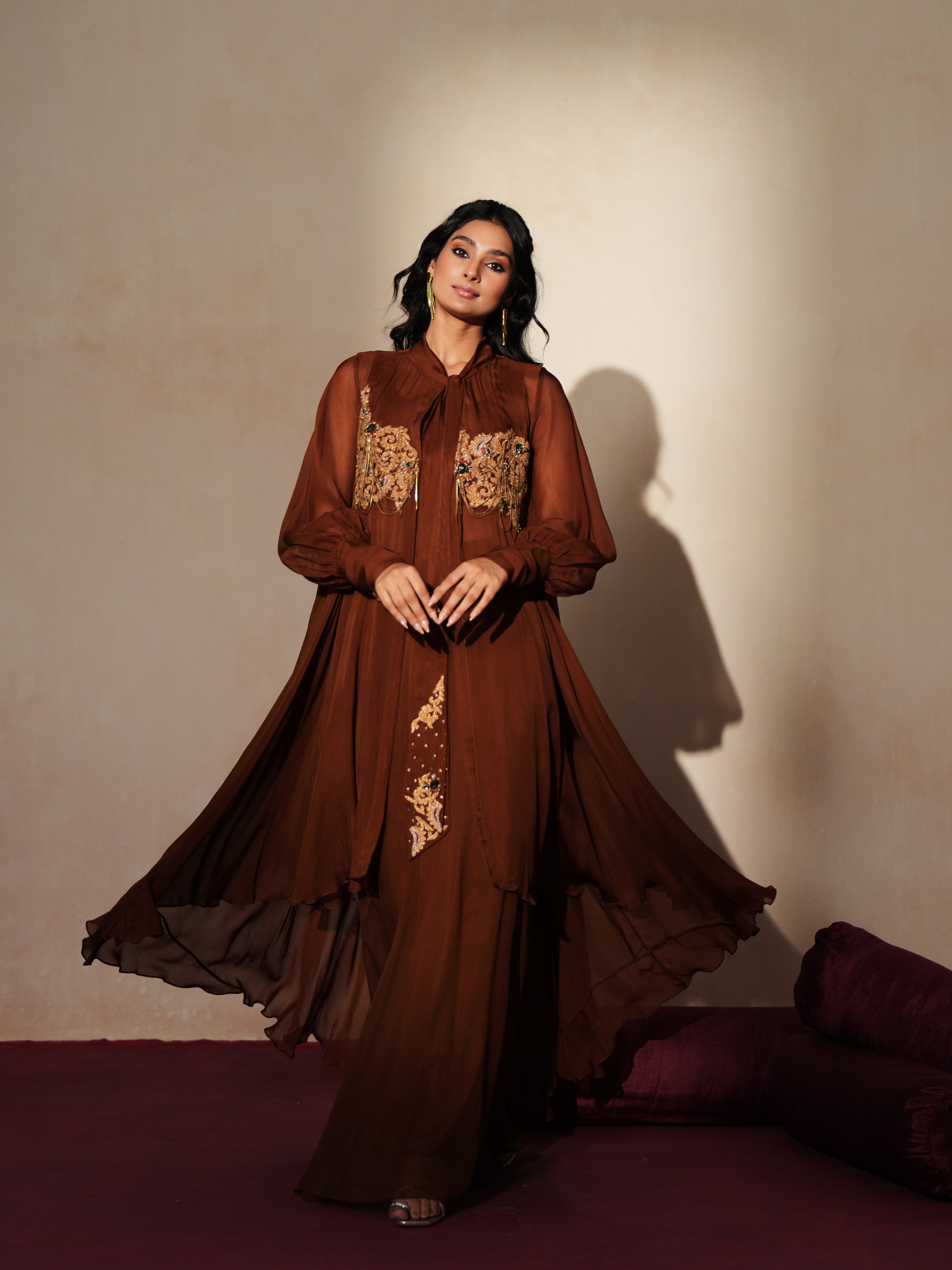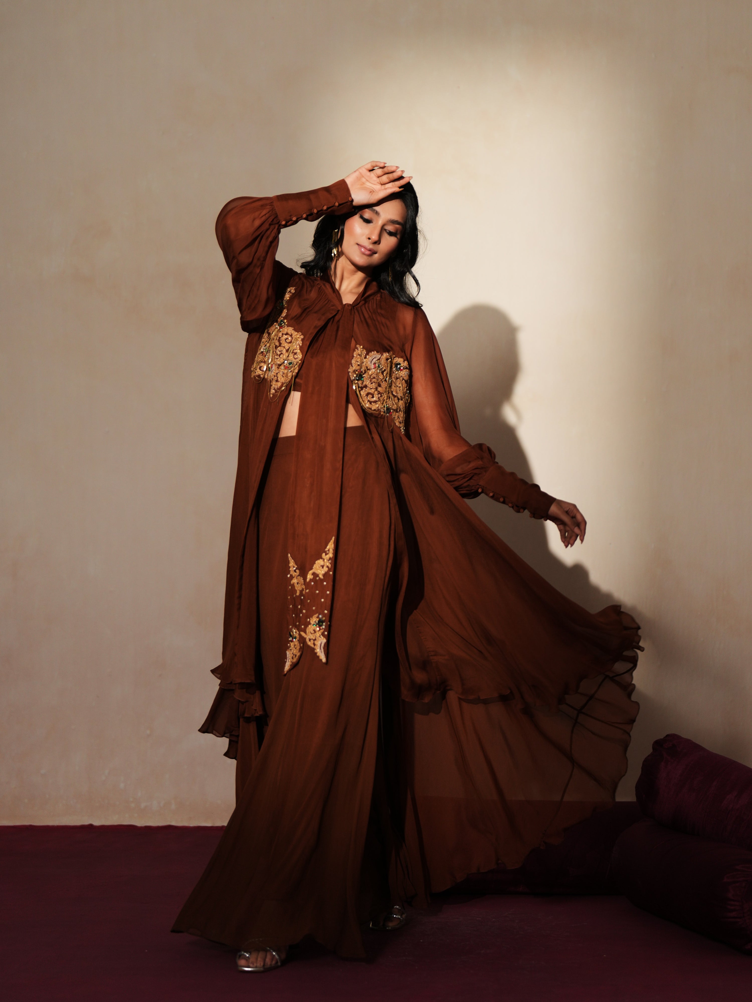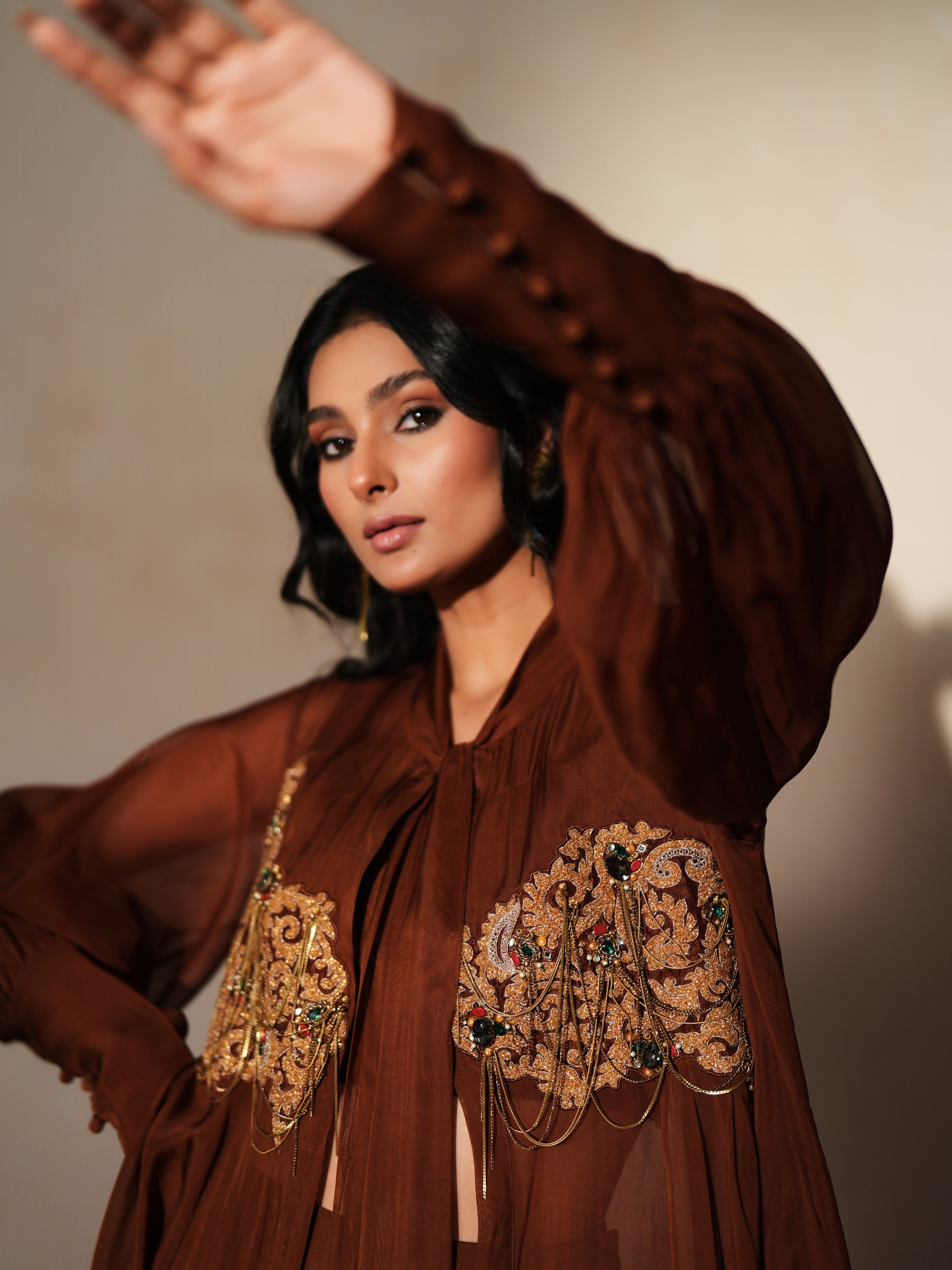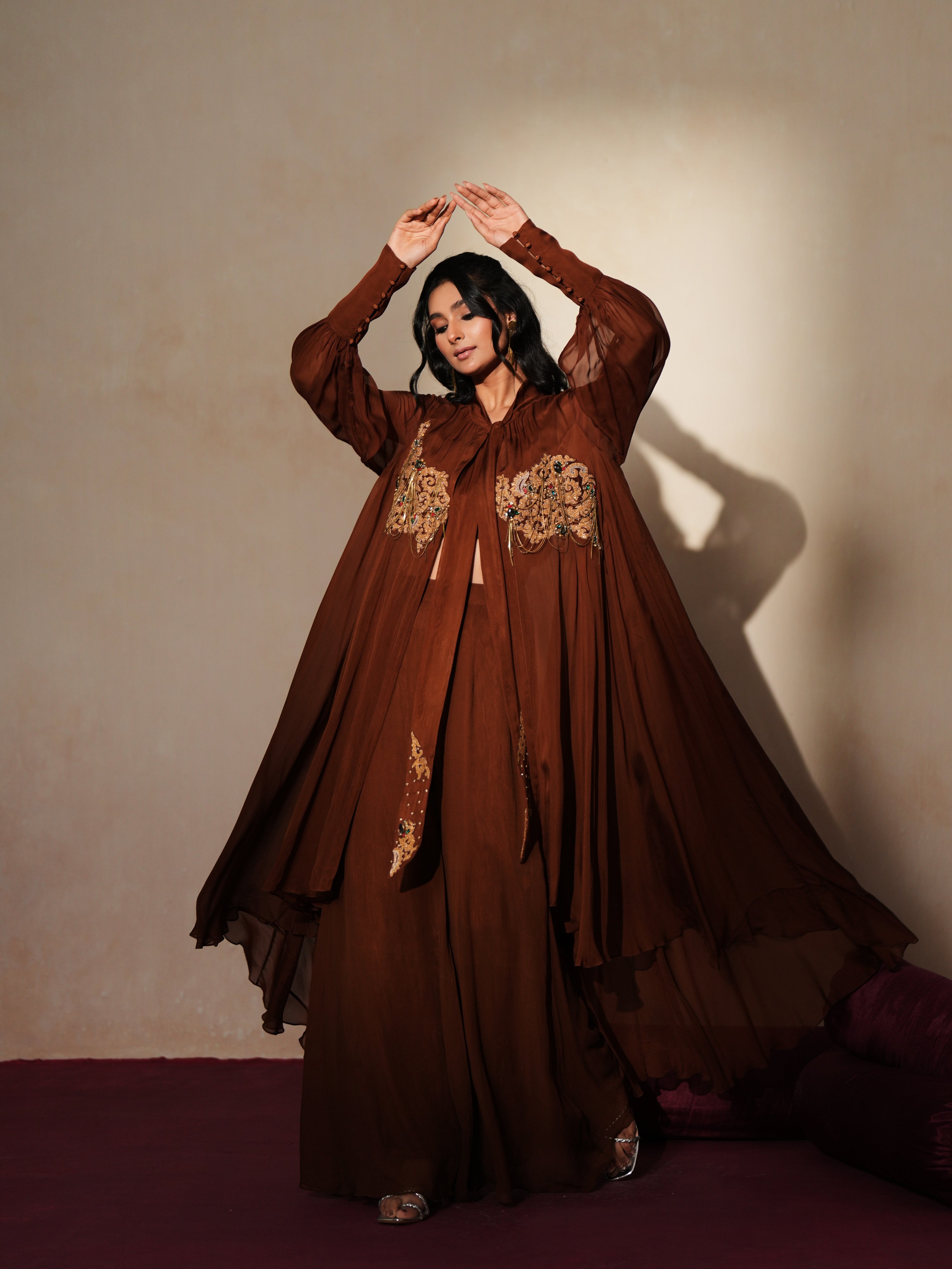 Draped in the earthy radiance of Ruhani, this 3-piece ensemble redefines Indian elegance with a modern silhouette. The flowing organza cape jacket is hand-embroidered with dori marodi, zardozi, and jeweled stone detailing, accentuated by 3D cutwork motifs that add sculptural depth. Paired with fluid georgette pants and a silk bustier, this look embodies understated opulence — heritage revived with contemporary ease.