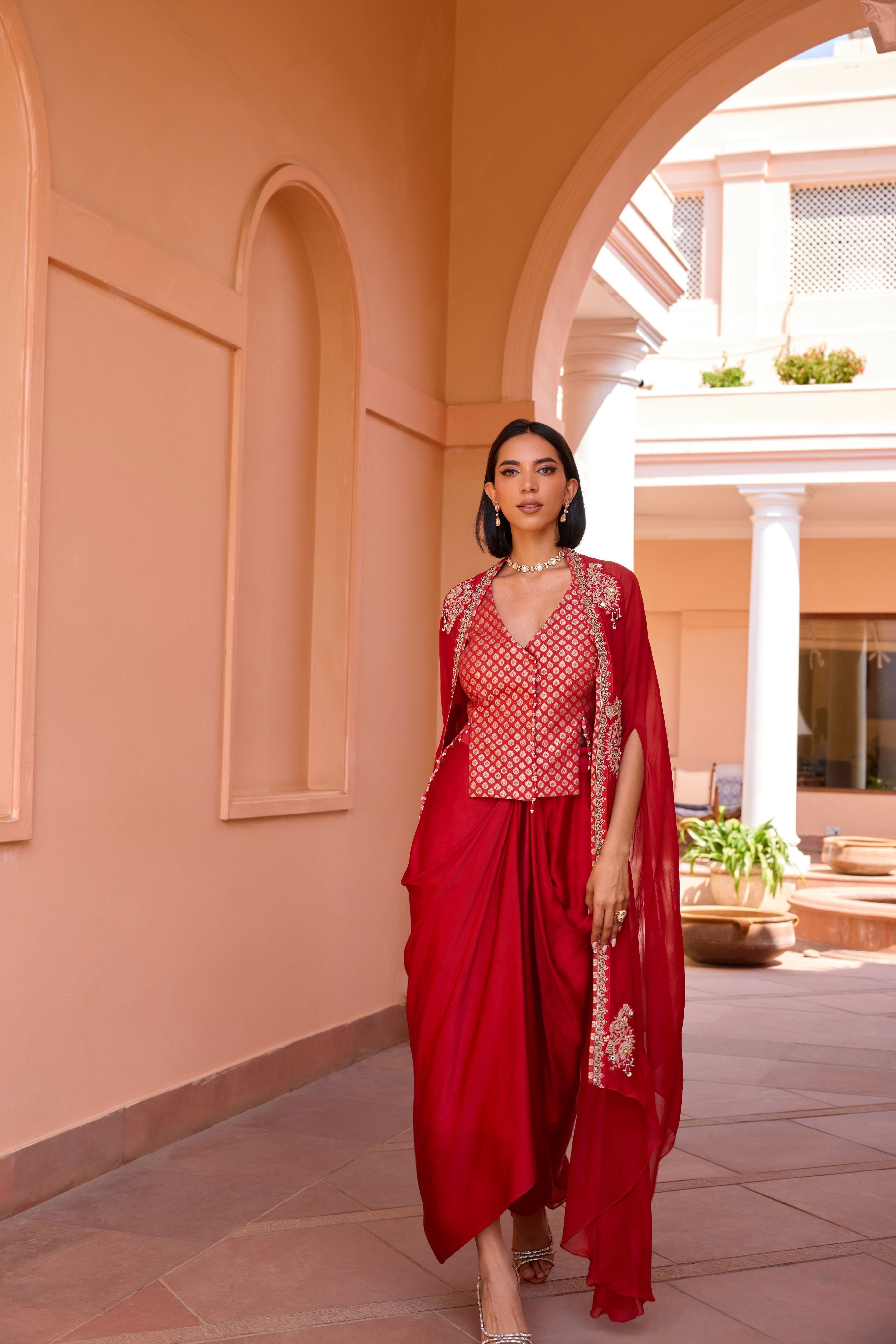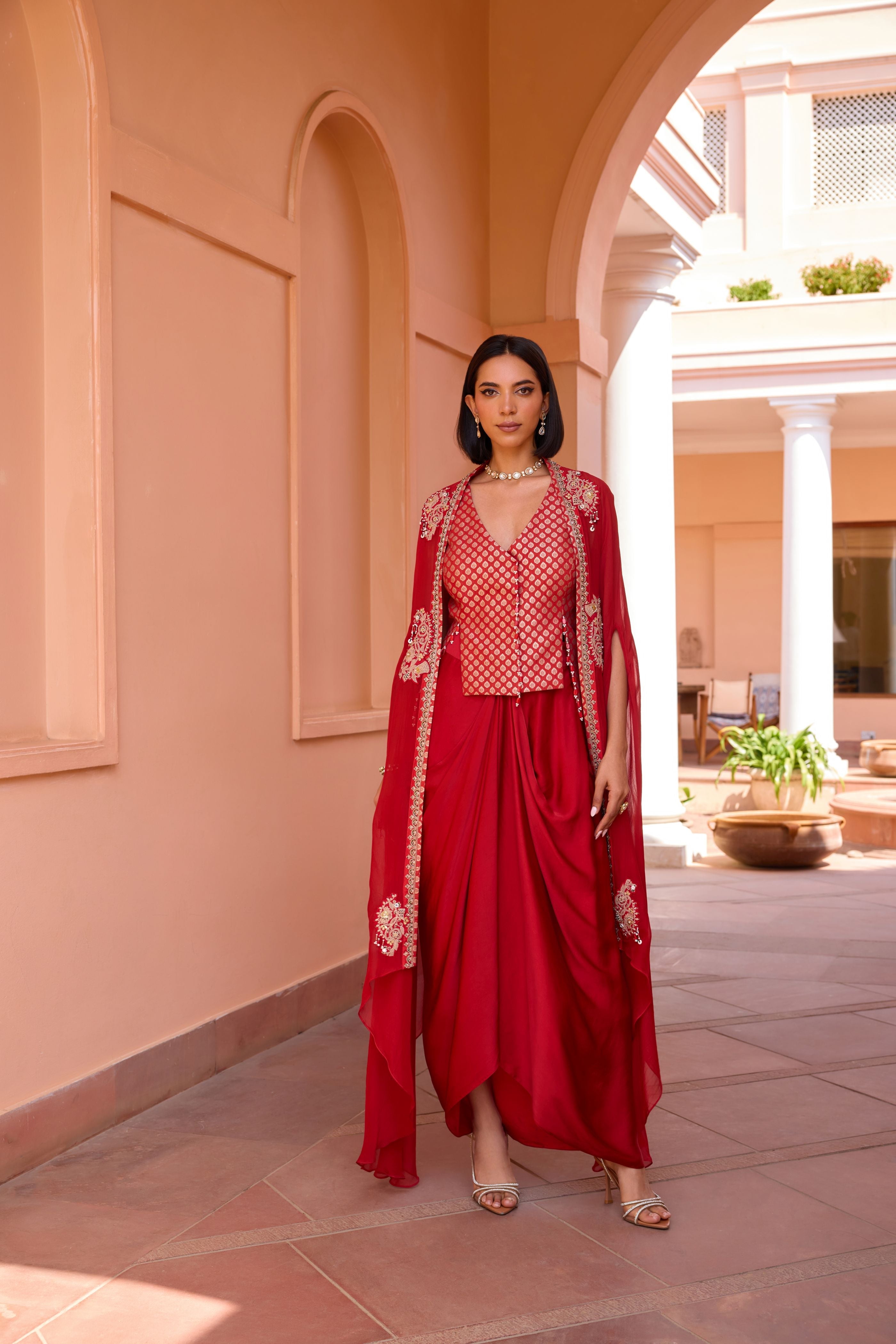 Featuring a Drape skirt and embroidered cape set with chanderi jacquard tailored waist coat. tilla, gota and beads embroidery adorn this set. Redefine elegance with this contemporary silhouette.
