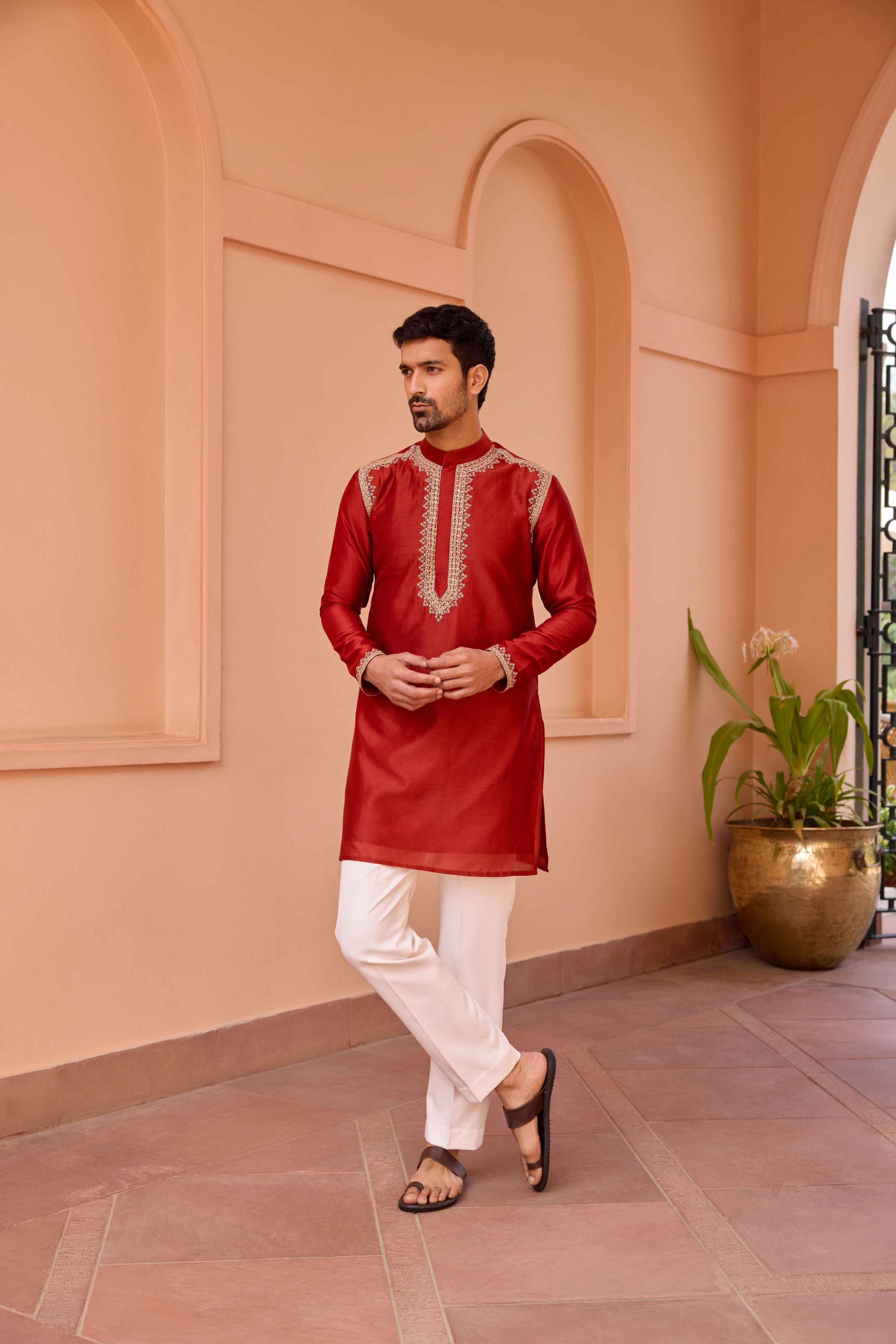 Featuring a kurta made in pure silk chanderi embroidered with subtle dori marodi work. It is paired with front fly and back elasticated tailored pants including pocket. Perfect wear for any occassion or festive look.