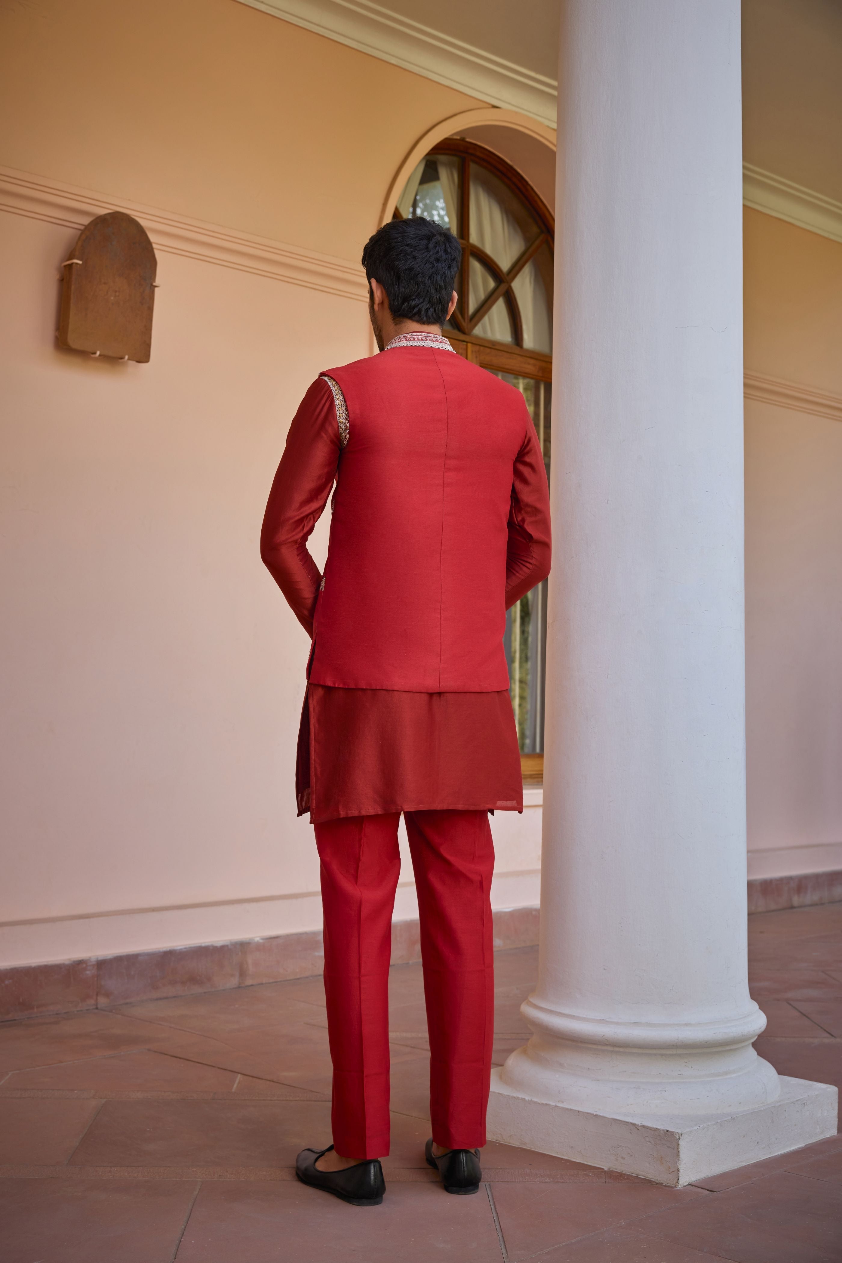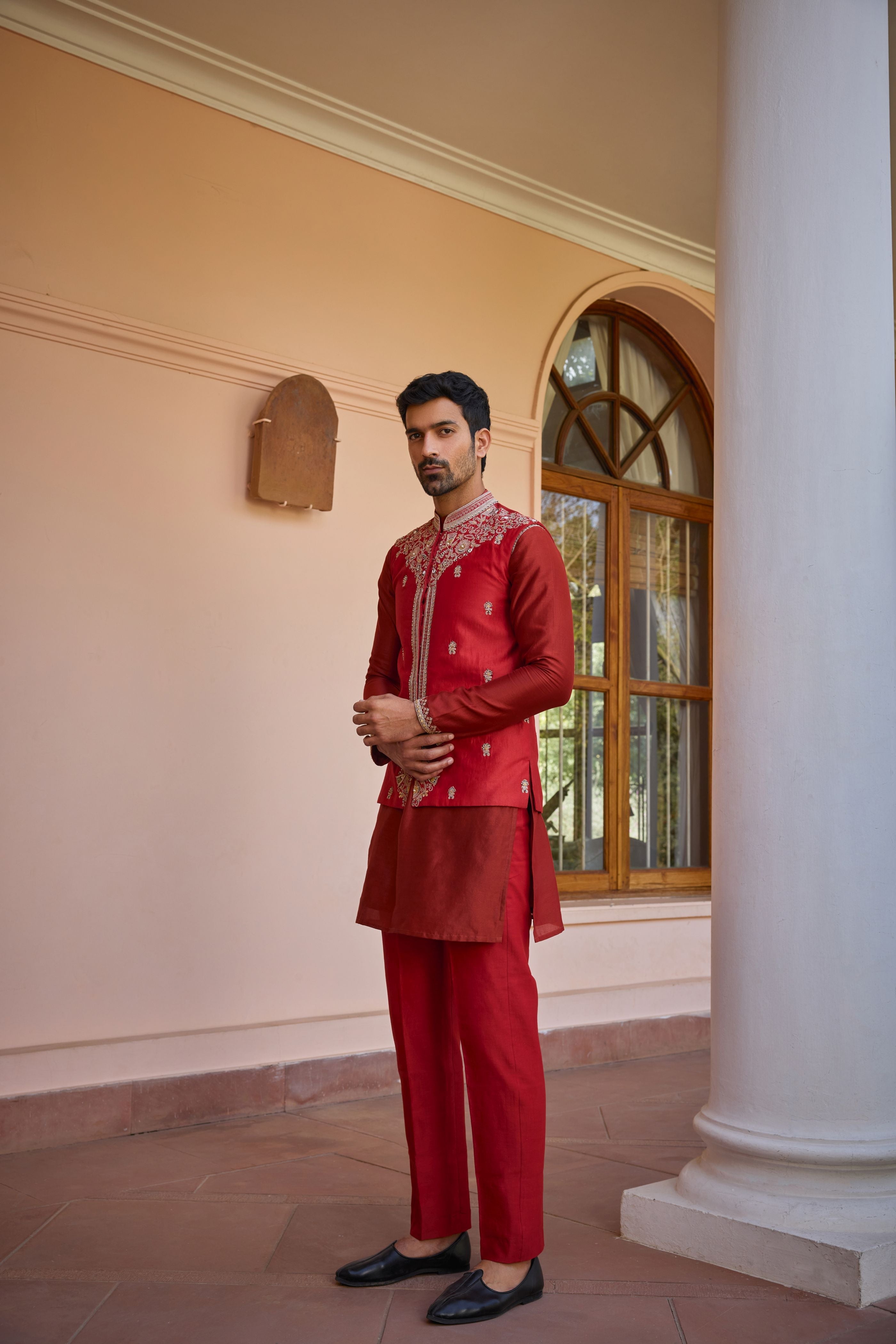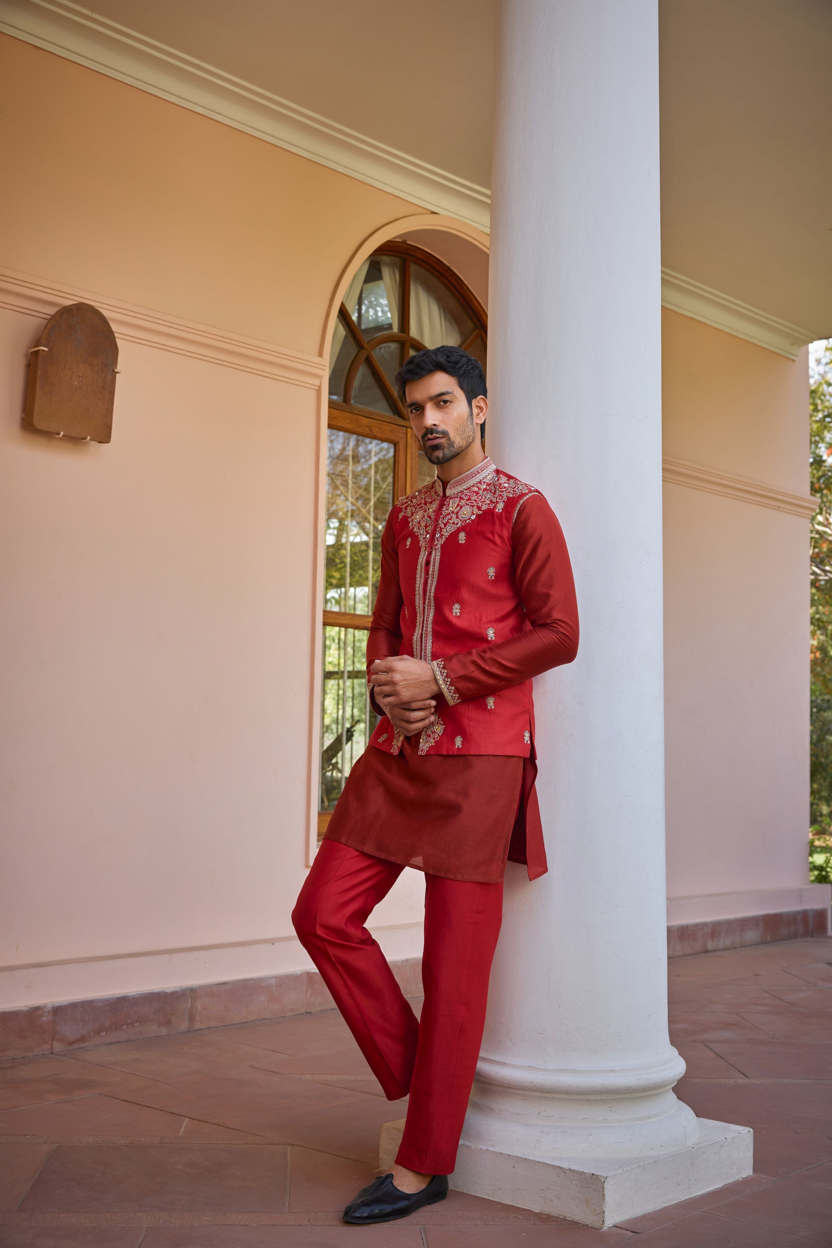 Featuring a contemporary yet traditional bundi jacket set. All made in pure chanderi silk. Kurta and jacket are embroidered with subtle dori marodi and zardozi work. Ace the any occasion or wedding look with this graceful look