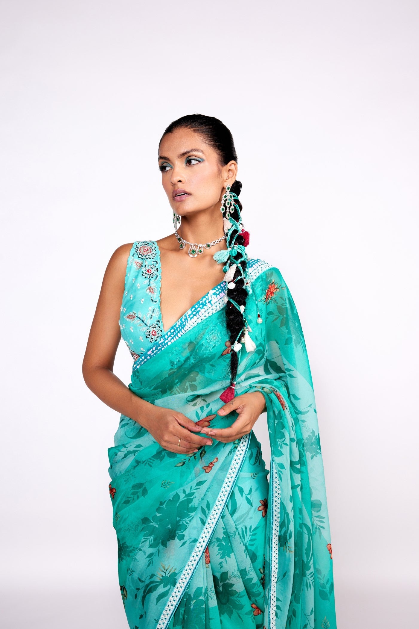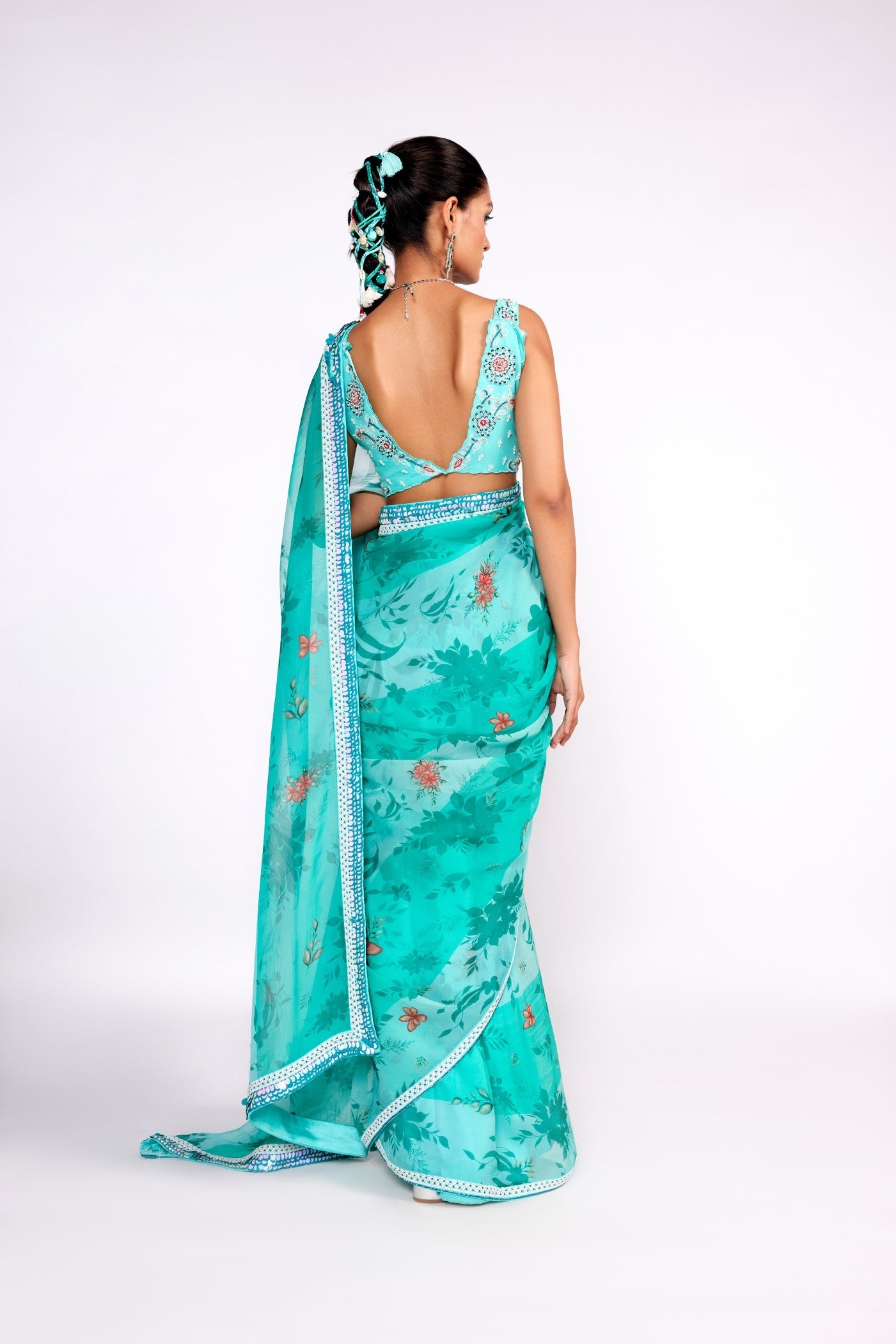 Featured here is printed and embroidered organza saree paired with an embroidered blouse made in georgette. The set includes a matching petticoat.