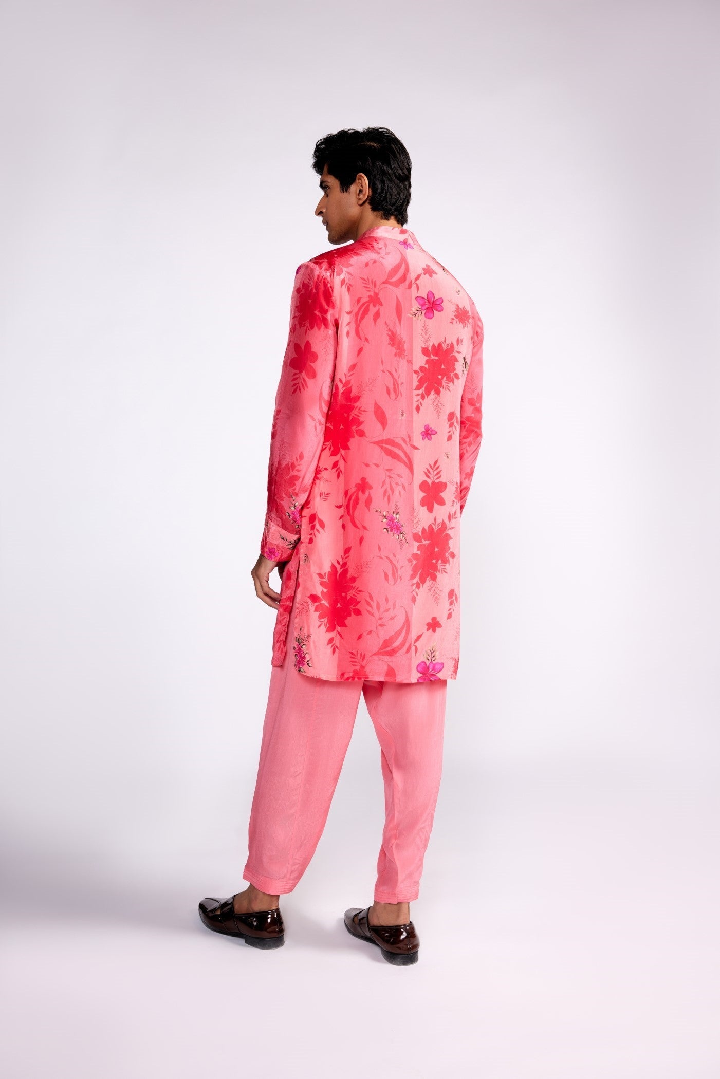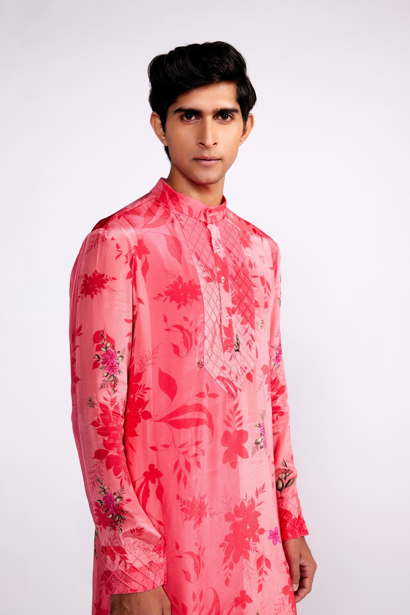 Featured here is pink printed kurta with pin tuck detailing on yoke and sleeves. It is made in crepe
