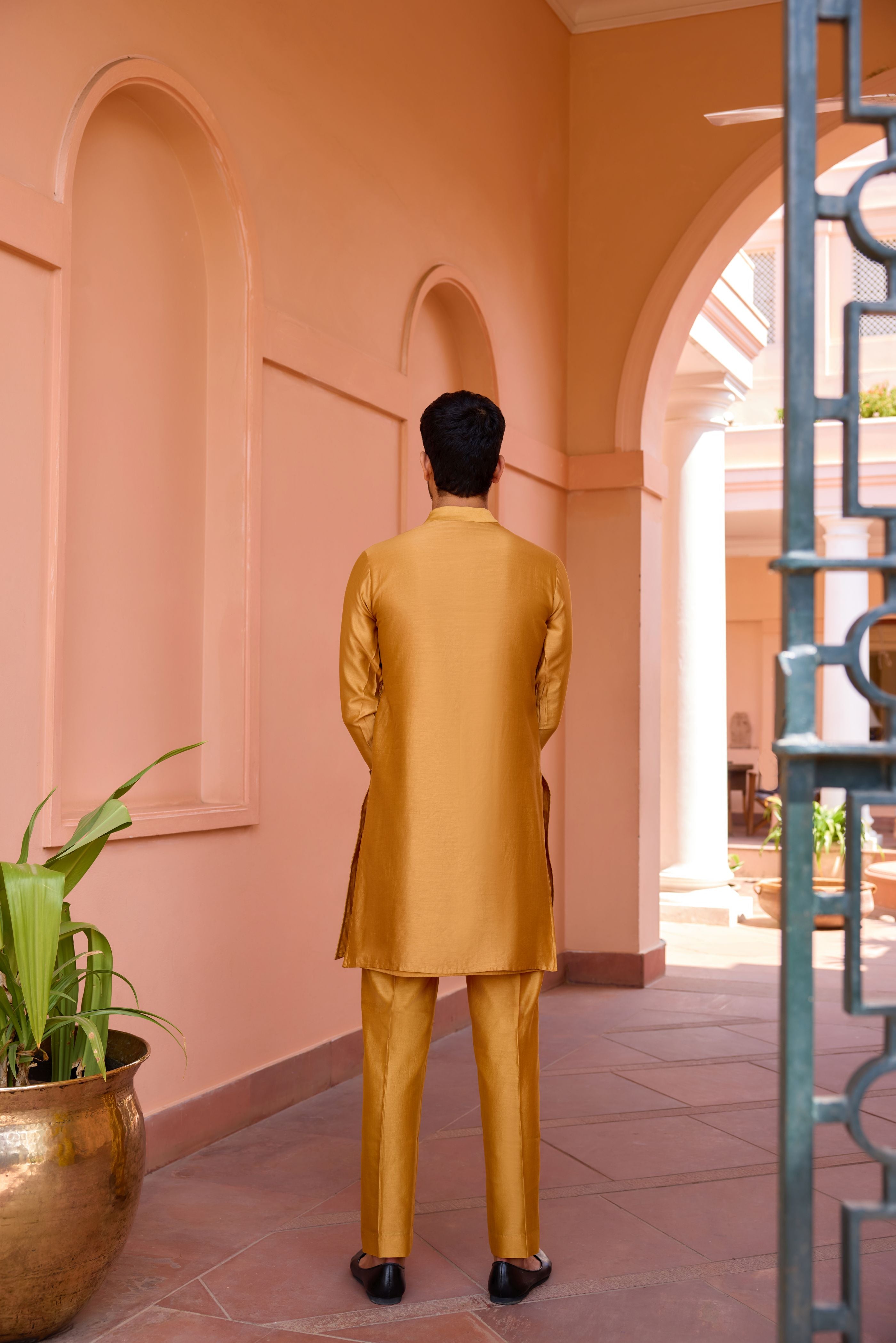 Featuring a kurta made in pure silk chanderi embroidered with subtle dori marodi work. It is paired with front fly and back elasticated tailored pants including pocket. Make a statement with this Perfect effortless wear for any occasion or festive look.