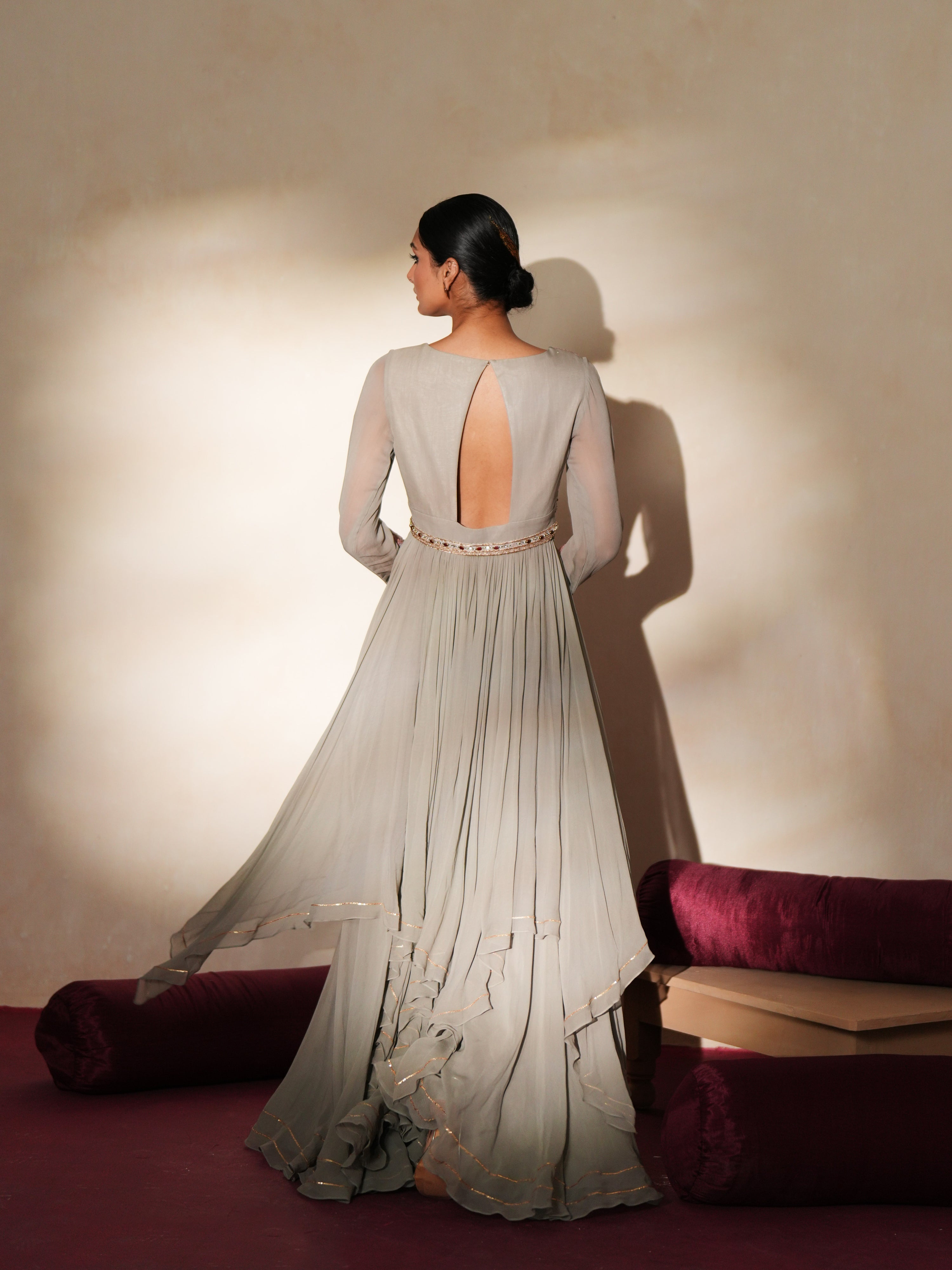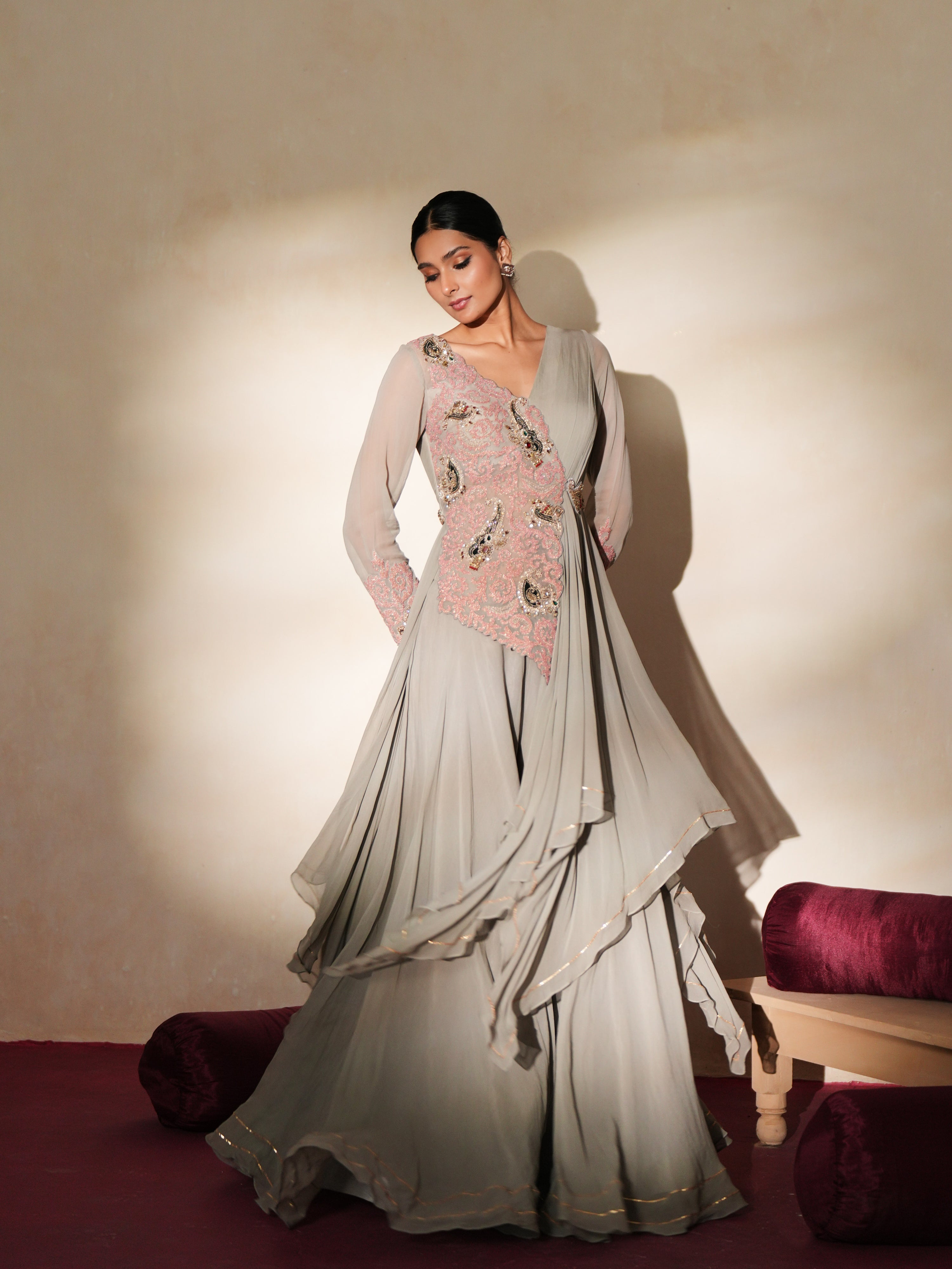 "An ode to quiet opulence,Chamak radiates contemporary royalty through intricate craftsmanship and fluid design. The metallic grey layered sharara set features an asymmetric draped jacket kurta and flared sharara, both crafted in flowy georgette and embellished with dori-marodi and gota embroidery. Jeweled 3D motifs lend a sculptural shimmer, while the gota-embellished hemline adds movement and light.