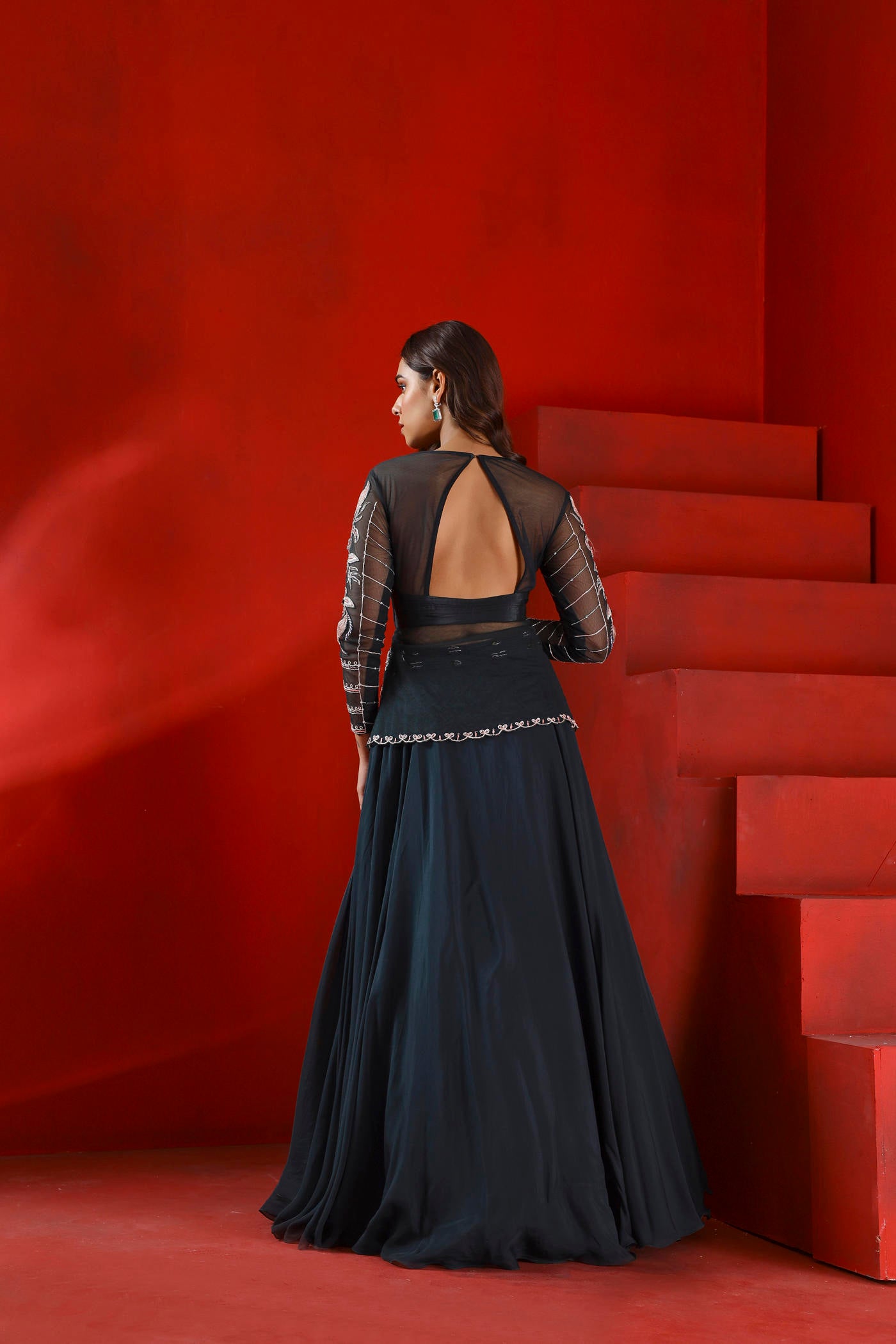 Featured here is a midnight green embroidered peplum jacket made in net. It is paired with a layered lehenga made of organza and silk