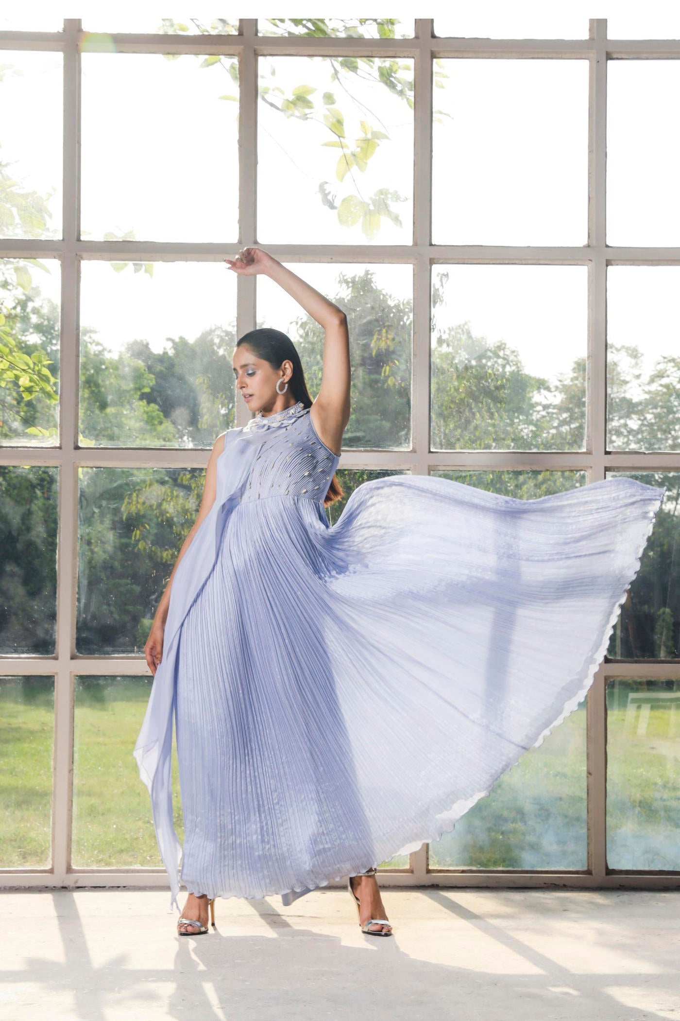 Featured here is periwinkle chiffon gown with corded and embroidered yoke. It is paired with an embroidered collar drape cape