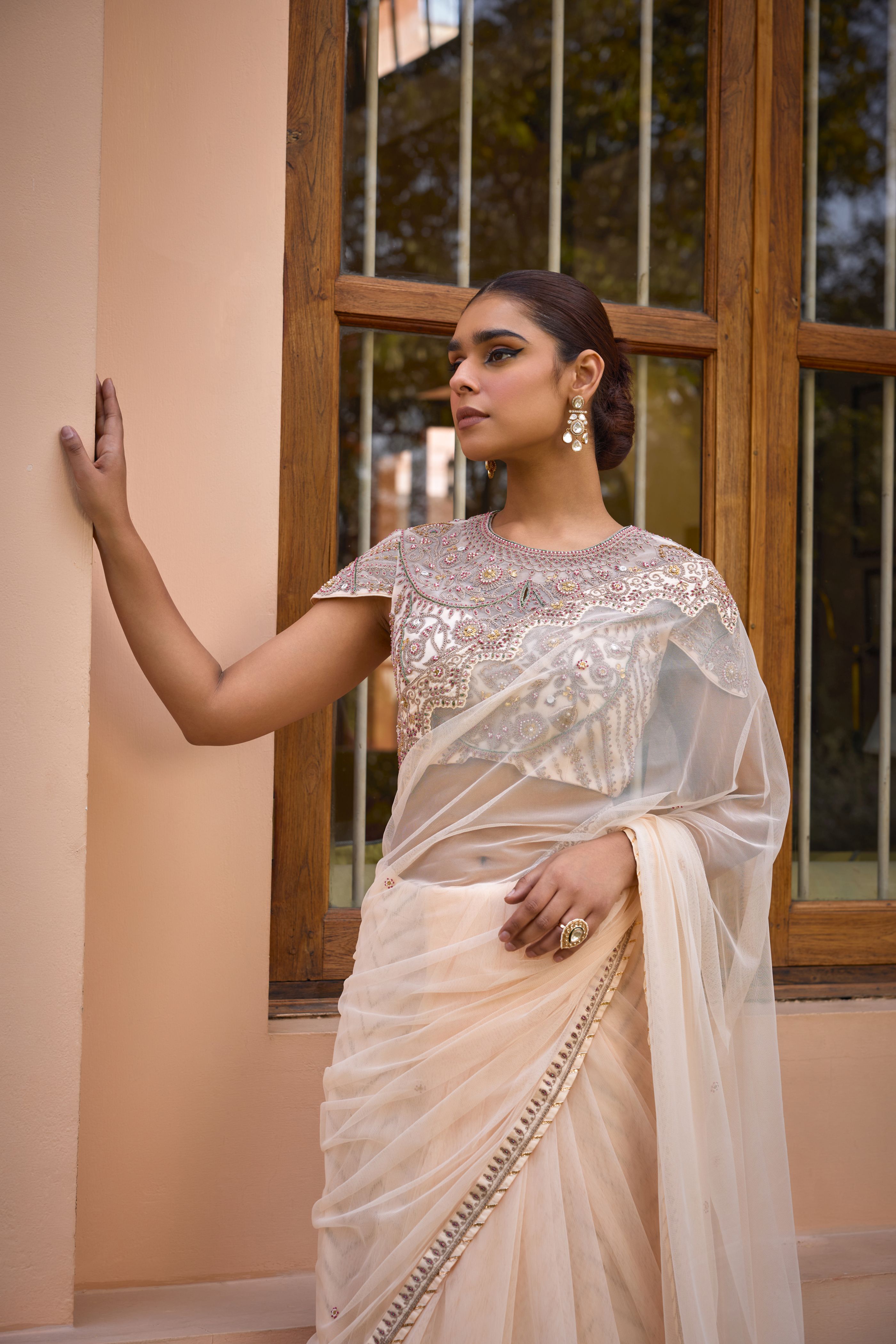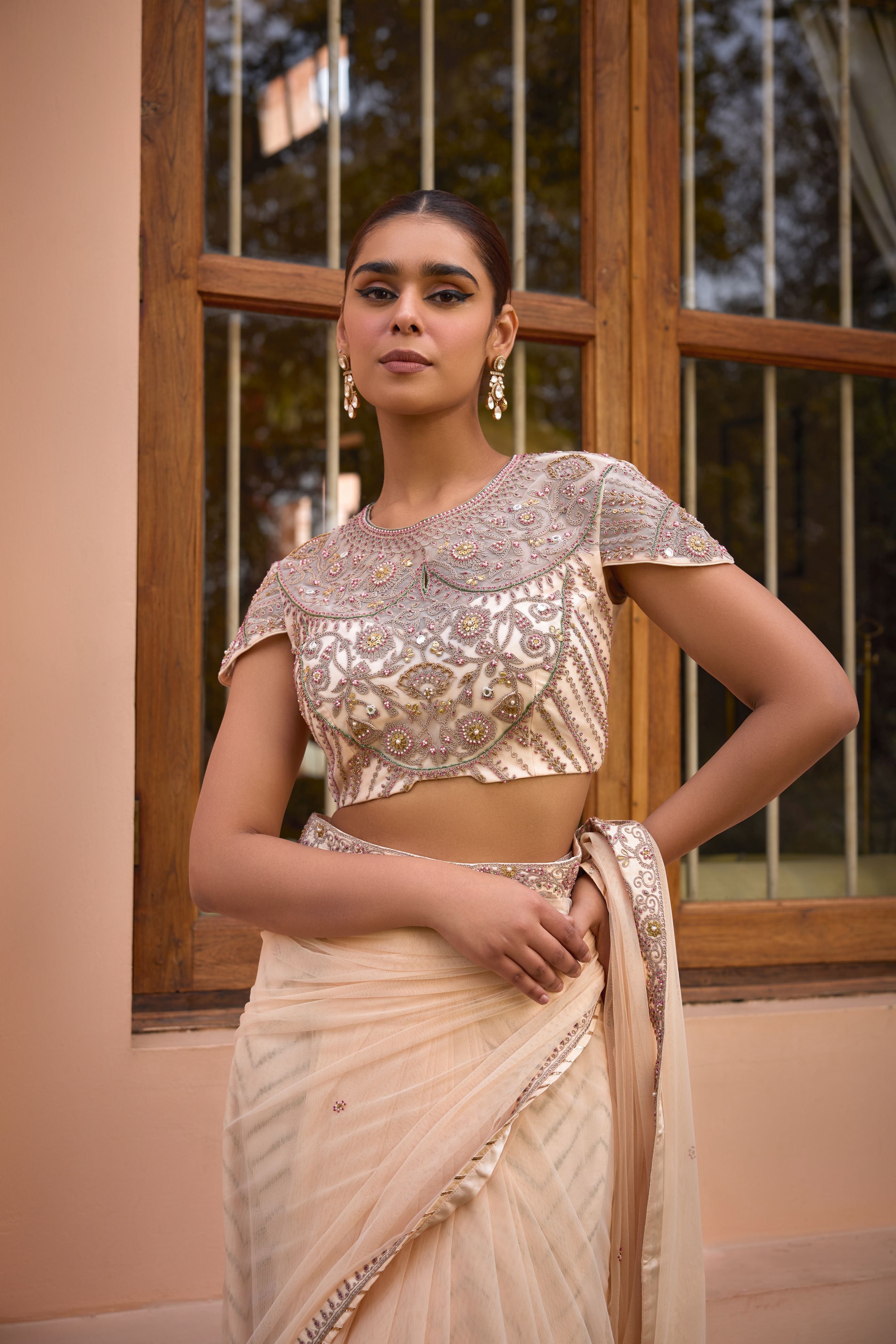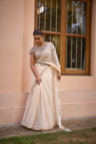 This timeless six yards Saree is handcrafted using intricate tilla work on soft tulle for a comfortable and breathable look. Featuring intricate hand embroidered blouse, this saree includes a chanderi jacquard skirt that is perfect to create a stylish look.