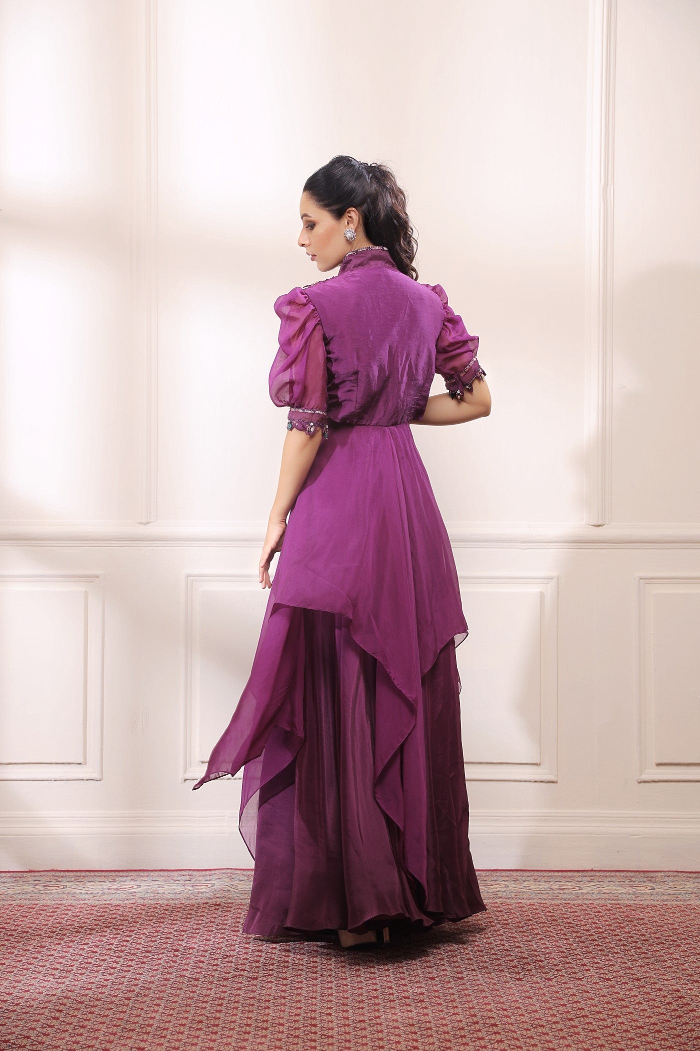 Jewelled embellished kurta features organza puffed sleeves and asymmetric organza flare.
