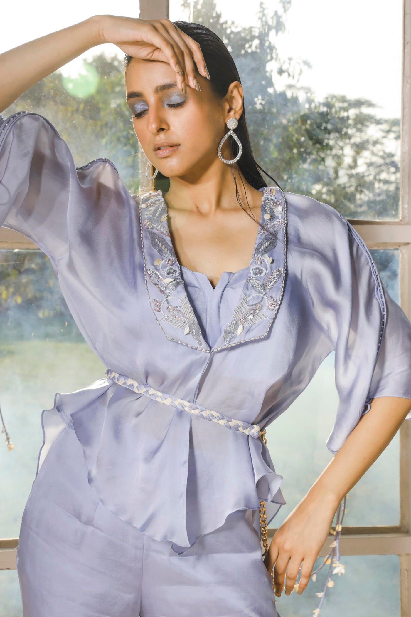 Featuring periwinkle top set made in organza silk. This set includes an embroidered collar kimono top a bustier and a hand braided belt.