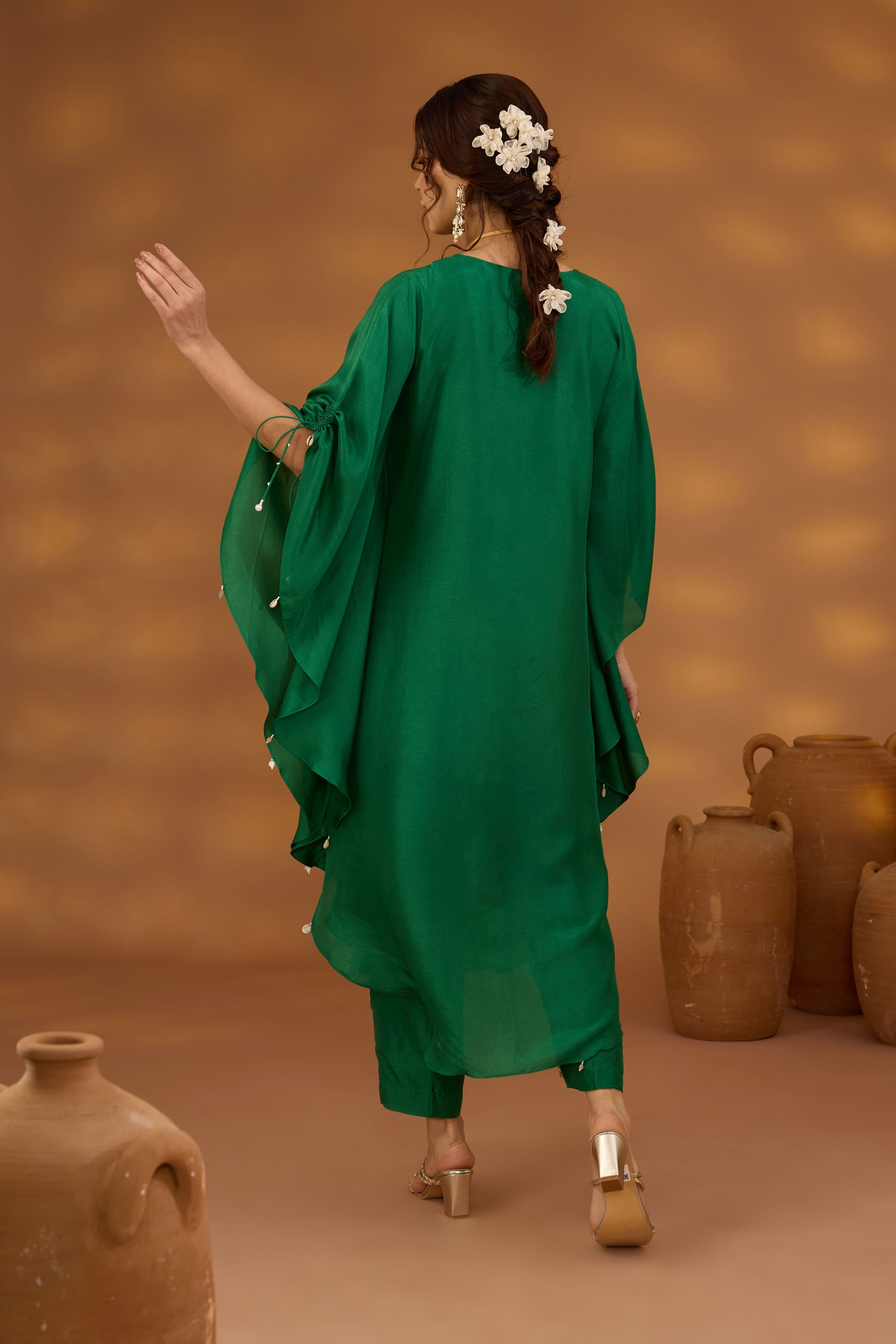 Featured here is jewel toned green kaftan kurta crafted in silk for a flowy look. This piece features intricately hand embroidered artwork of the divine Nandi. It is paired with silk pants. this set brings a touch of spirituality and artistry to your wardrobe.