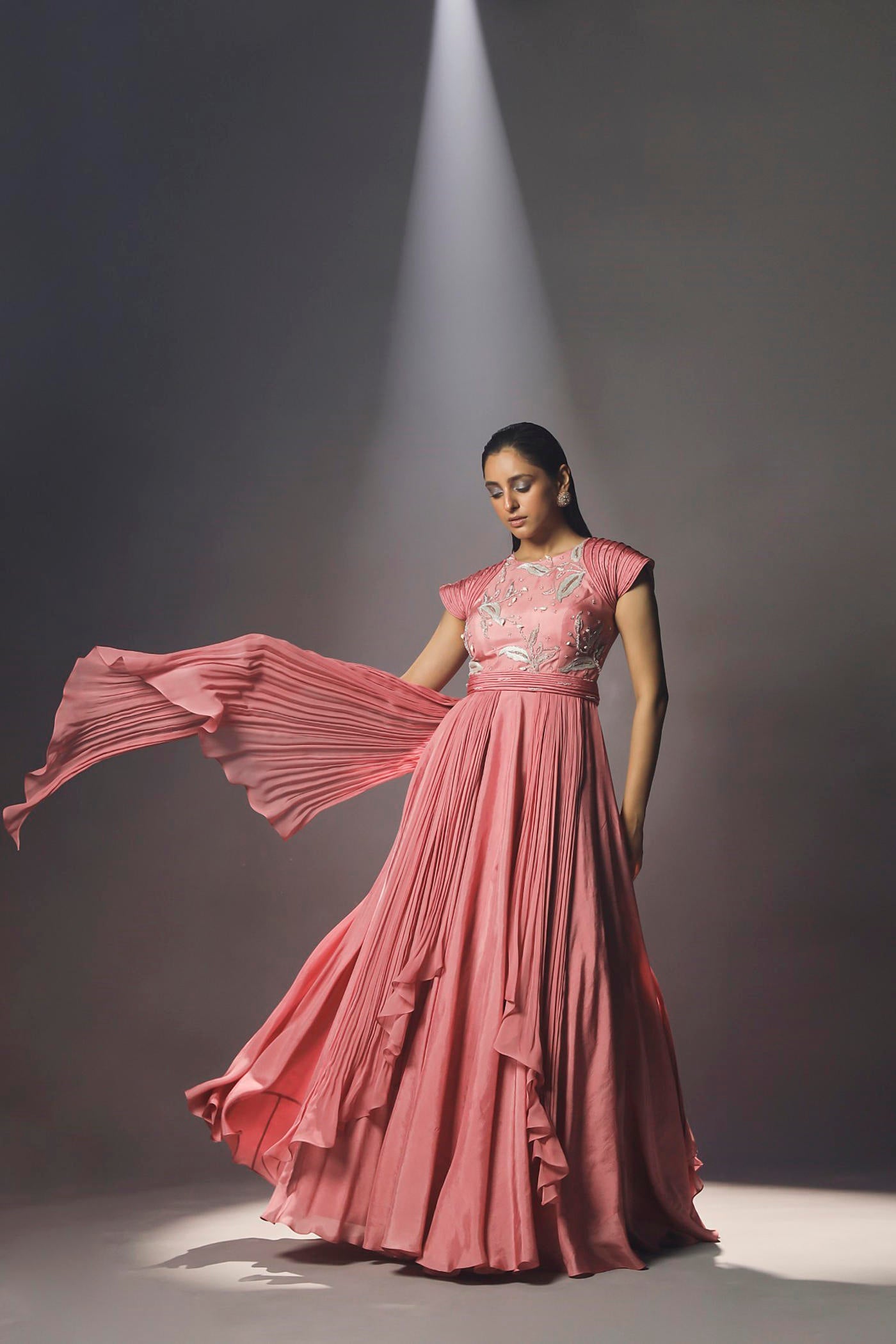 Featured here is cashmere rose pink anarakali with multiple panels and embroidered yoke. It is paired with and embroidered net dupatta.