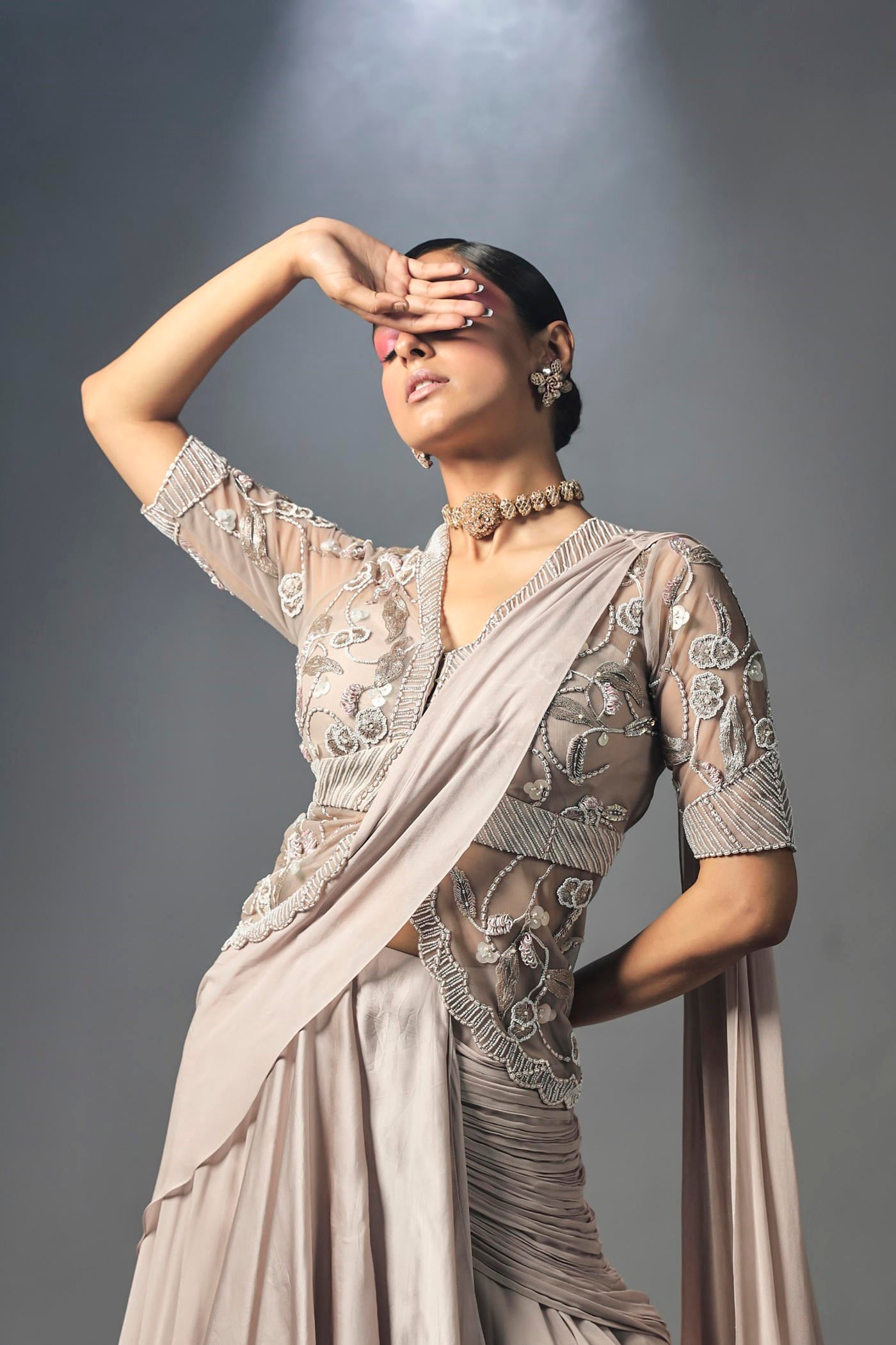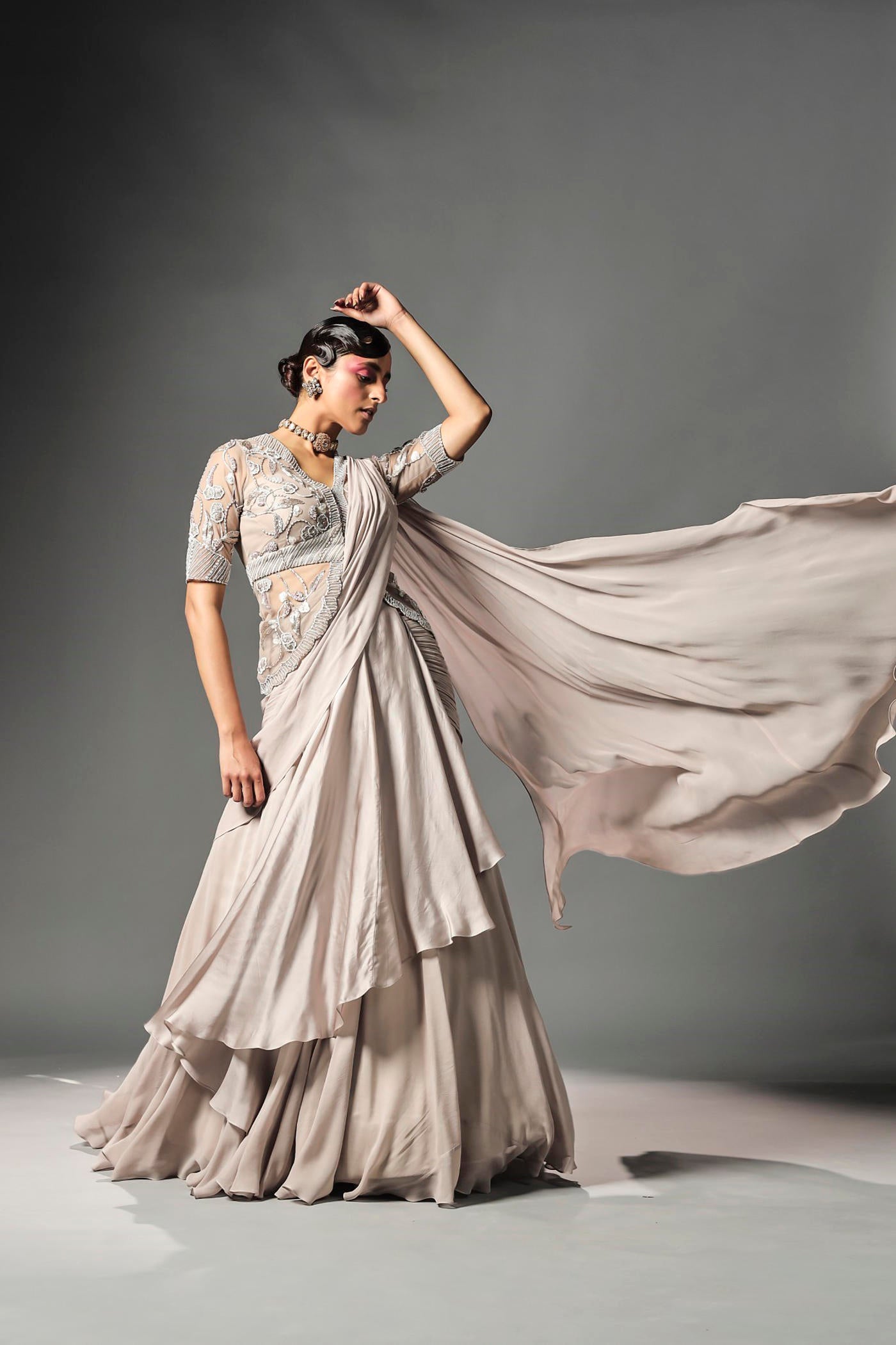 Featured here is Ecru pre stitched drape saree with double layered asymmetric flair. It is paired with an intricately embroidered jacket top