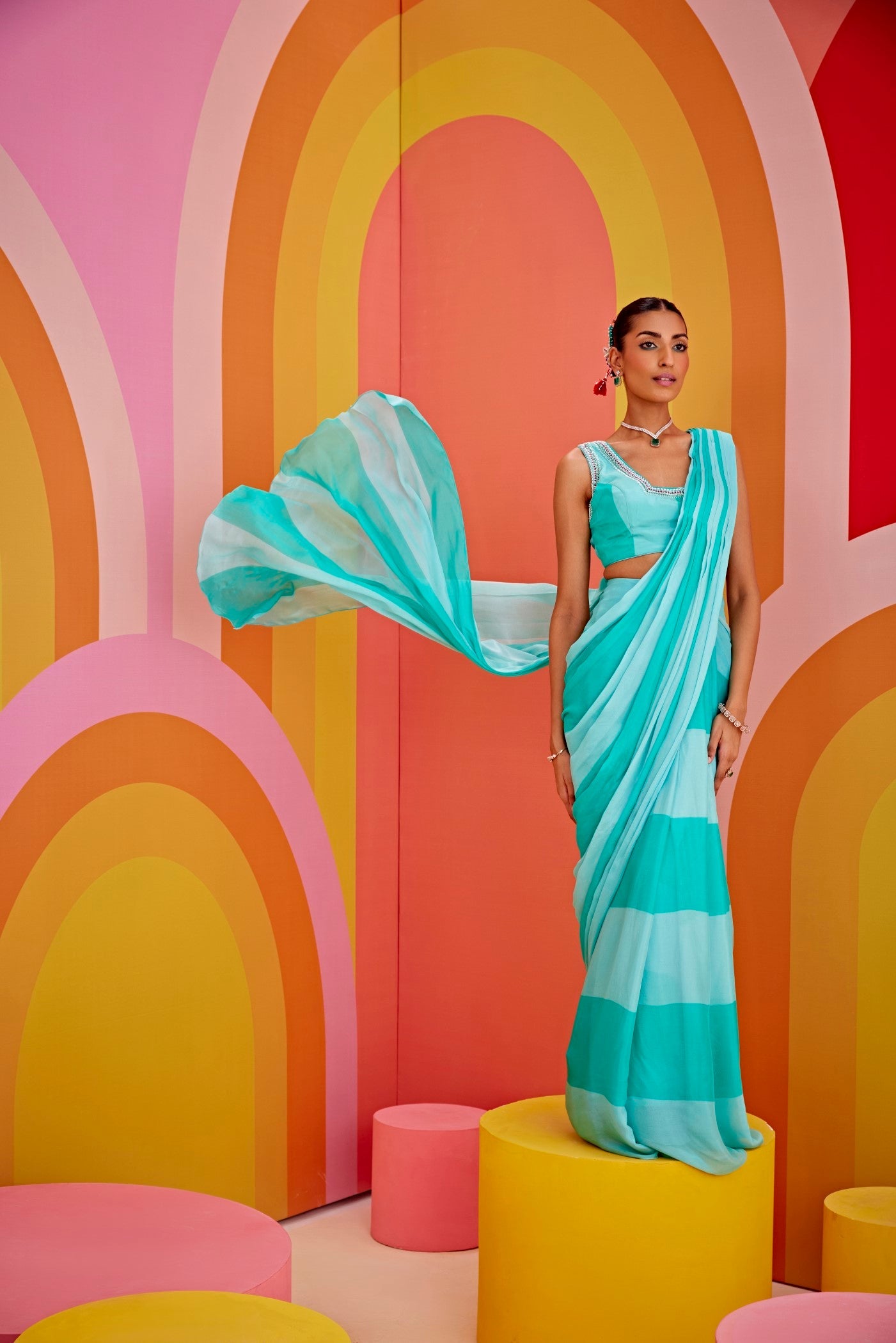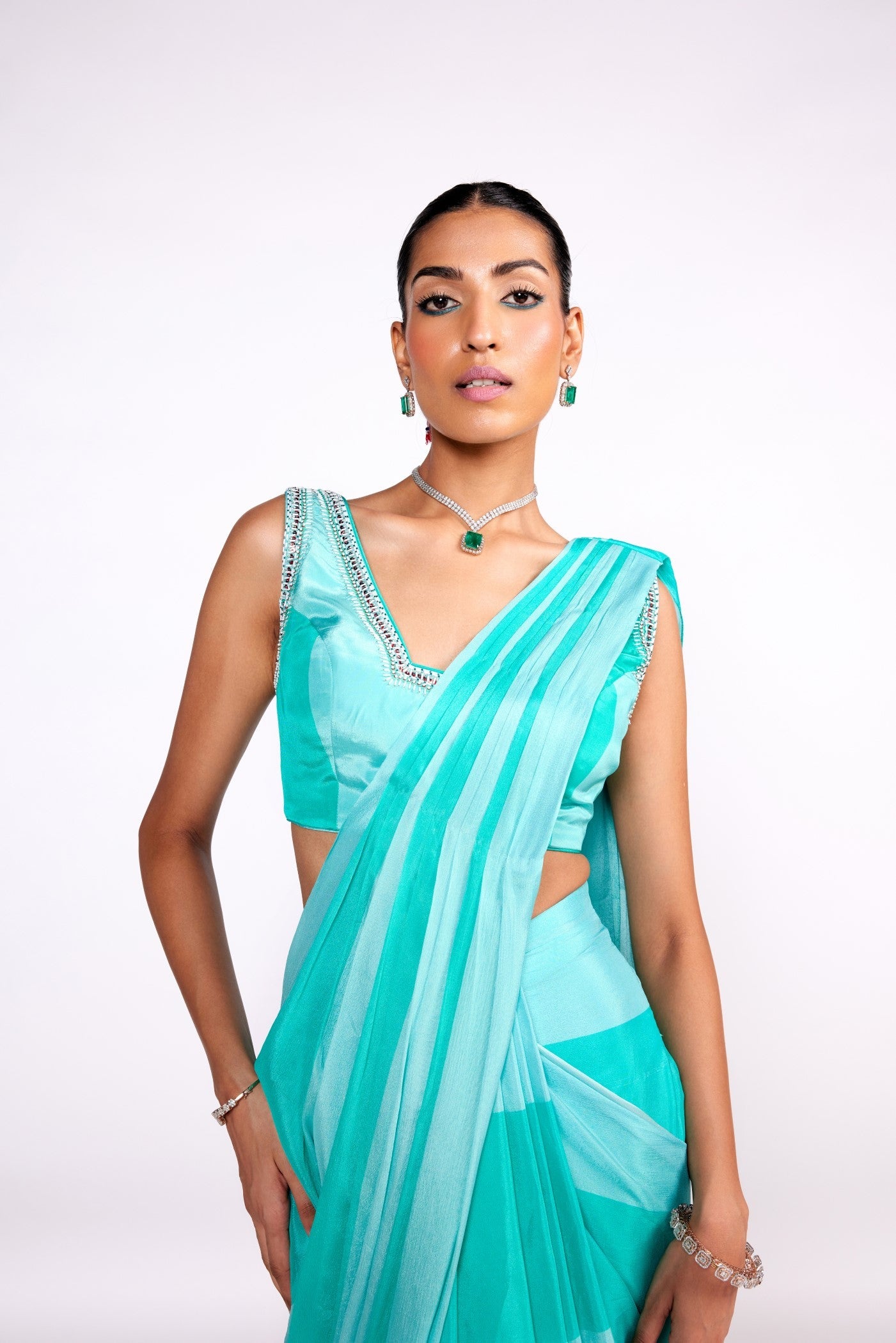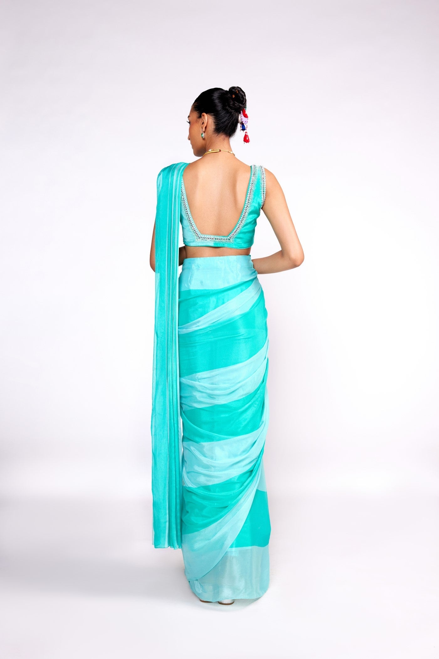 Aqua green color block drape saree