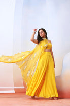 Featured here is yellow sharara pant set made in crepe. It is paired with a detachable chiffon printed and embroidred drape cape.
