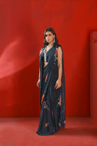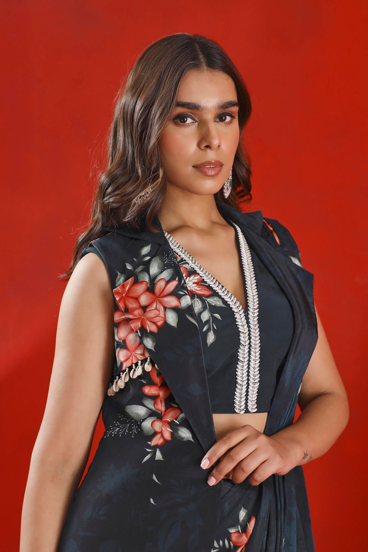 Featured here is a midnight green printed sleeveless trench coat made in silk