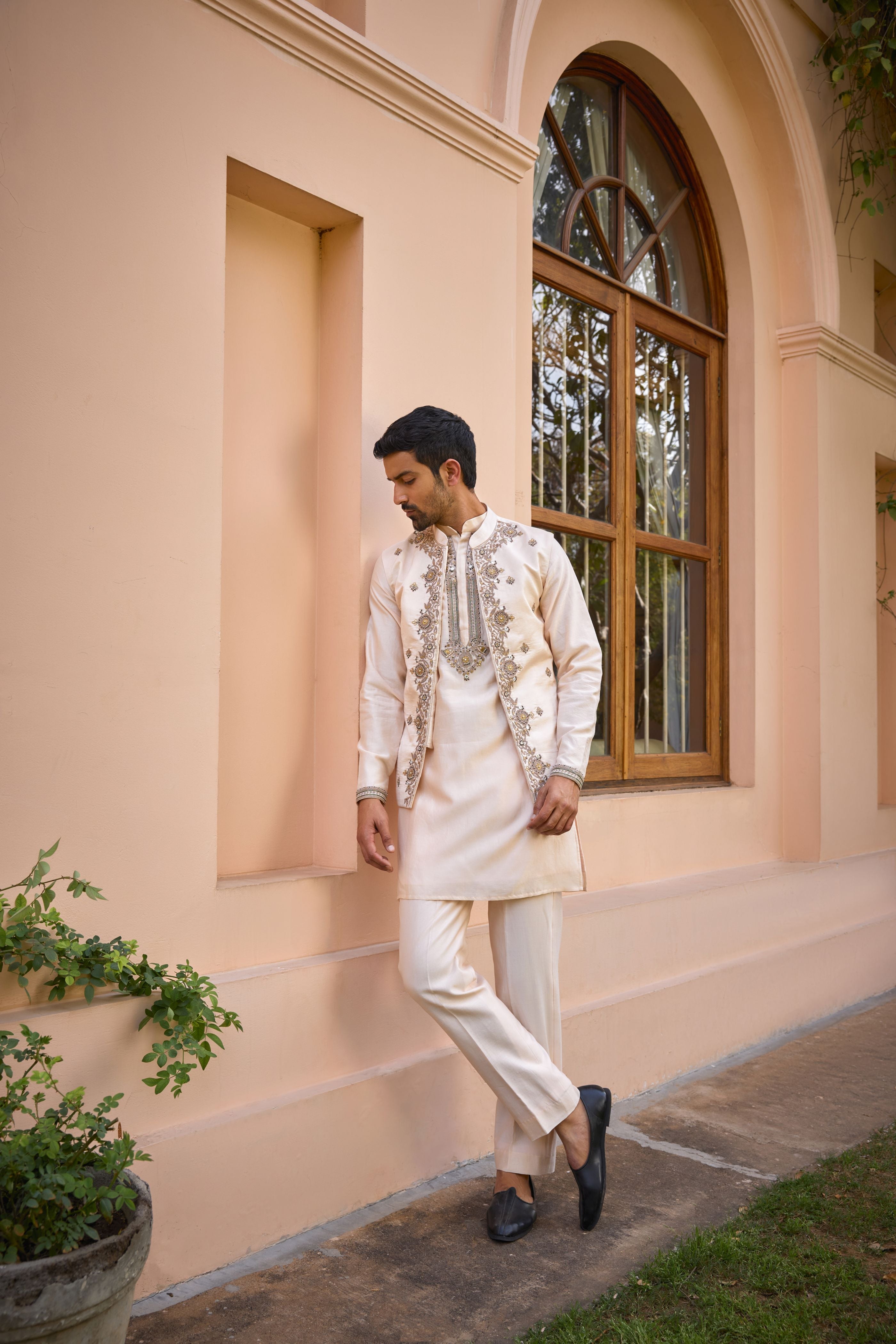 Featuring a contemporary yet traditional bundi jacket set. All made in pure chanderi silk. Kurta and jacket are embroidered with subtle dori marodi and zardozi work. Ace the any occasion or wedding look with this graceful look