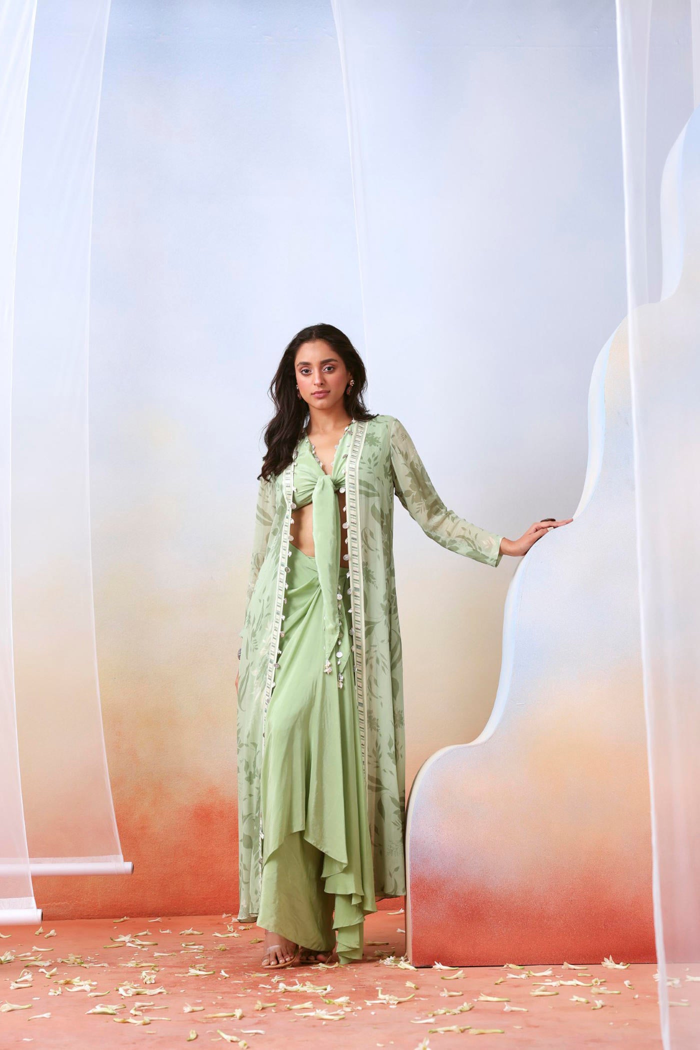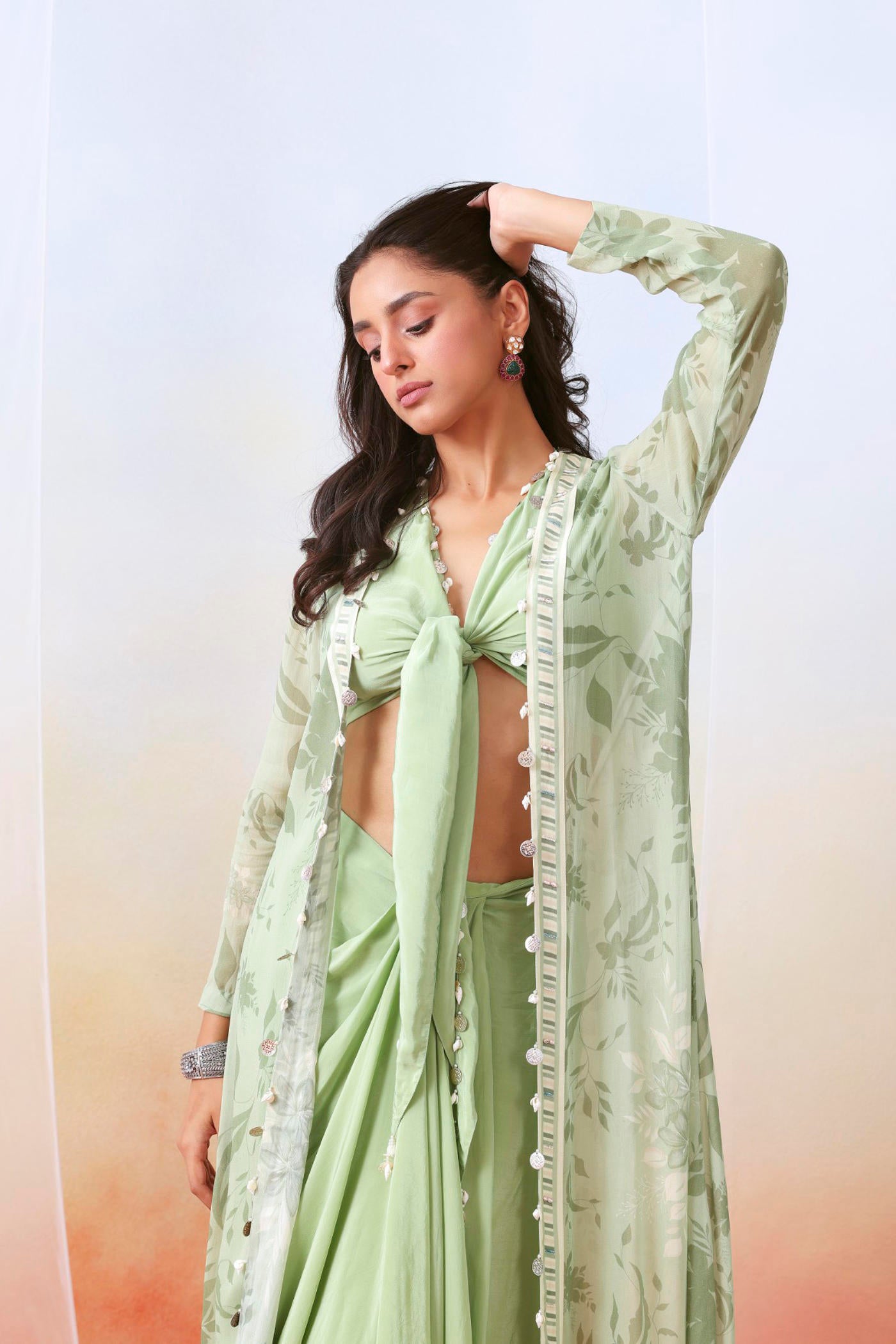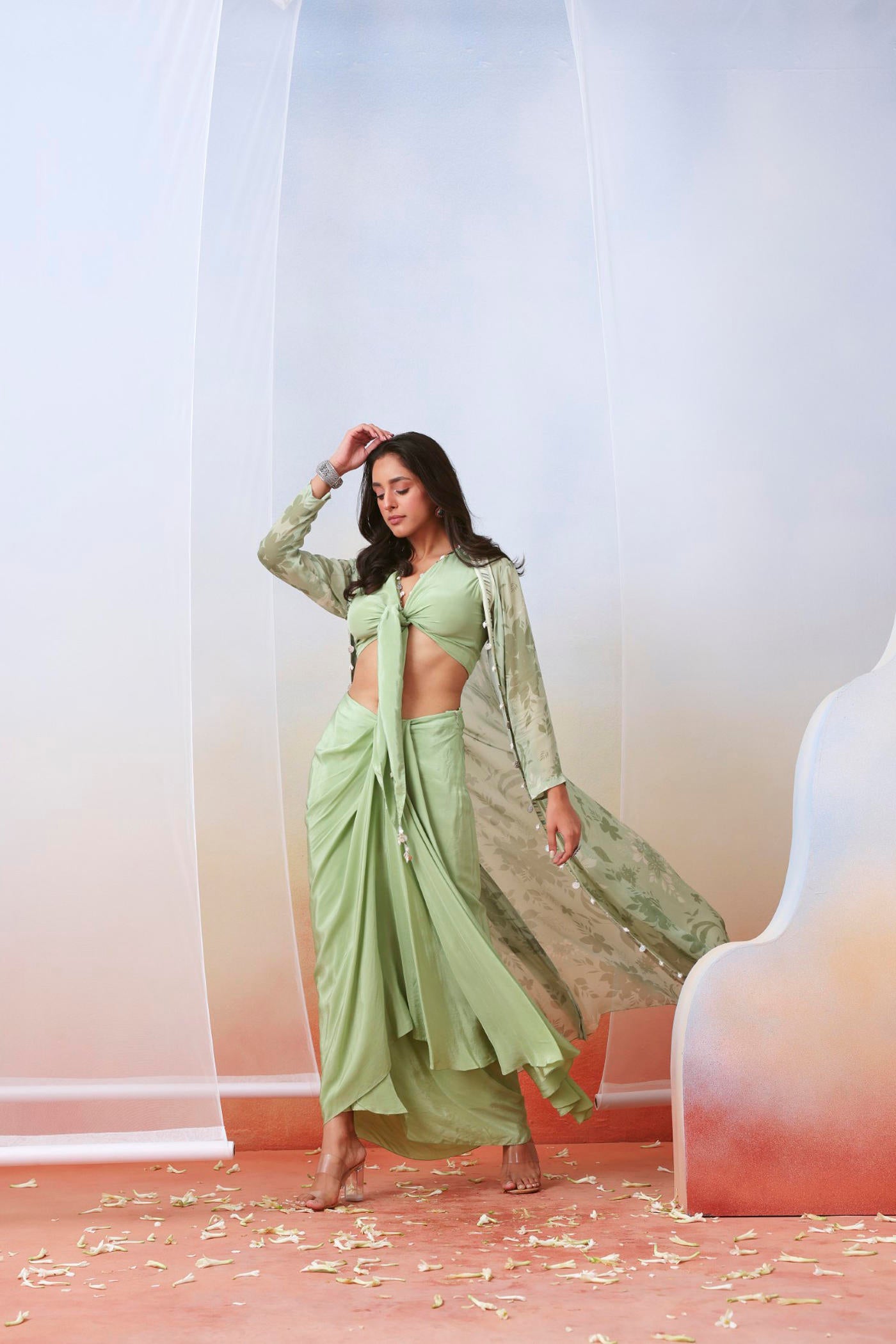 Featured here is sage green drape skirt and front tie top made in crepe. To complete the look it is paired with an embroidered cape jacket made in georgette.