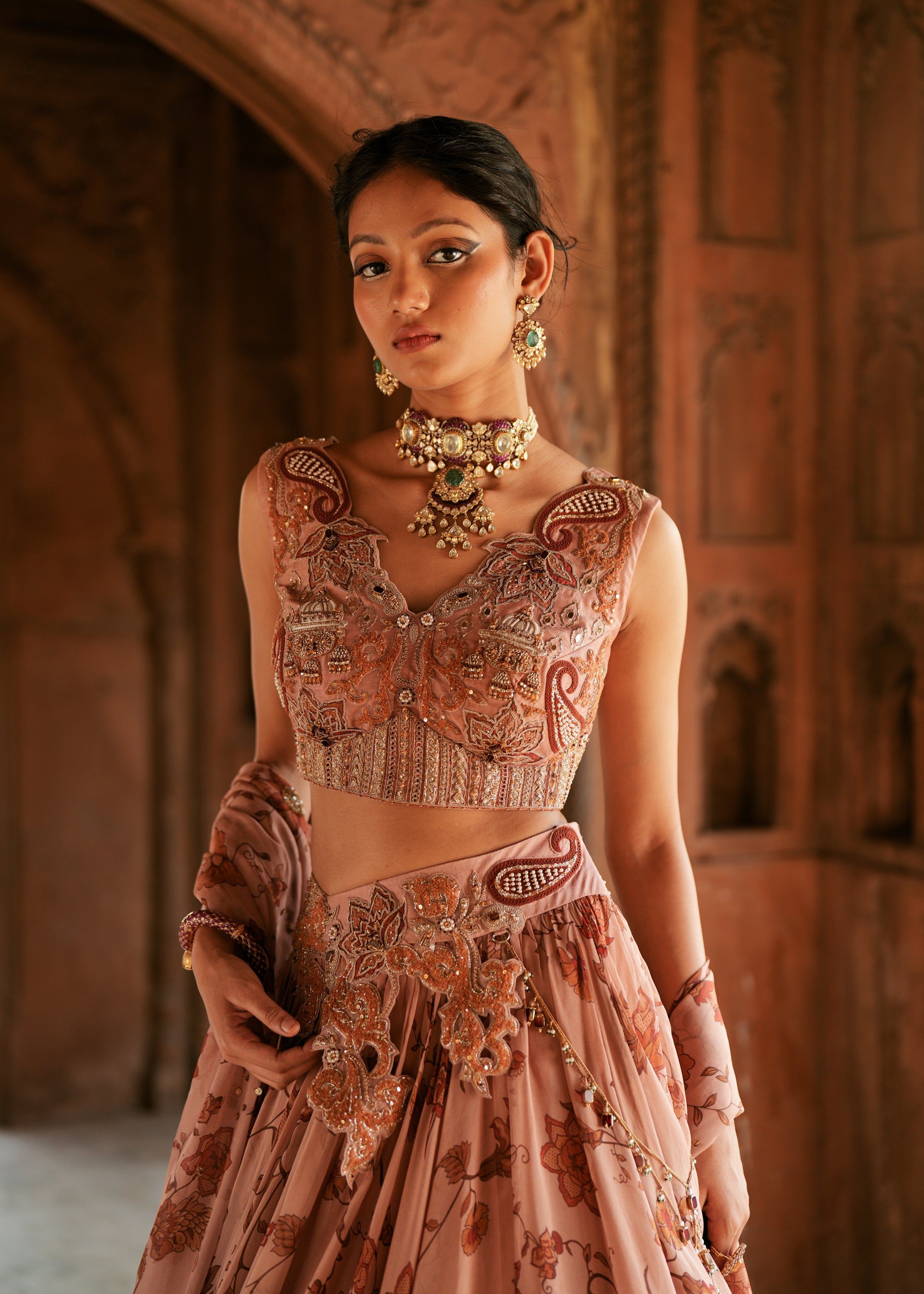 This festive pink organza lehenga is brought to life with delicate floral prints and intricate embroidery. Paired with a silk blouse adorned with dori and zardozi work, the look is elevated by a handcrafted kamarbund featuring fine cutwork that beautifully defines the waist. Finished with an embroidered organza dupatta, this ensemble is perfect for haldi, mehendi, sangeet, and modern Indian wedding festivities.