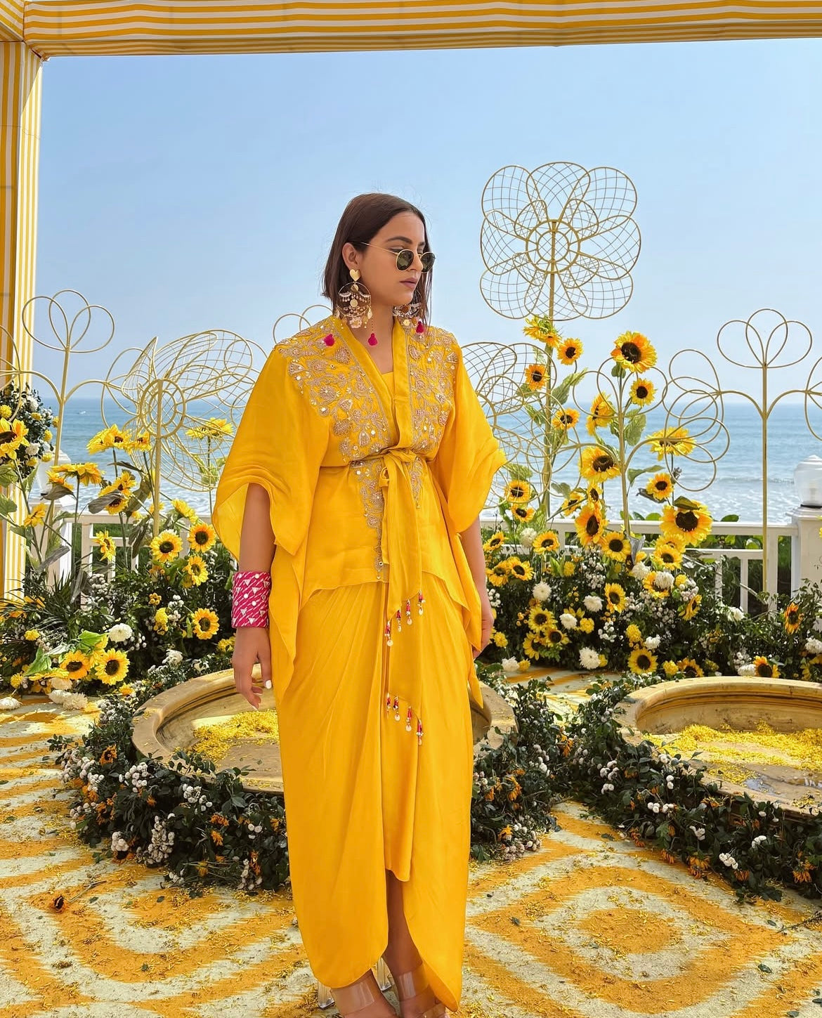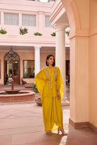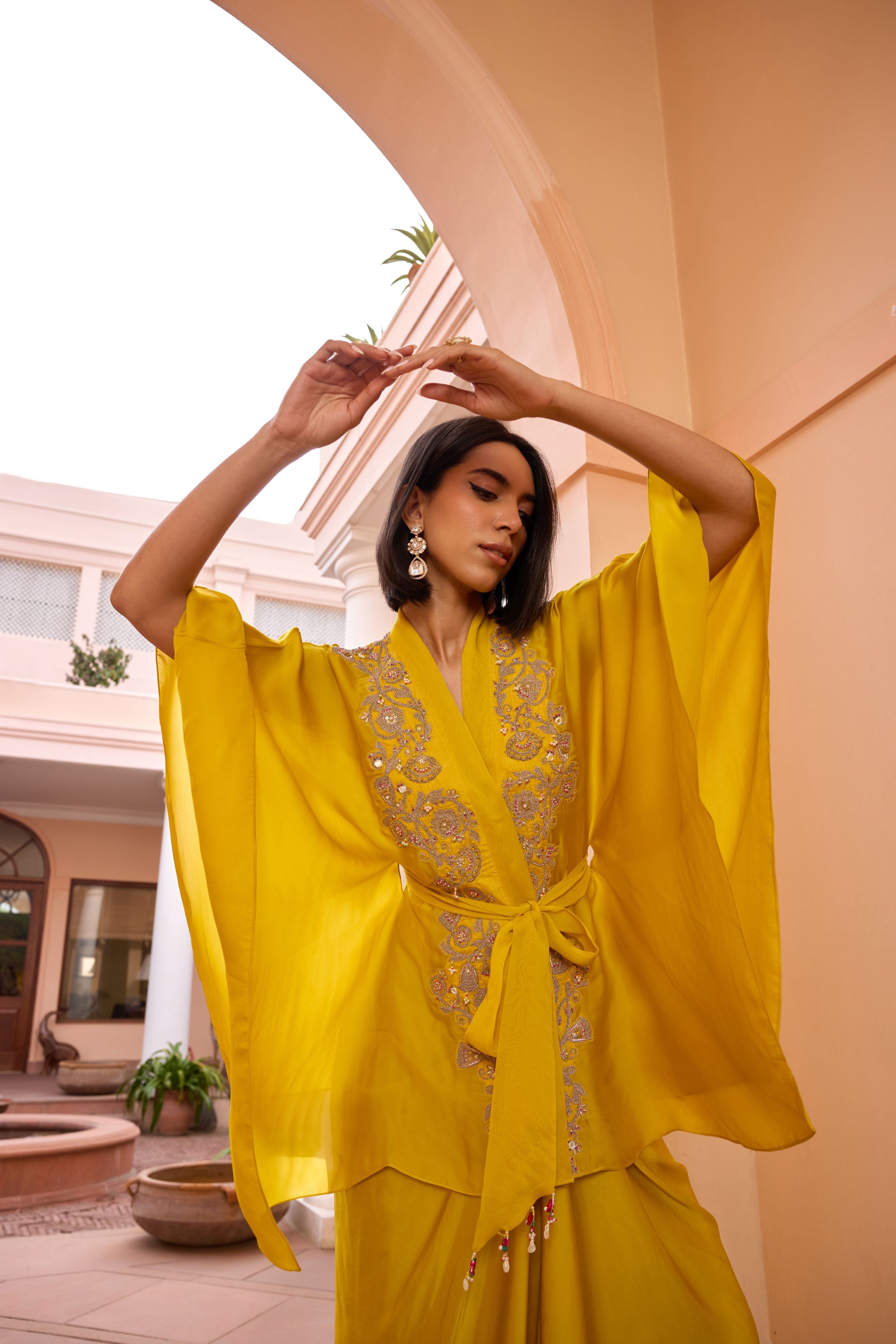 Featuring a timeless Flowy free size kimono top made in satin organza and embroidered with tilla work, pearls, gota work and brass beads. It is paired with a draped skirt and bustier made in satin. A free size organza tasseled belt completes this effortless festive look