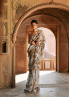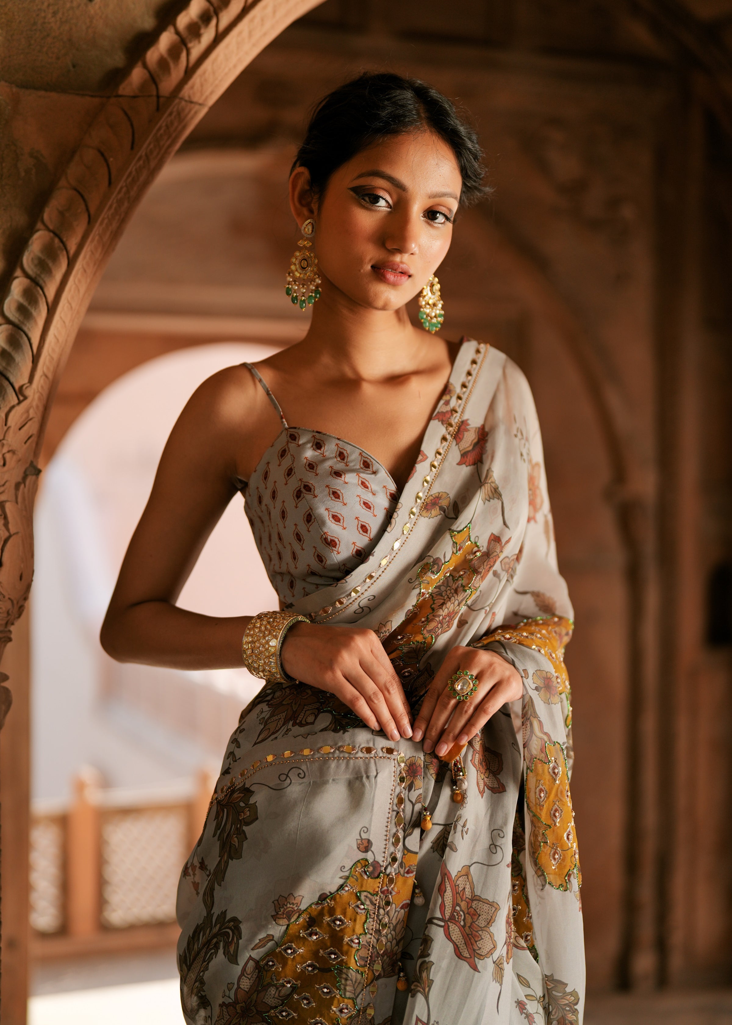"Embrace the art of timeless beauty with this classic six-yard saree, where grey floral prints meet intricate embroidery featuring zardozi, pitta, and sparkling mirror work. The ensemble is elevated by a luxurious Chanderi silk blouse and a perfectly matched petticoat, creating a graceful look ideal for haldi, mehendi, sangeet, or carnival celebrations.