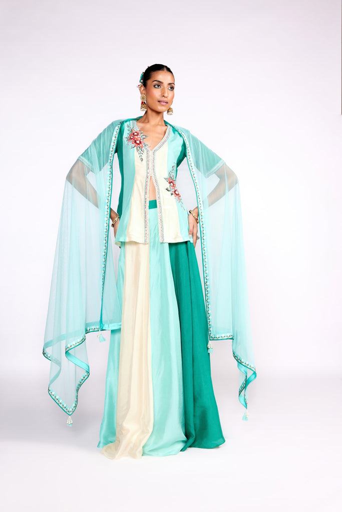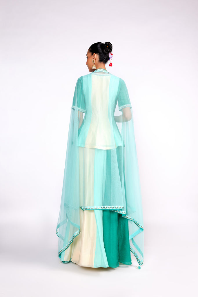 This set features an aqua green color block peplum top and skirt both made in silk and encrusted with 3D embroidered florals. It is paired with a net dupatta to complete the look.
