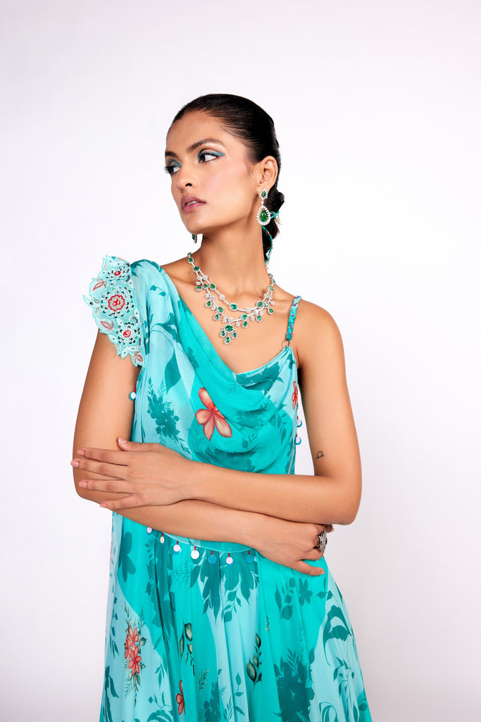 This set features an aqua green drape jumpsuit with an attached dupatta and embroidery highlights on drape. All made in georgette