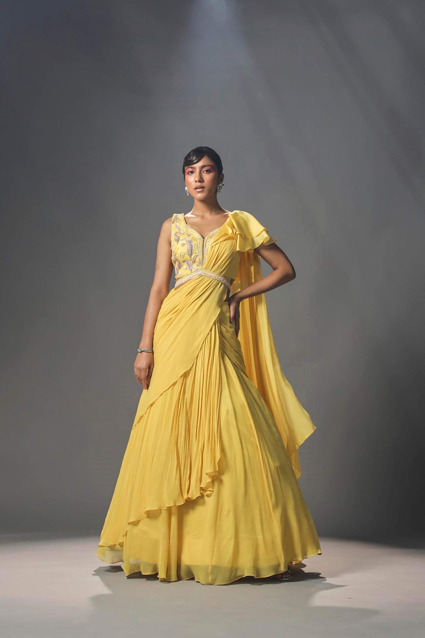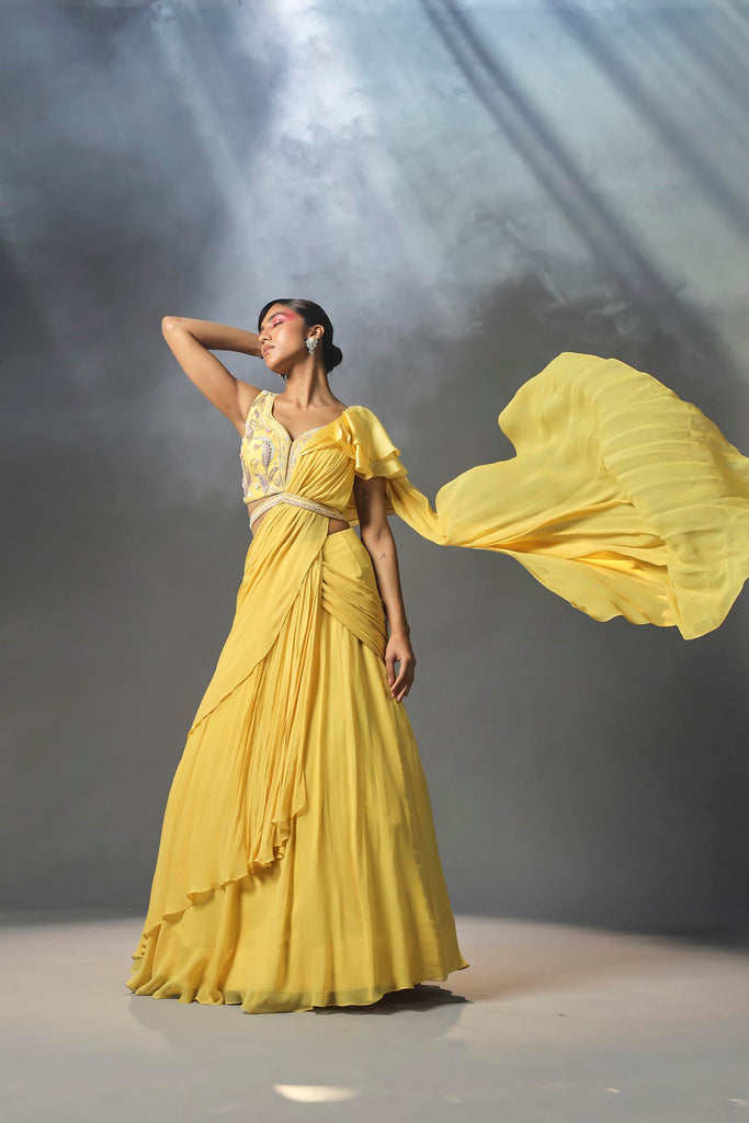 Featured here is daffodil yellow pre stitched saree made in georgette and organza. It is paired with intricately embroidered blouse