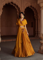 Bright, breezy, and beautifully festive — this golden yellow lehenga set features a printed Chanderi silk skirt with a placement dori and 3D embroidered waistline that adds structure and shimmer. It’s paired with a flowy organza top, designed with soft drapes and detailed embroidery for effortless elegance. Perfect for festive gatherings, intimate celebrations, and wedding festivities.